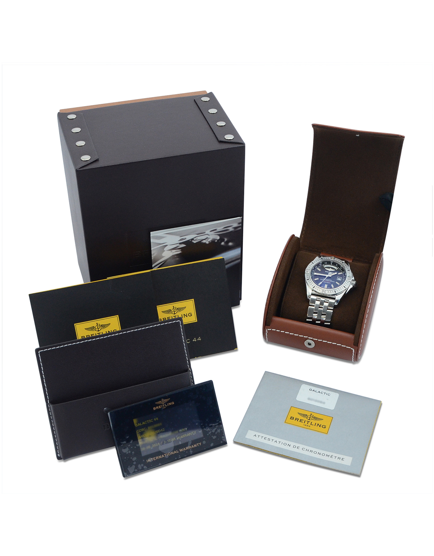 This watch is supplied as shown in the detailed images with the original Breitling outer box sleeve, the original Breitling inner and outer boxes, the original Breitling watch holder, the original Breitling Galactic 44 instruction manual, the original Breitling Chronometer certificate, the original Breitling warranty booklet, the original Breitling booklet & warranty card holder and the original Breitling digital warranty card dated May 2016 when first supplied new by the authorised dealer in the UK.