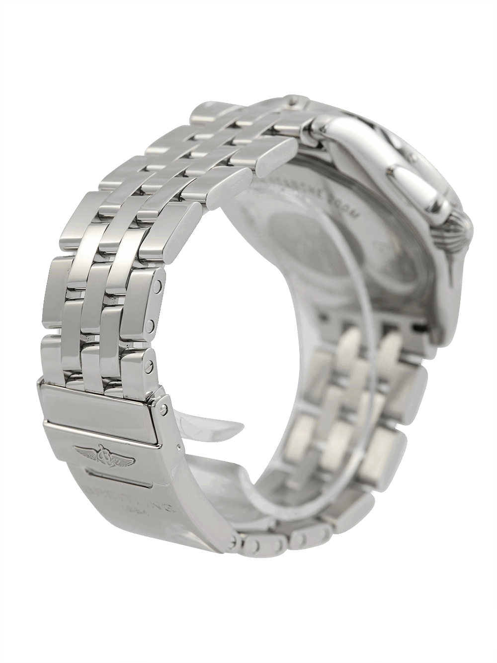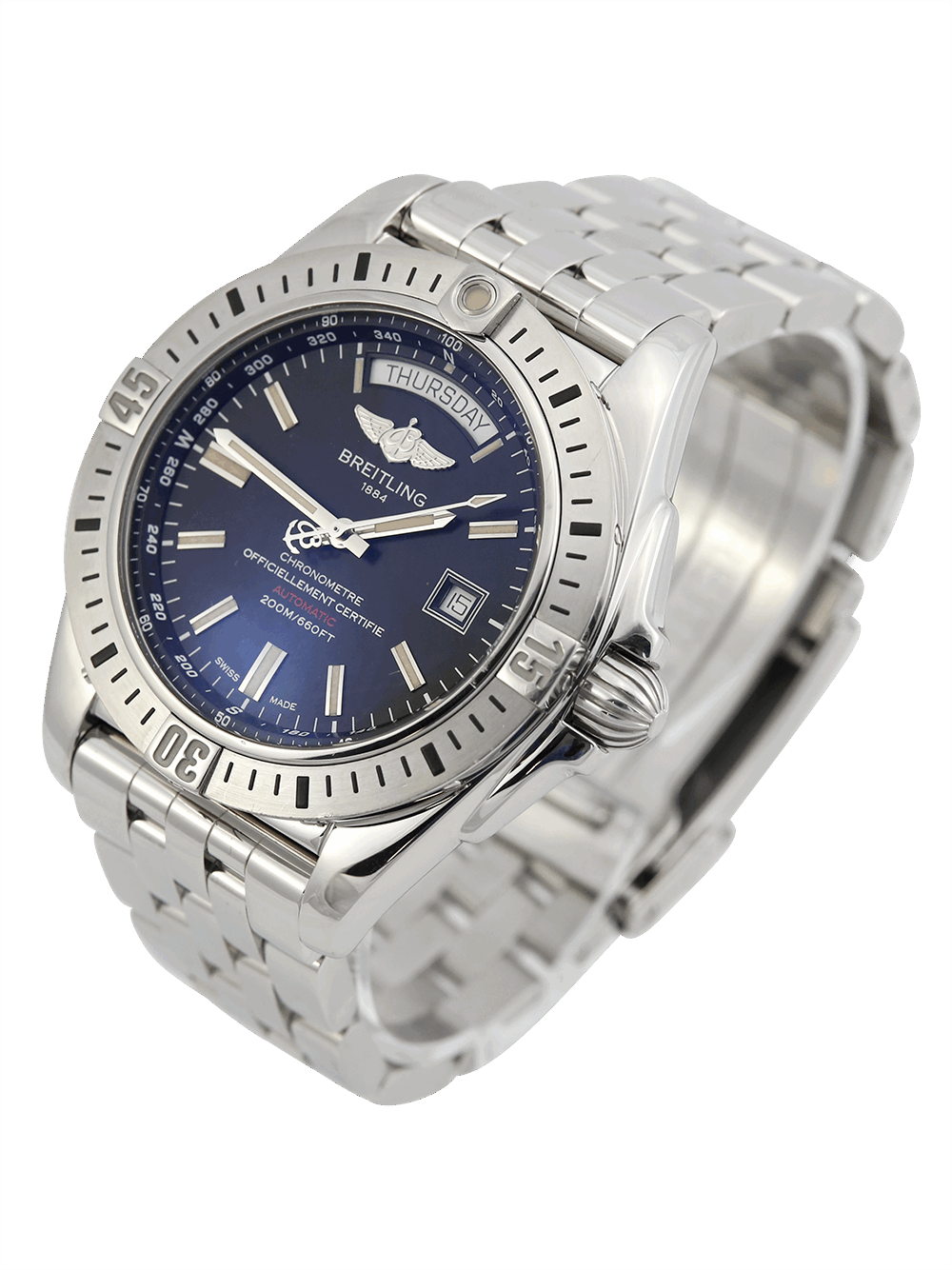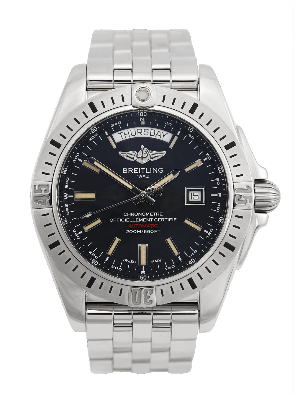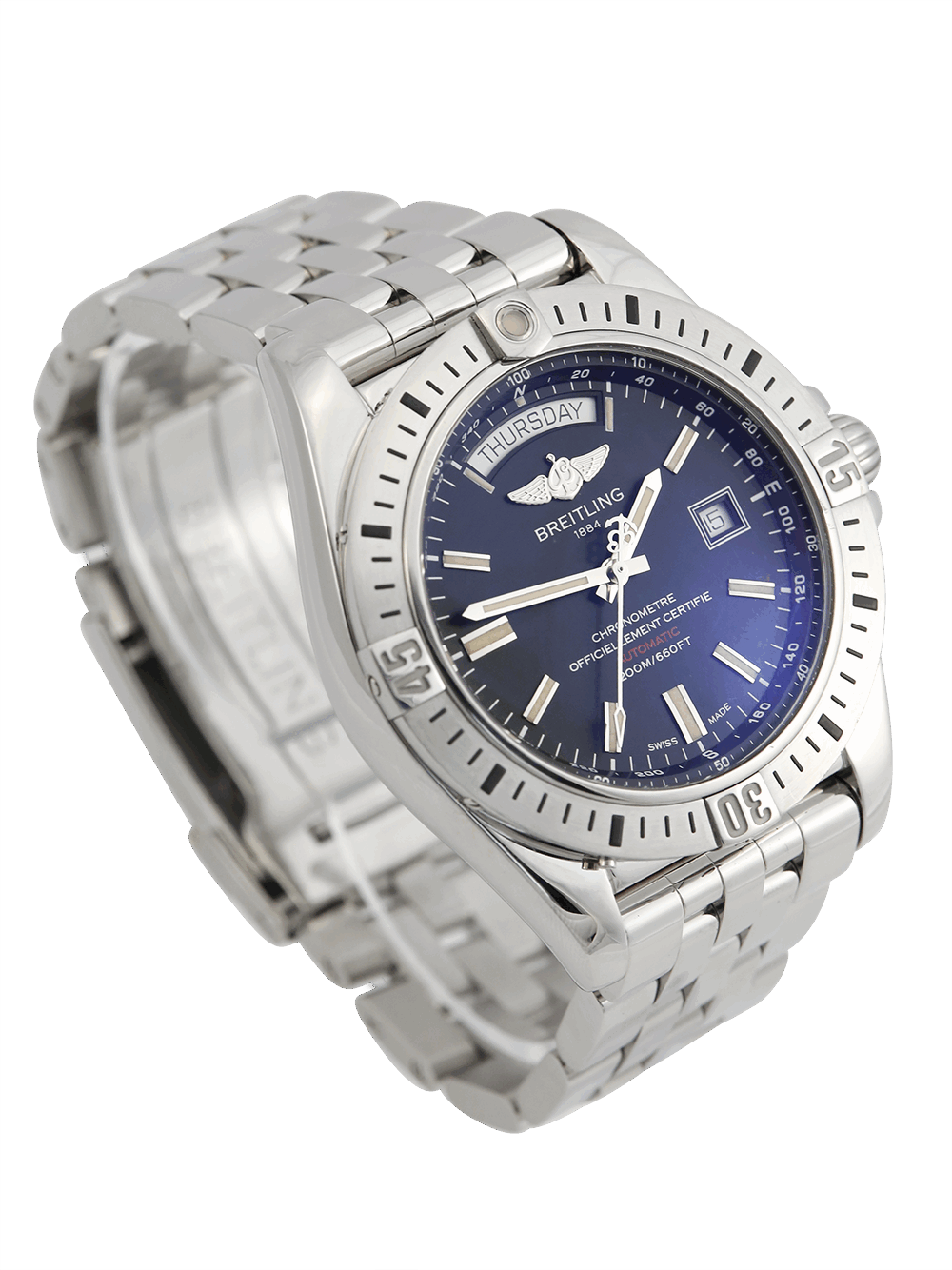 A pre-owned in pristine condition stainless steel chronometer certified automatic 44mm case size Breitling Galactic 44 model reference A45320B9/BD42/375A featuring a black baton dial housing a date aperture at 3 O’clock and a day aperture at 12 O’clock surrounded by a stainless steel 60-minute bezel. This particular watch comes on a full retail length stainless steel Breitling Pilot bracelet.