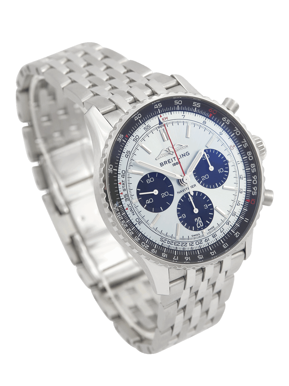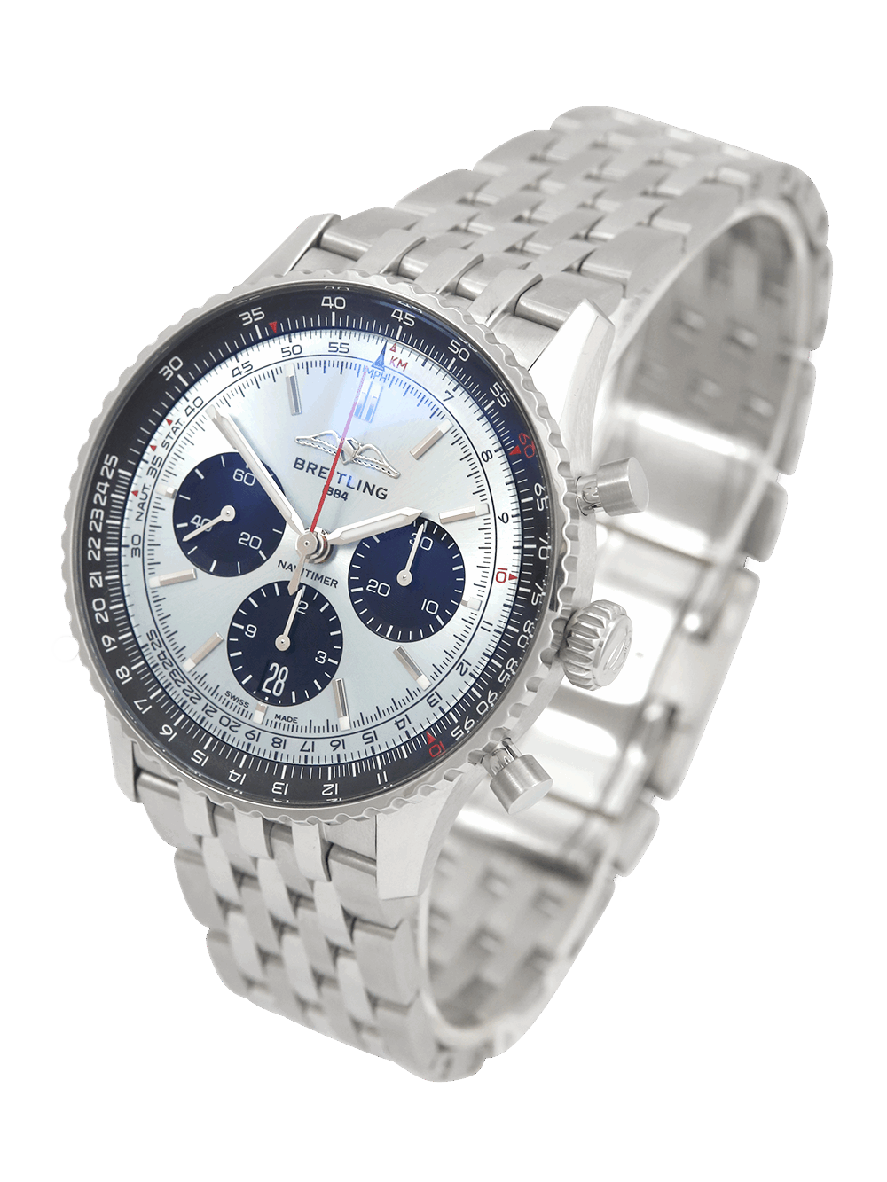 A pre-owned in prisitne cosmetic condition Breitling Navitimer model reference AB0138241C1A1 43mm case sized stainless steel wrist watch which is powered a Breitling 01 calibre movement housing a striking blue dial which captures attention through traditional Navitimer details including baton indexes and three chronograph counters, alongside polished hands and a notched bezel for easy grip.