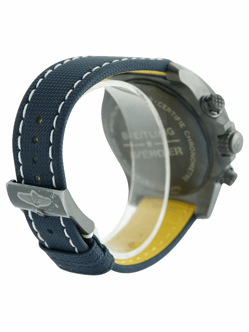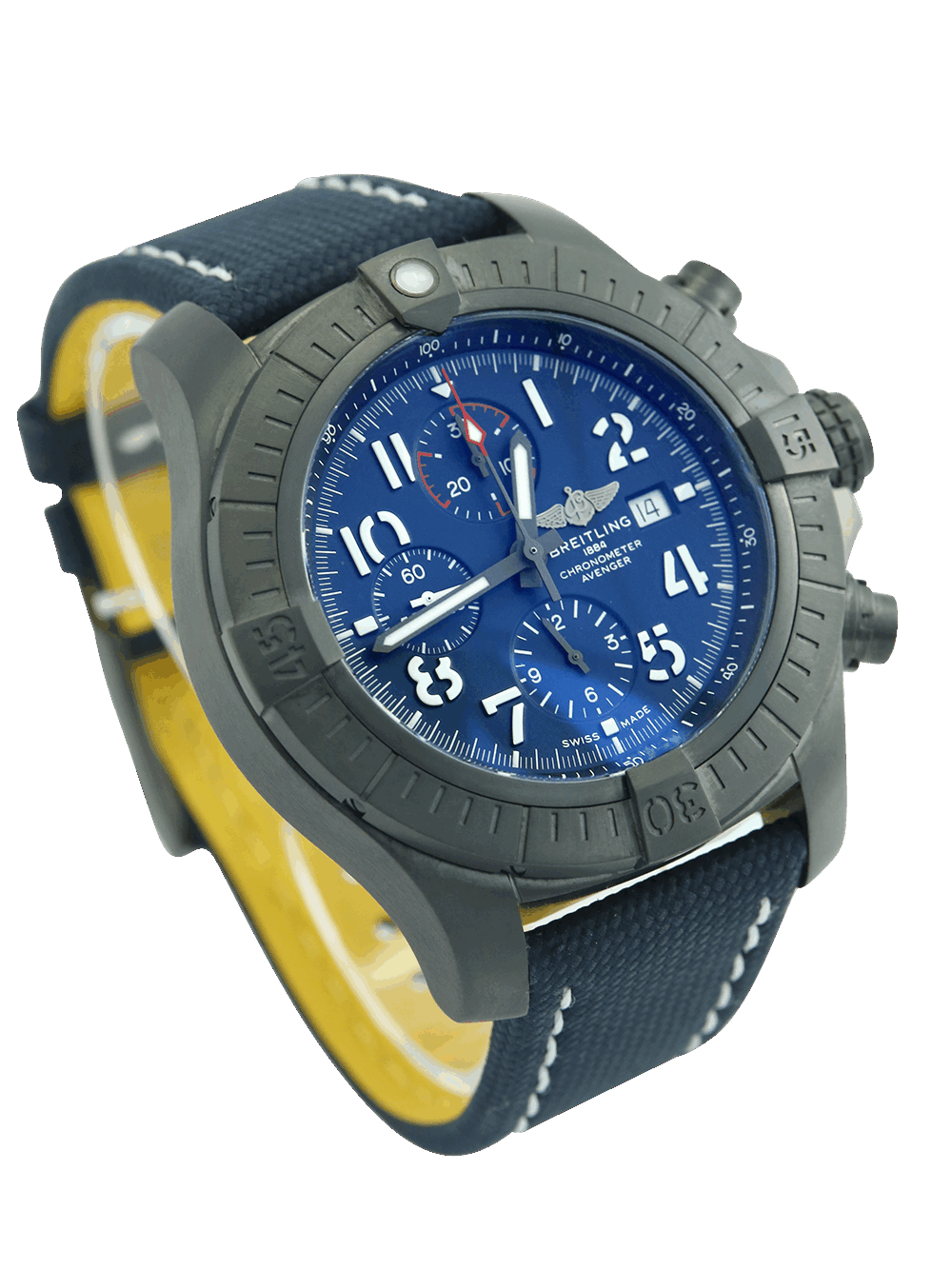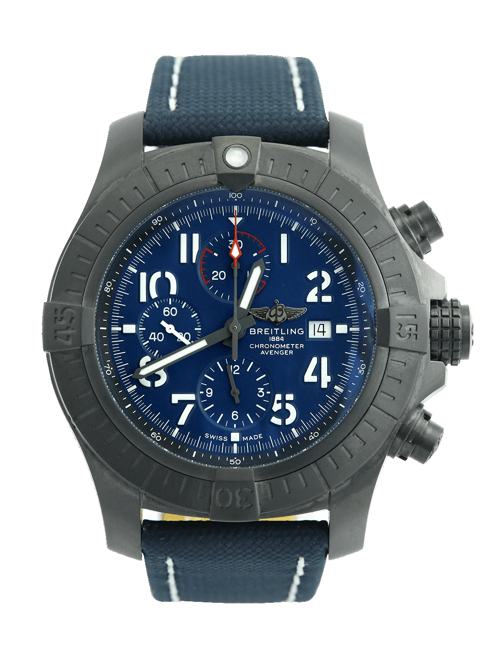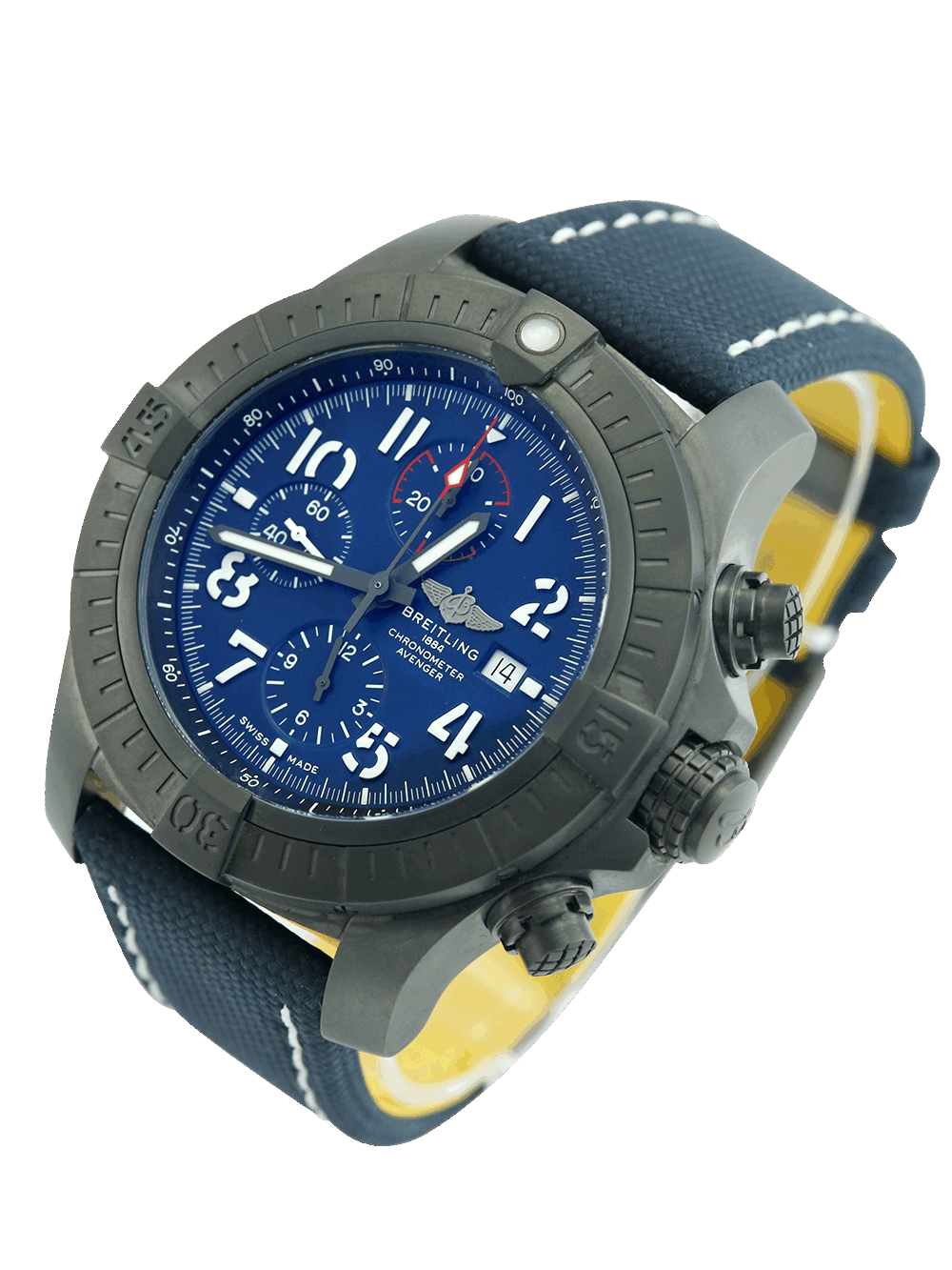 As a true Breitling Avenger, it can be used wearing gloves and offers unrivalled safety and reliability to any airborne adventurer. The Night Mission interpretation of the Super Avenger Chronograph 48 features a sturdy oversized 48mm DLC-coated titanium case, blue dial and a blue military leather strap with a DLC-coated stainless-steel pin buckle