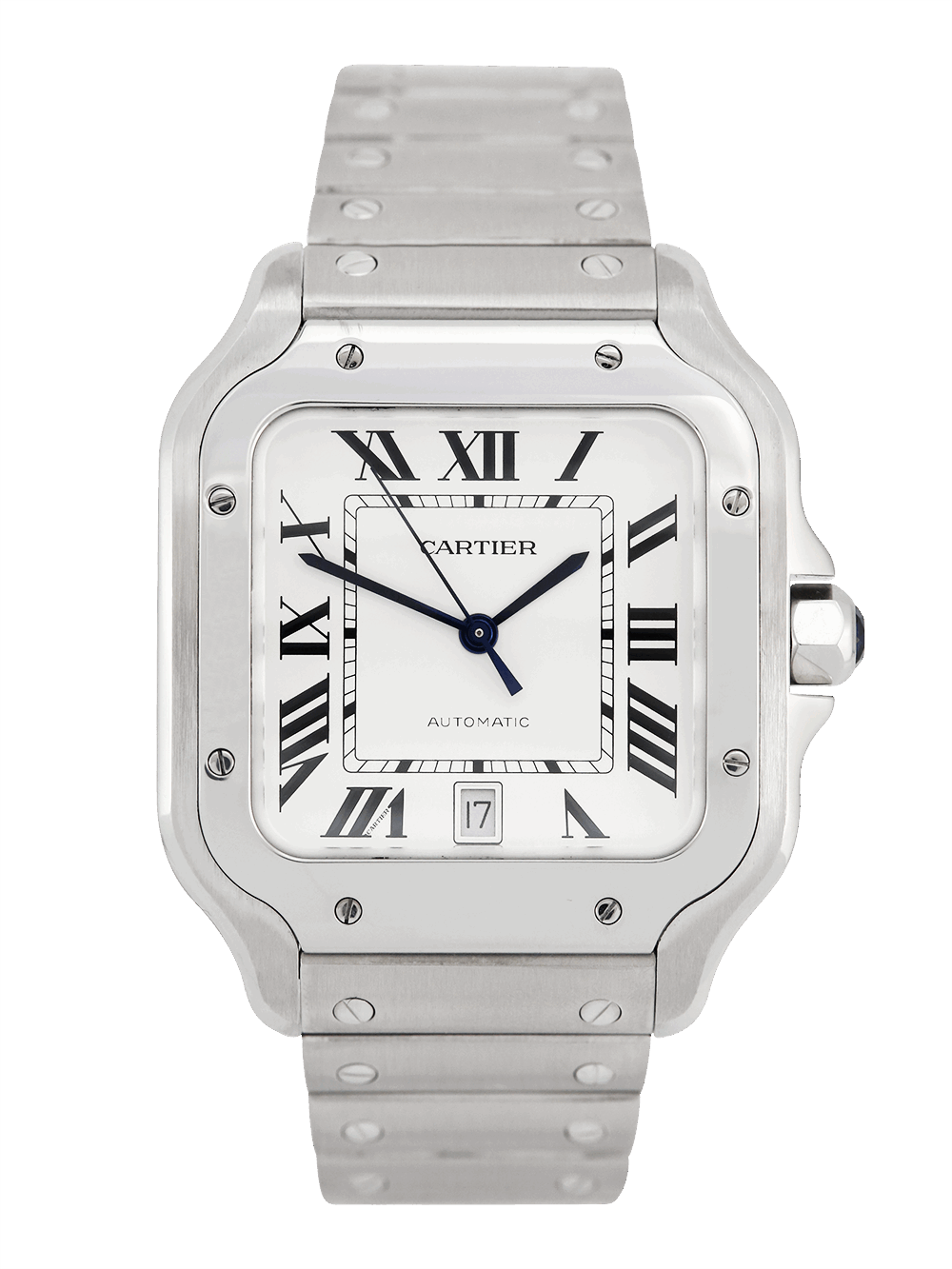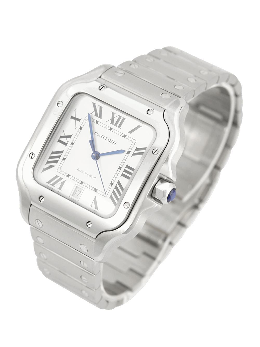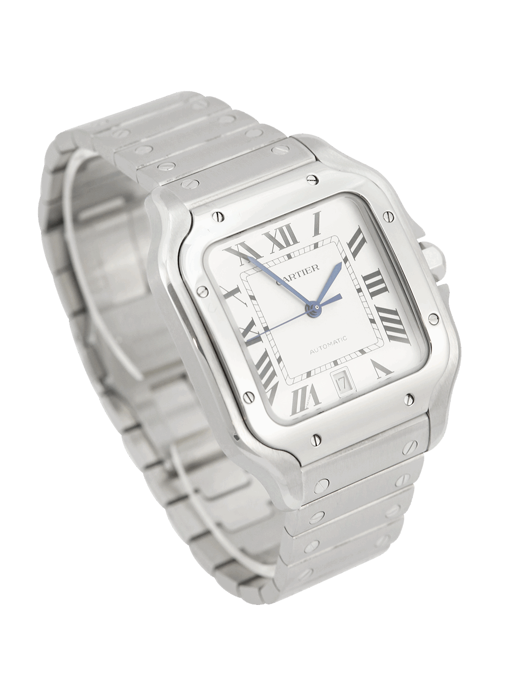 An excellent condition pre-owned 39.8mm case size stainless steel, calibre 1847 MC, automatic movement Cartier Santos De Cartier model reference WSSA0018 featuring a silvered opaline dial with blued-steel sword-shaped hands and Cartier’s classic black Roman numeral hour markers housing a date aperture at 6 O’clock surrounded by a polished finish stainless steel Santos bezel and stainless steel case. This particular watch comes on a stainless steel Cartier Santos bracelet with “SmartLink” adjustment system.