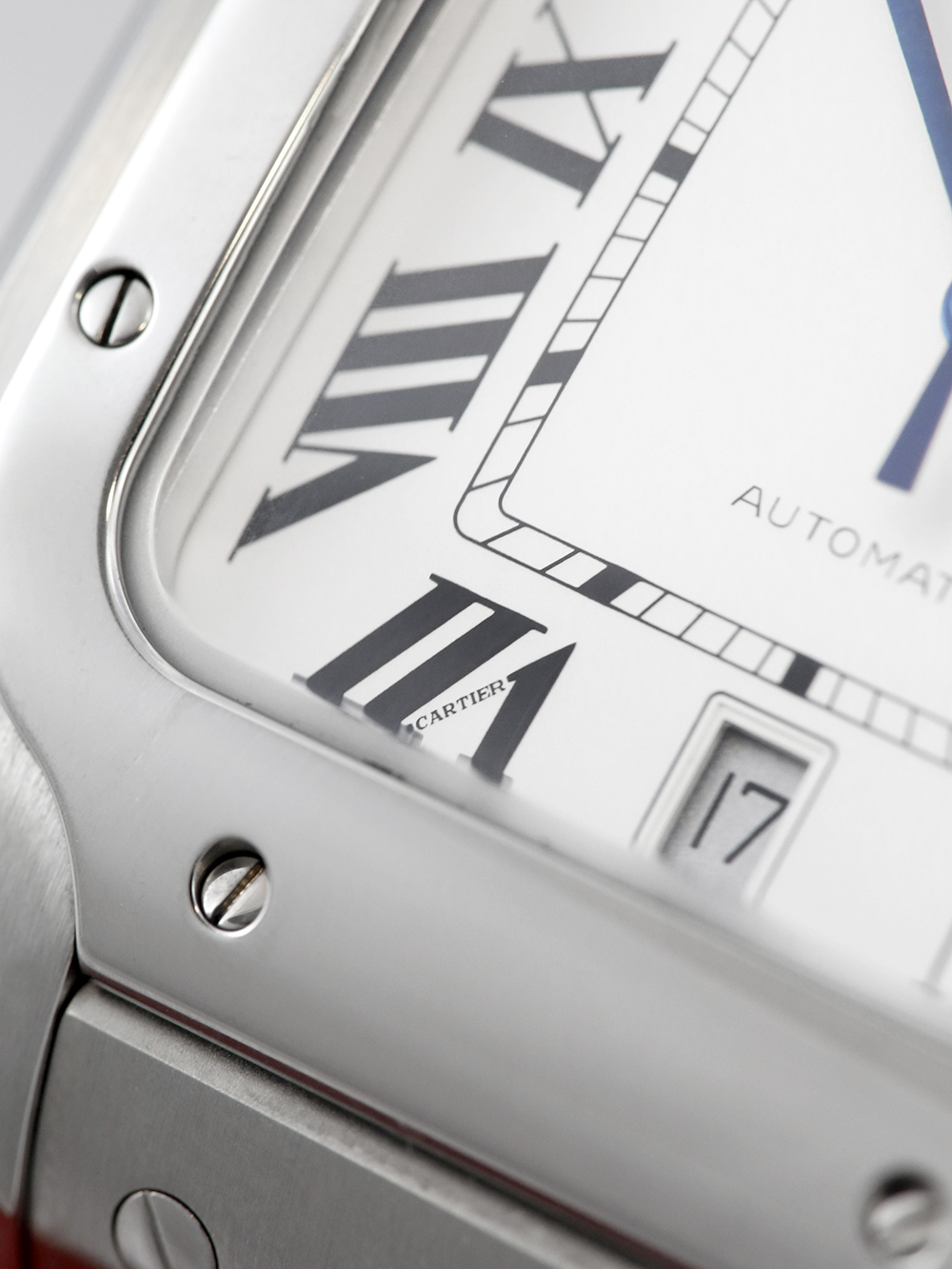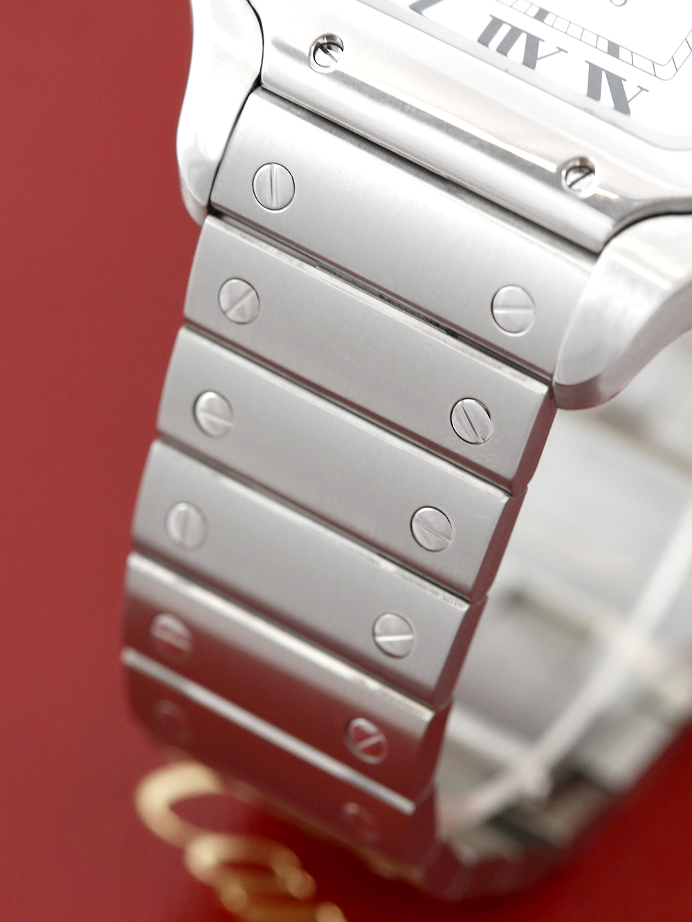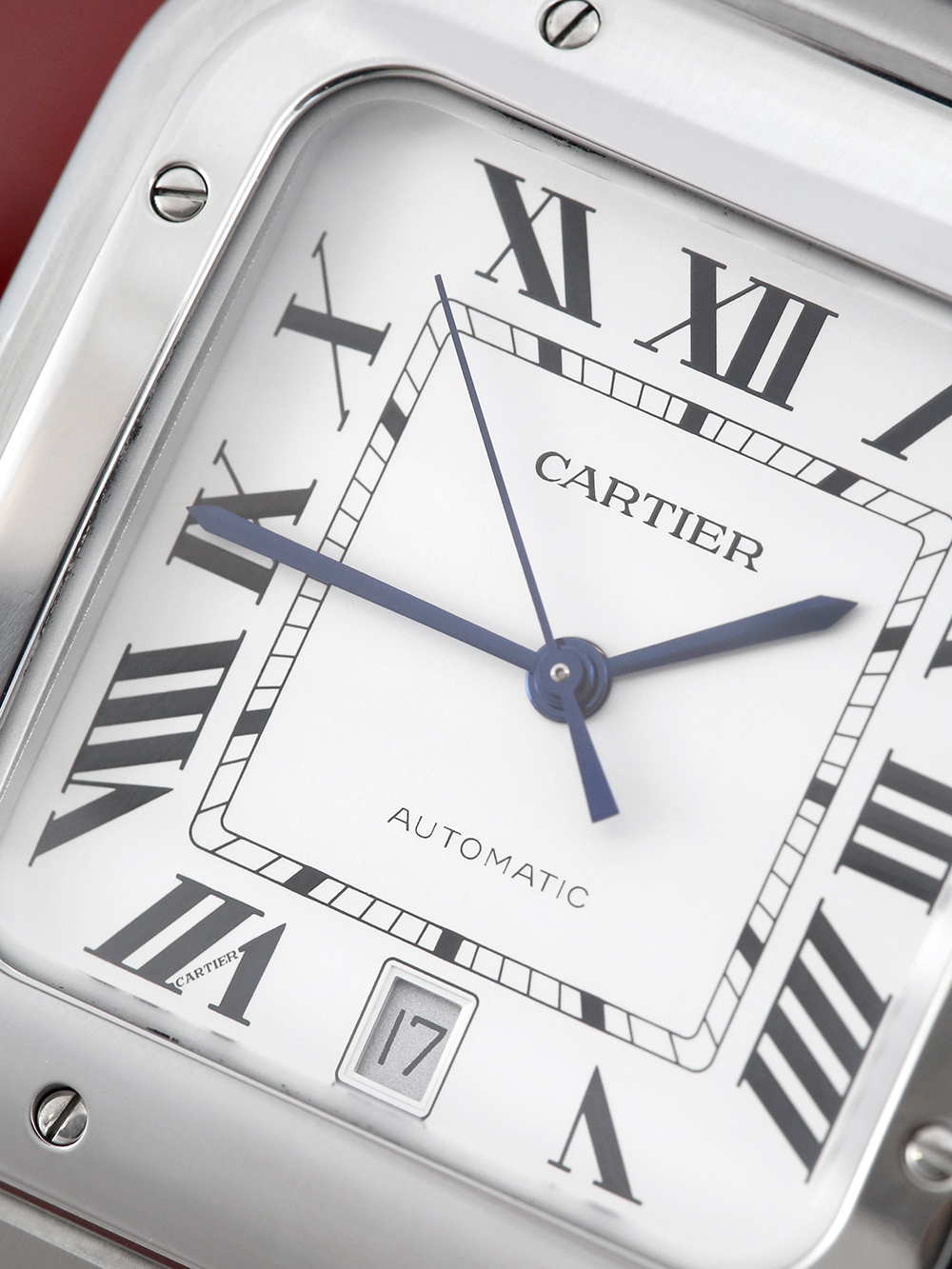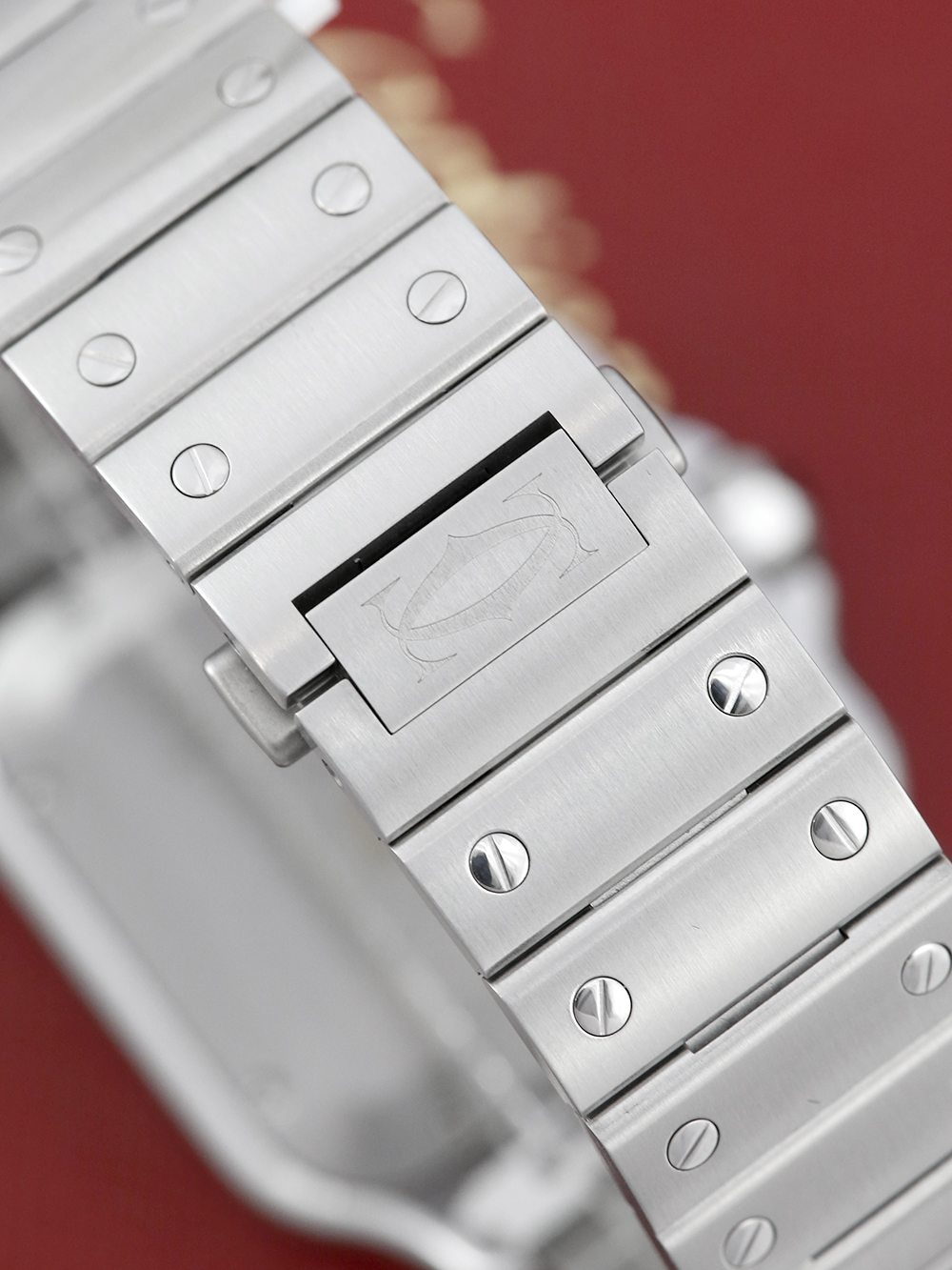 An excellent condition pre-owned 39.8mm case size stainless steel, calibre 1847 MC, automatic movement Cartier Santos De Cartier model reference WSSA0018 featuring a silvered opaline dial with blued-steel sword-shaped hands and Cartier’s classic black Roman numeral hour markers housing a date aperture at 6 O’clock surrounded by a polished finish stainless steel Santos bezel and stainless steel case. This particular watch comes on a stainless steel Cartier Santos bracelet with “SmartLink” adjustment system.