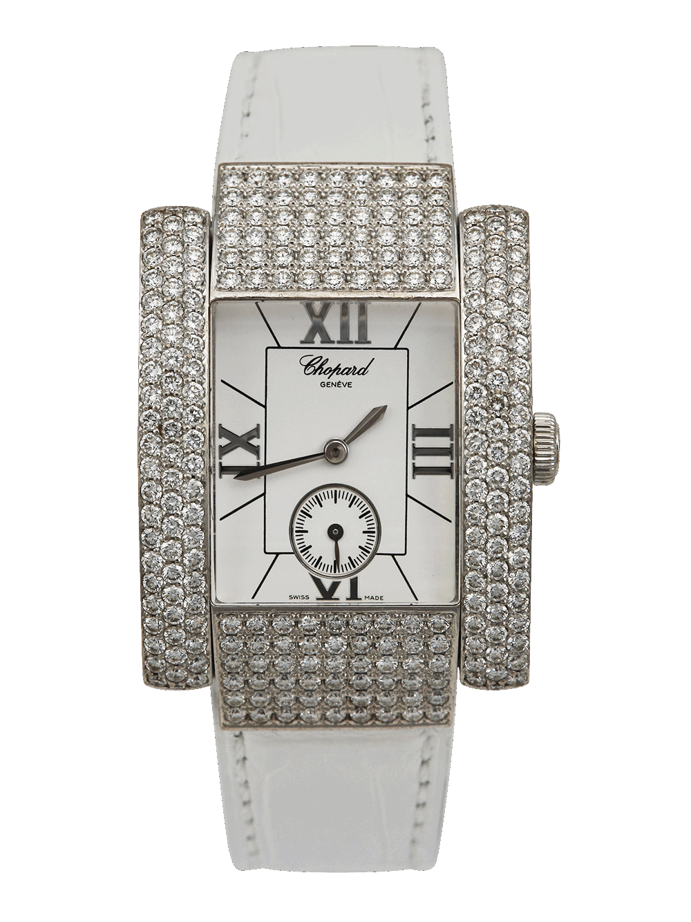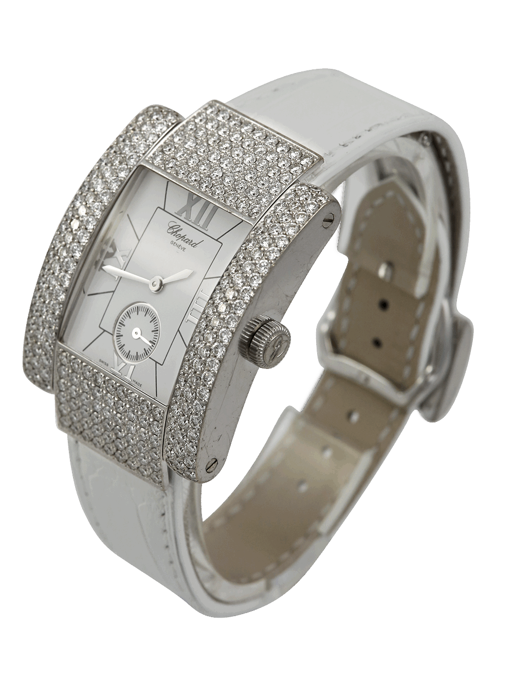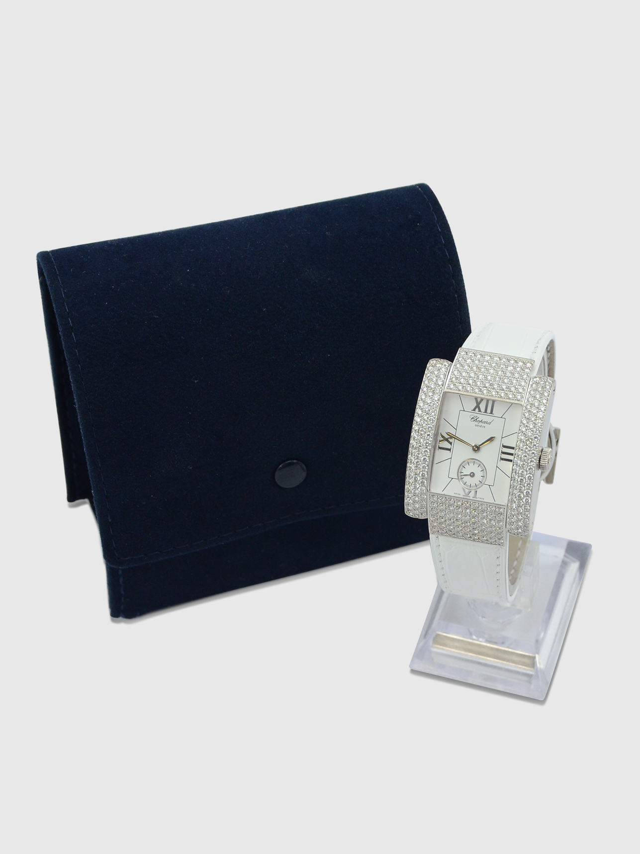As mentioned above our watch benefits from a recent service completed by Chopard which includes: Exchange of movement, maintenance service, exchange of hands, exchange of crown, exchange of crystal and an exchange of tube. A new strap was requested which Chopard did not have any longer in stock so they had one made specifically for our watch. This resulted in a delay of exactly one year as a gesture of goodwill they did not charge for the strap which was a saving circa £500 and more importantly the exact same strap is now fitted as per specification.