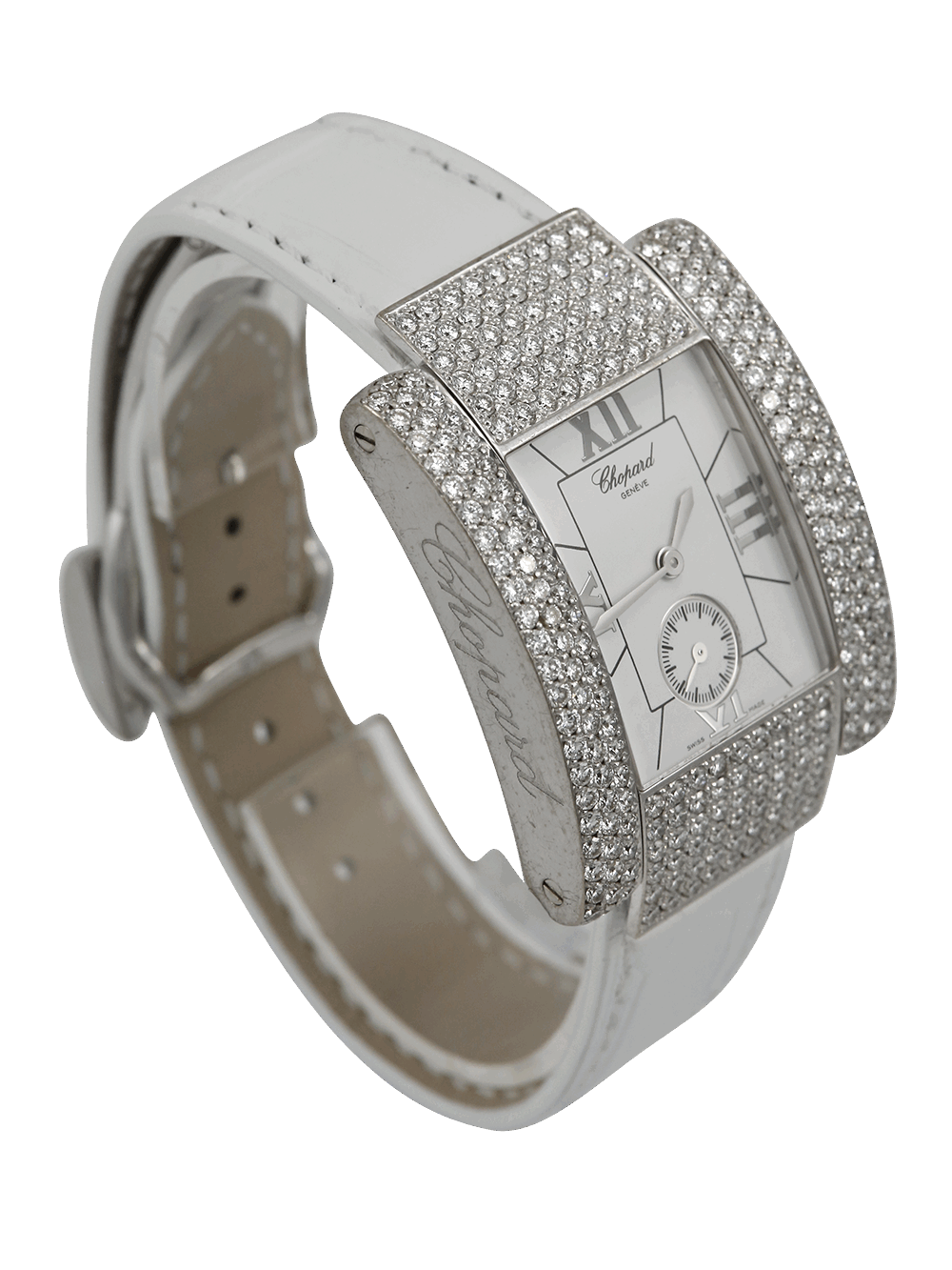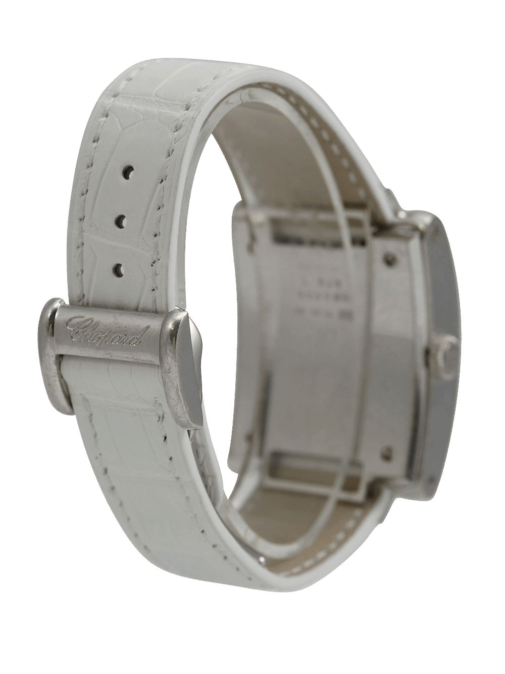 A reowned, excellent condition Chopard La Strada model reference 41/7423/-1001 18k White Gold ladies wristwatch. White dial, Roman numeral hour markers, an 18k White gold 44mm case, diamond bezel, winder and folding clasp, a brand new Chopard white leather strap, sapphire crystal glass and quartz movement.