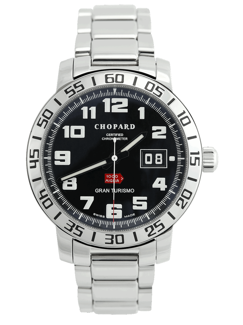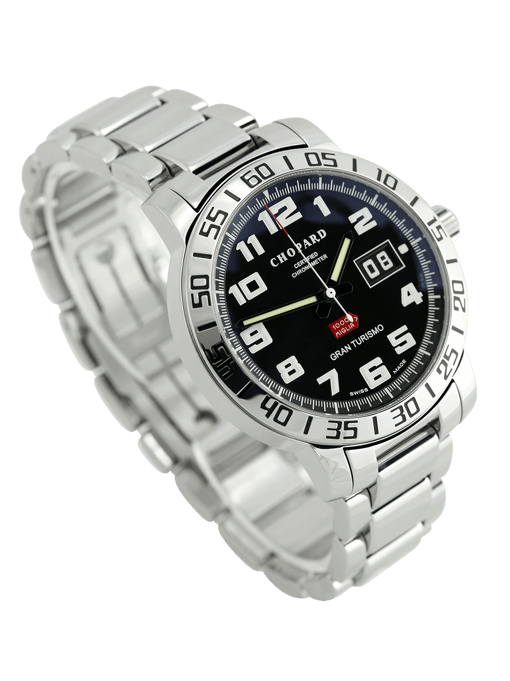 A pre-owned in pristine condition a Chopard Mille Miglia Gran Turismo model reference 158955-3001 featuring a black dial housing luminous Arabic numerals and a twin date aperture at 3 O’clock surrounded by a non-moving 60 minute bezel on a full retail length polished finish stainless steel Mille Miglia bracelet.