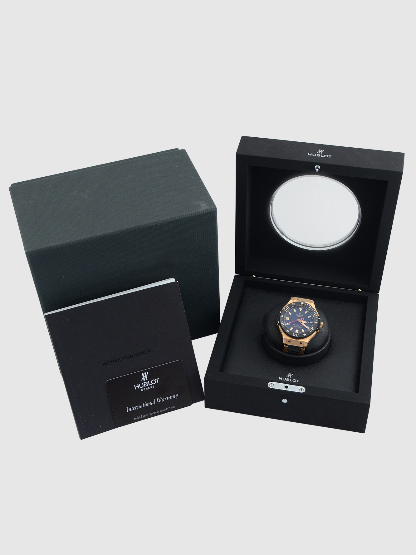 This particular watch is supplied as shown in the detailed images with both of the original inner and outer Hublot boxes, the original Hublot instruction book,