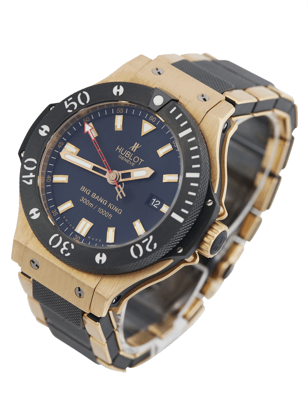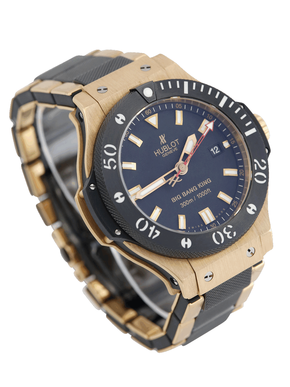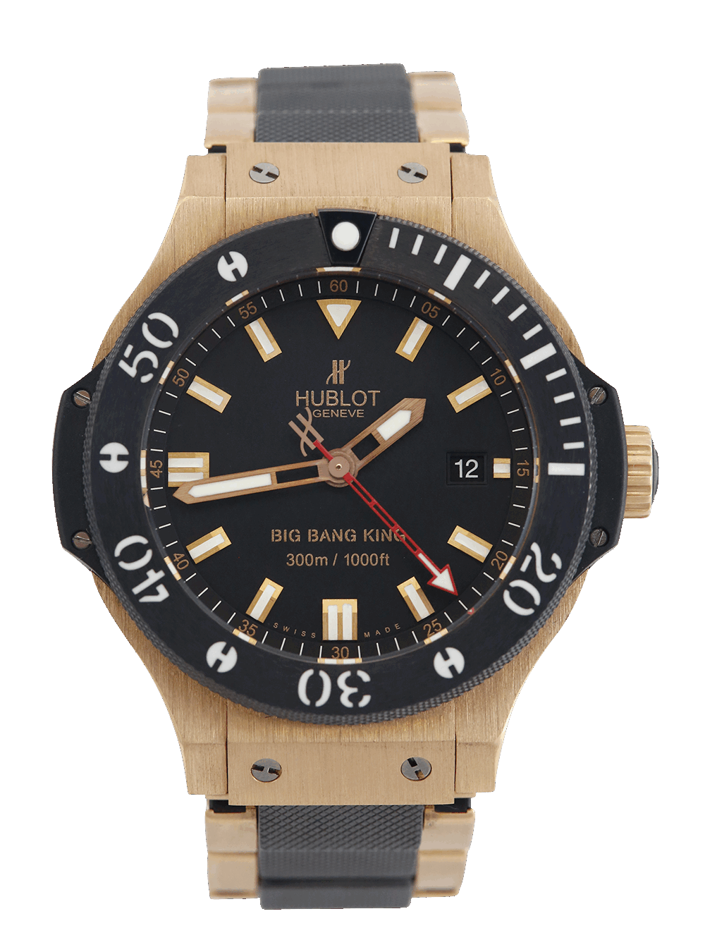 This Big Bang King is a limited edition watch, featuring a bold and dramatic matte black dial with date, luminous rose gold-tone hands, black ceramic bezel with ridged edges, covered with a scratch resistant sapphire crystal. Crafted in black 44mm three body ceramic case and presented on a rose gold and black ceramic Hublot bracelet.