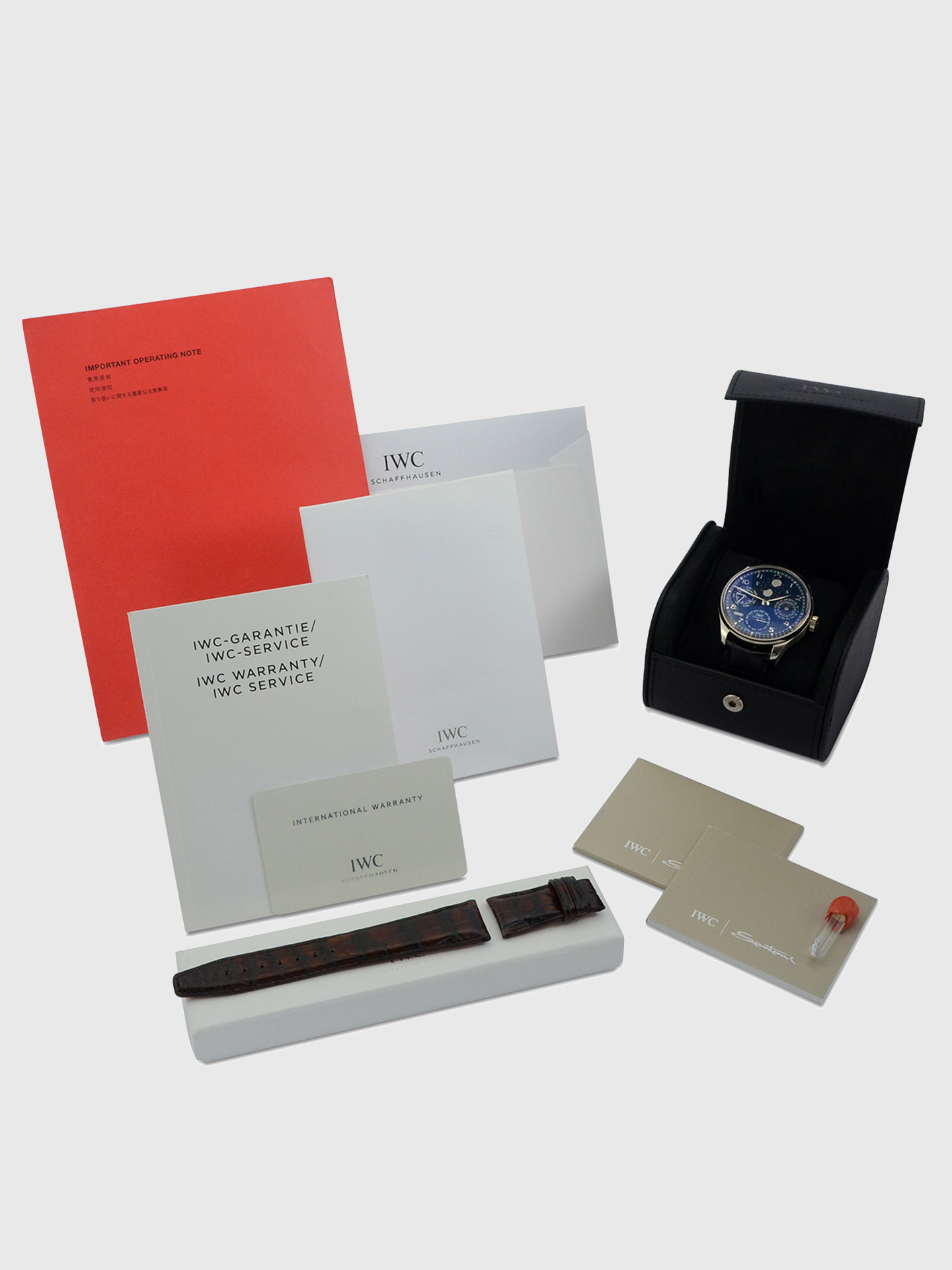 As shown in the detailed images this IWC is supplied with the original sales invoice dated October 2015, the original operating note leaflet, the original IWC warranty/service manual, an original IWC polishing cloth and the original IWC warranty card dated October 2015 when first supplied new by the authorised dealer in Singapore.
