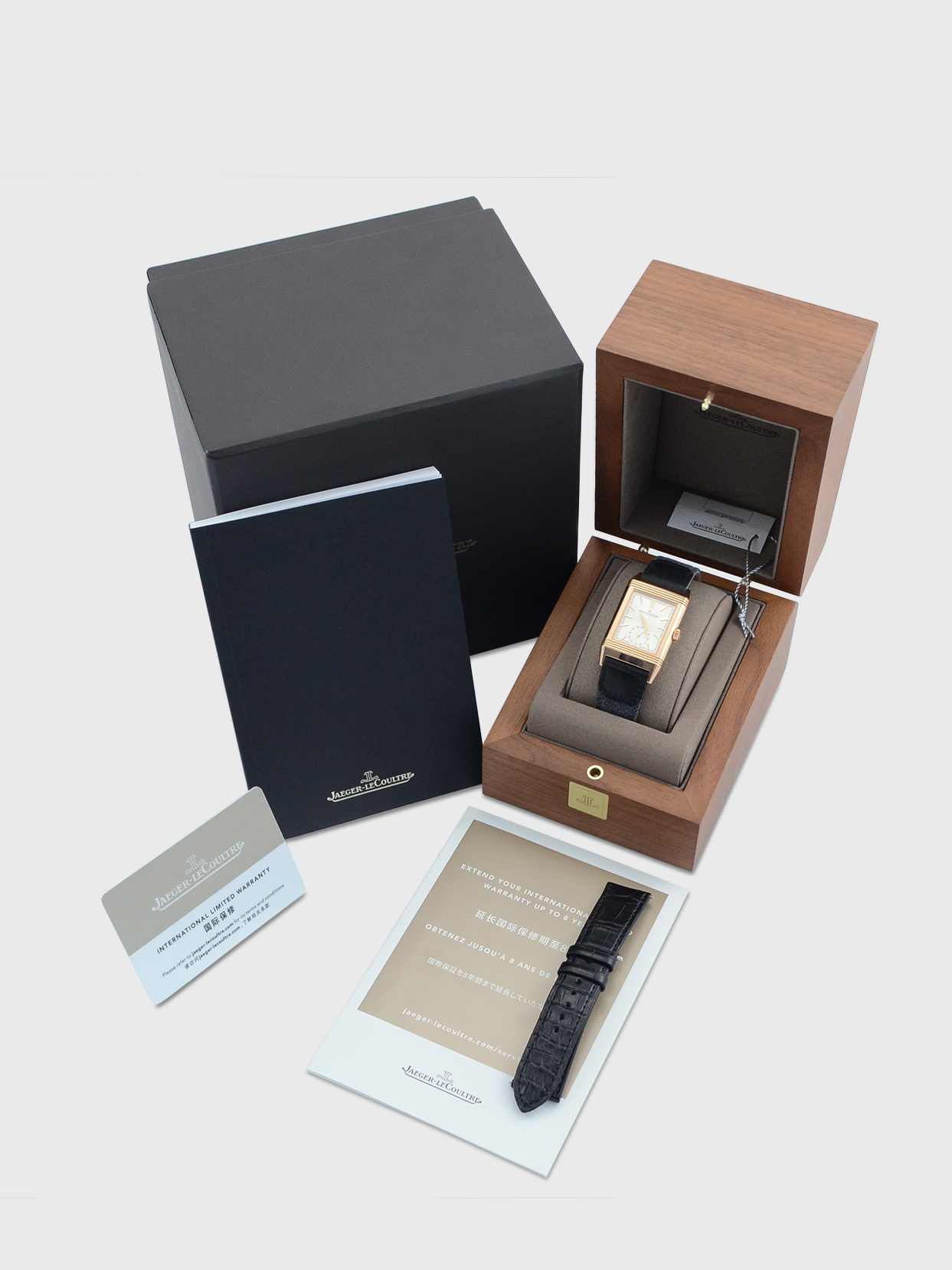 As shown in the detailed images this watch is supplied with the original Jaeger-LeCoultre outer box, the original Jaeger-LeCoultre inner wooden box, the original Jaeger-LeCoultre swing tag, the original Jaeger-LeCoultre general information booklet, the original Jaeger-LeCoultre extended warranty leaflet and the original Jaeger-LeCoultre warranty card dated February 2024 when first supplied new.