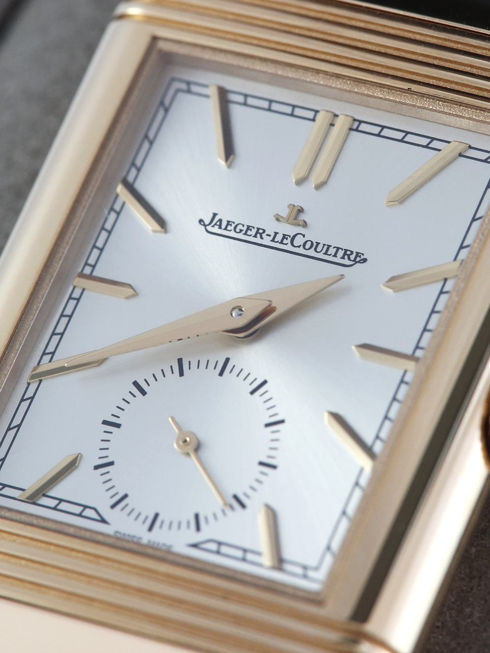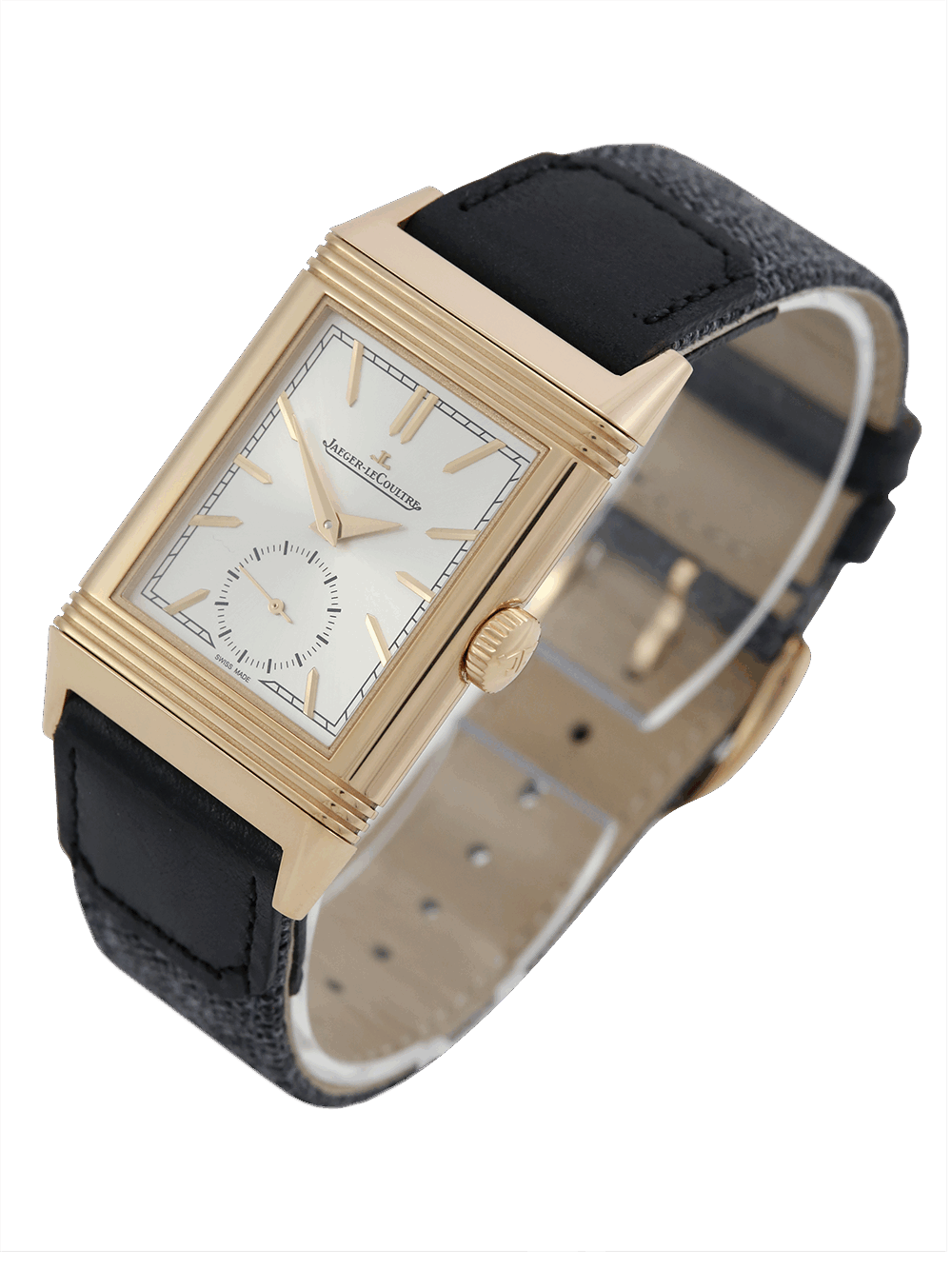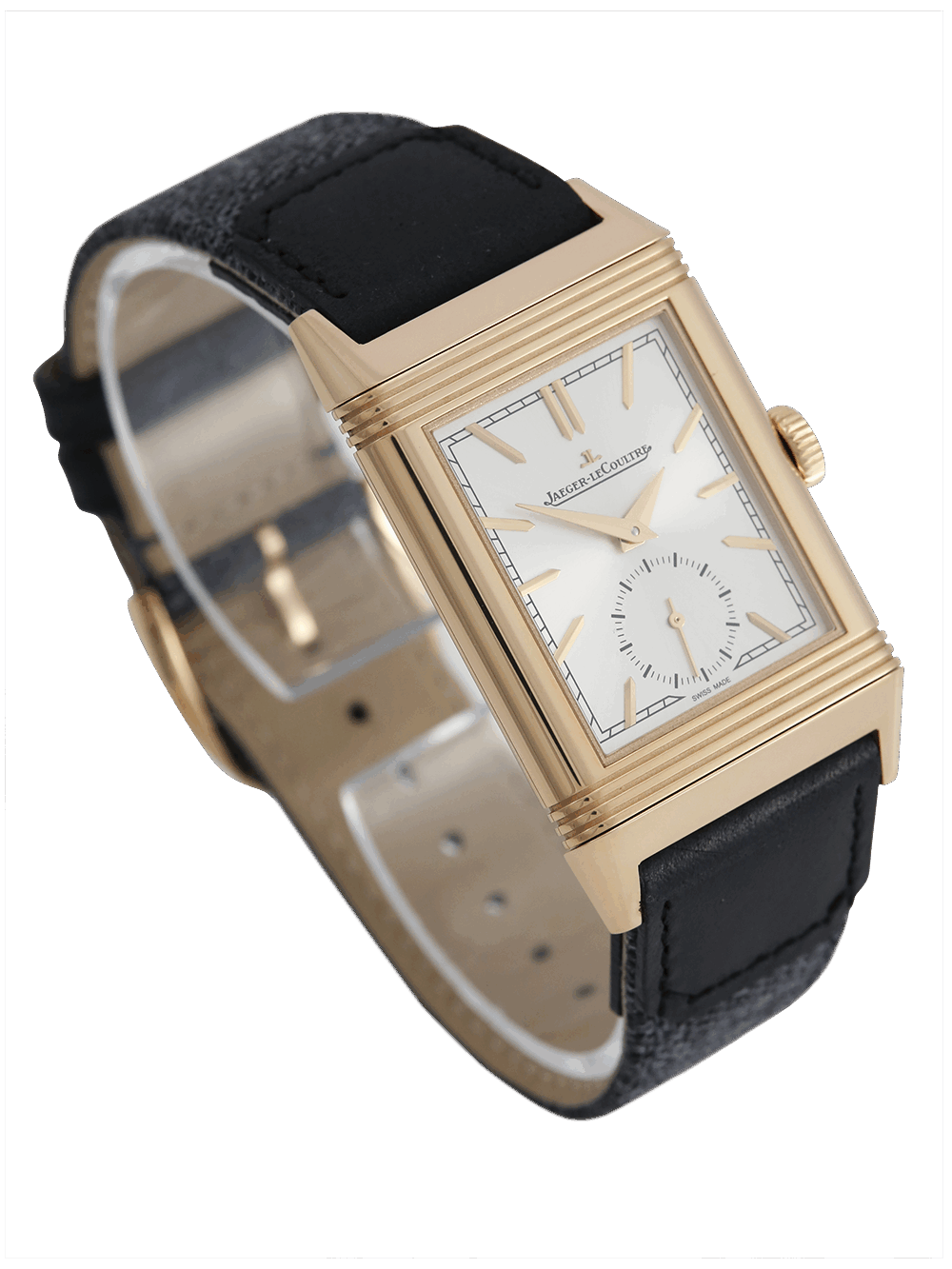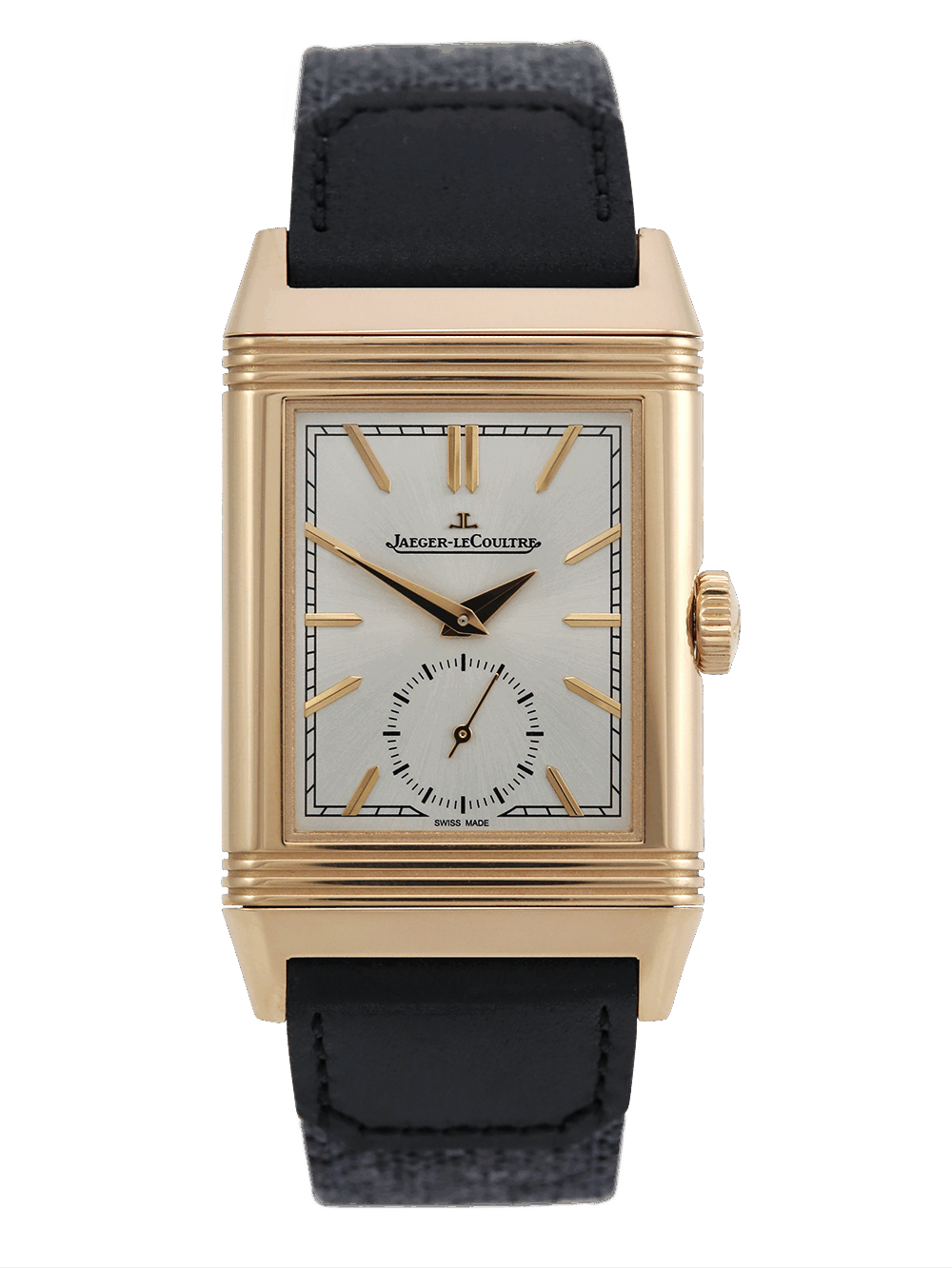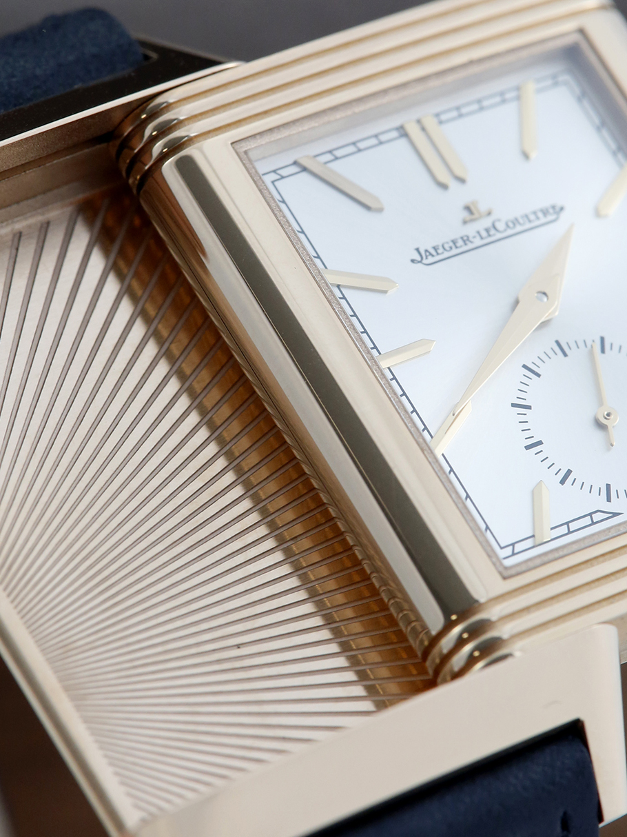 An unworn Jaeger-LeCoultre Reverso Tribute Monoface Small Seconds model reference Q7132521 which is equipped with Manufacture Calibre 822, each component of which is meticulously decorated, the Reverso Tribute Small Seconds elegantly marks the passing of time. Only 7.56 mm thick, its reversible pink gold case alone contains more than 50 components, a testament to its complexity and the hours put into its design. The silver colour of its sun-ray dial highlights the applied hour markers, the Dauphine hands and the small seconds hand. This watch is presented with a choice of two straps one of a canvas dark grey the other a black Alligator leather strap with a pin buckle.