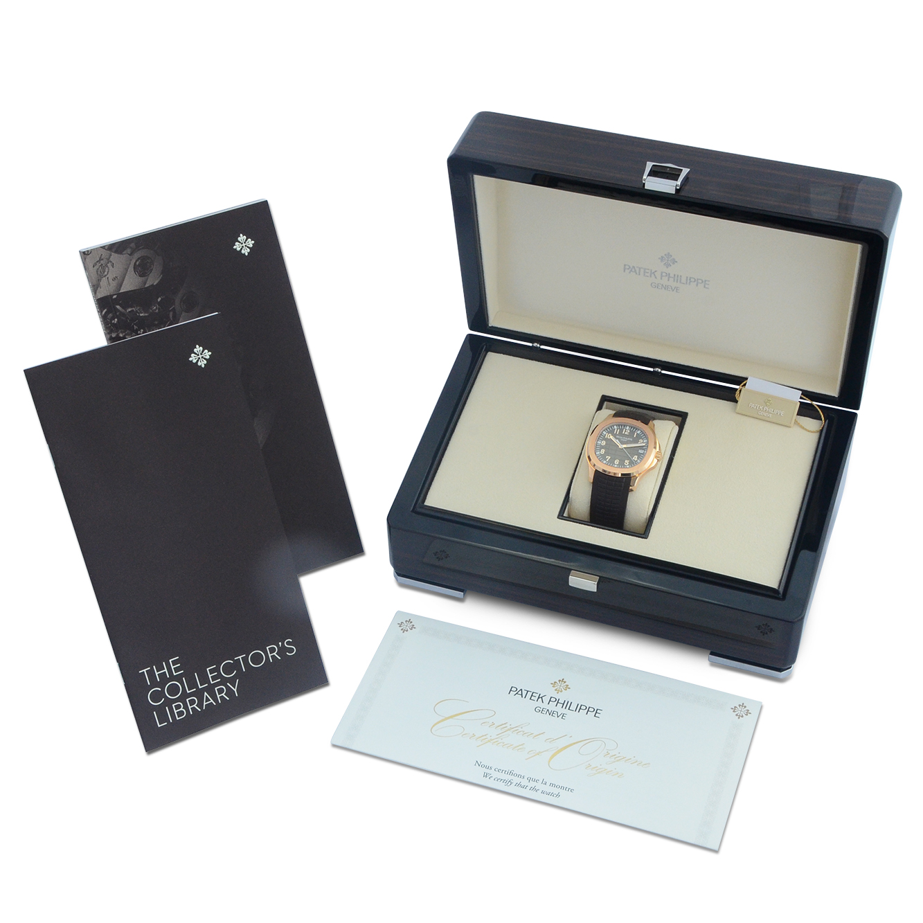 As shown in the detailed images this Aquanaut is supplied with the original inner and outer Patek Philippe boxes, a Patek Philippe inner box dust cover, a Patek Philippe swing tag, the Patek Philippe leather booklet holder, four Patek Philippe manuals: collector’s library manual, self winding movement manual, register booklet and the museum booklet. The original Patek Philippe certificate is dated first quarter 2020 when first supplied new.