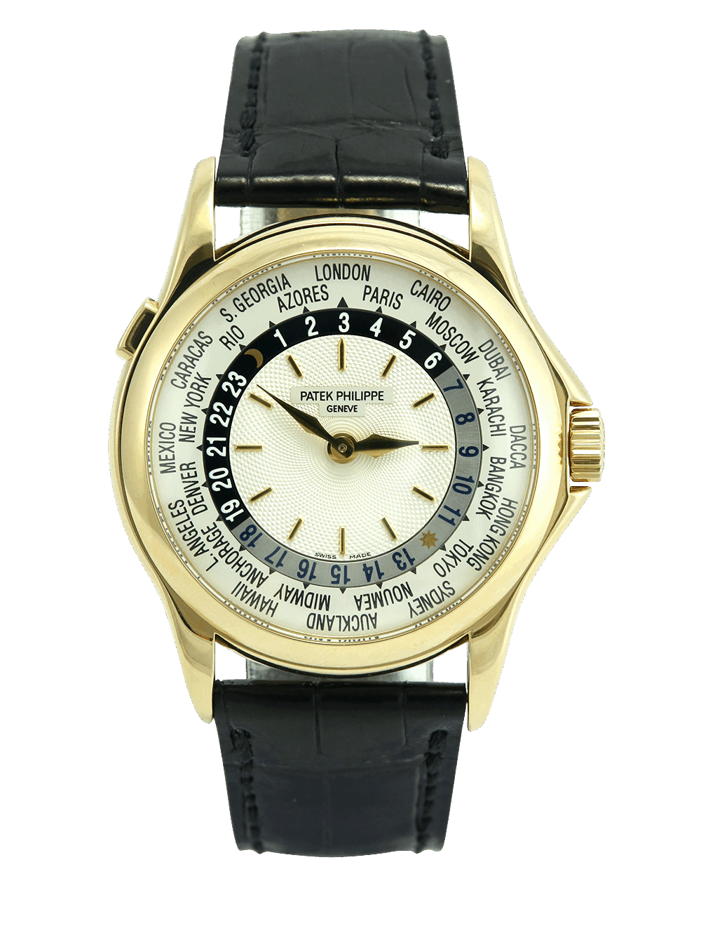 We are pleased to offer for sale this fine example of a Patek Philippe World Time 5110J-001. We acquired this watch without the original box and papers, when this is the case we will strictly send the watch to the manufacture for a complete service regardless of cost.