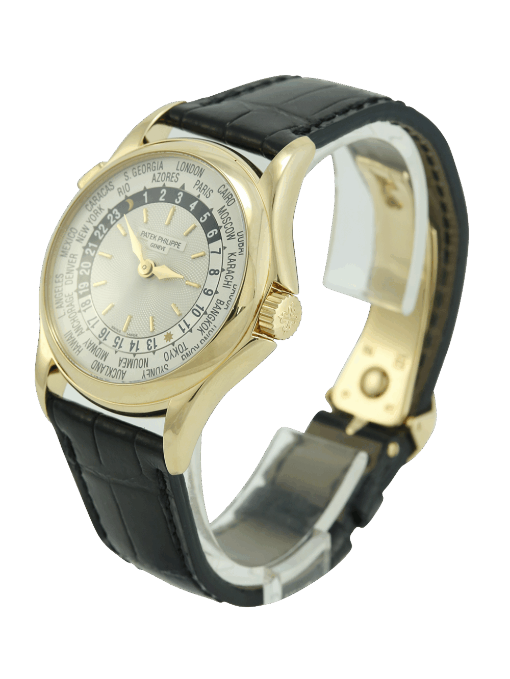 As close to brand new as could be achieved fully serviced by Patek Philippe and unworn since a Patek Philippe World Time 5110J in 18k yellow gold which features a white engine-turned guilloché center dial with a blue/grey 24-hour scale and the UTC city ring on the periphery. Automatic movement powered by a 22k gold micro-rotor with 48 hours power reserve. Supplied on a black alligator leather strap with Patek 18k yellow gold deployant buckle.