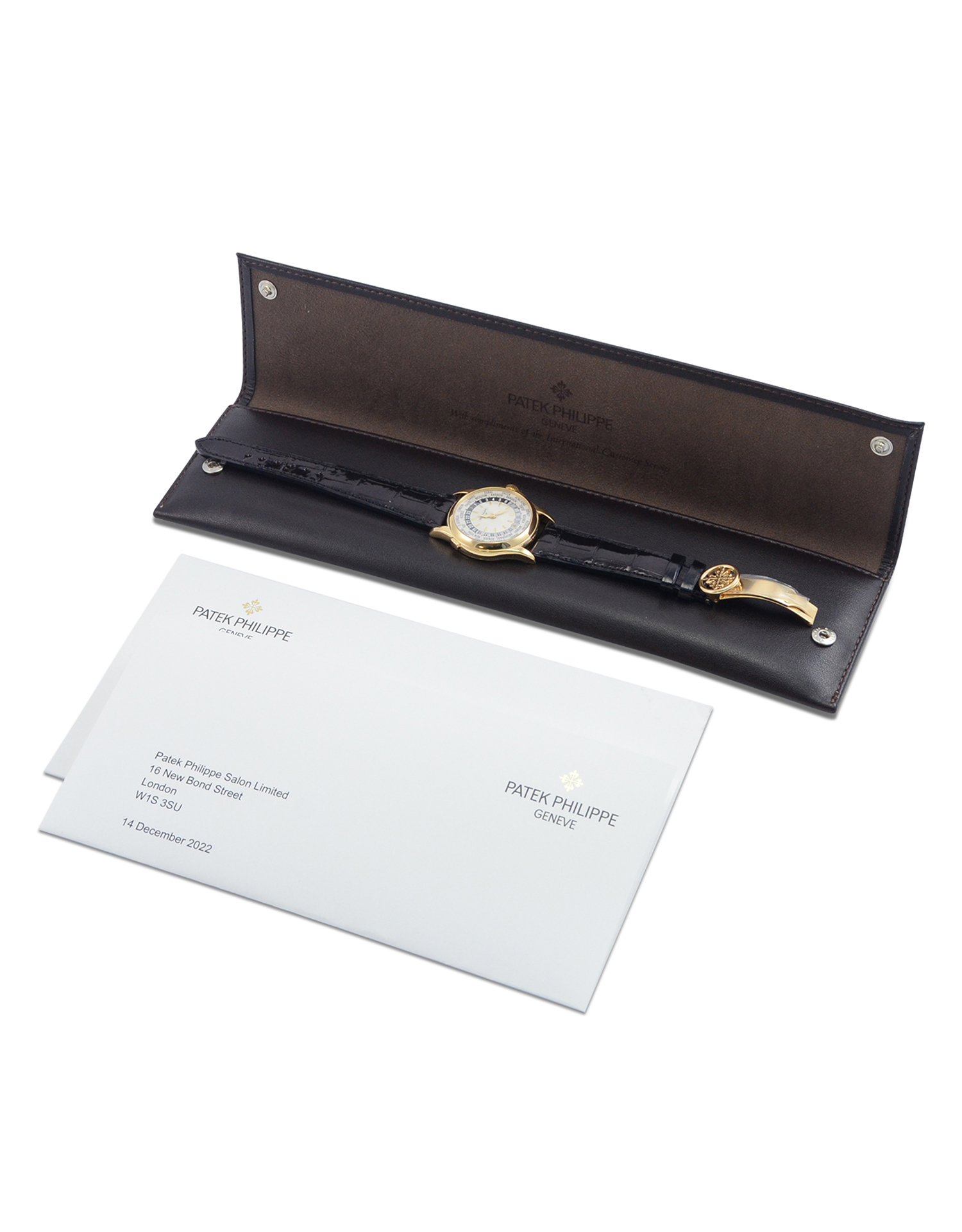 As shown in the images this watch is supplied with an original Patek Philippe service pouch, a detailed Patek Phillipe service document, the original black leather strap and the original Patek Phillipe service invoice (£1,695).