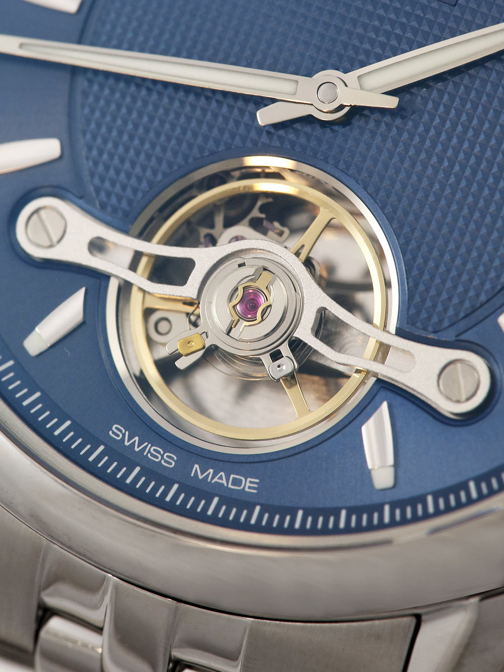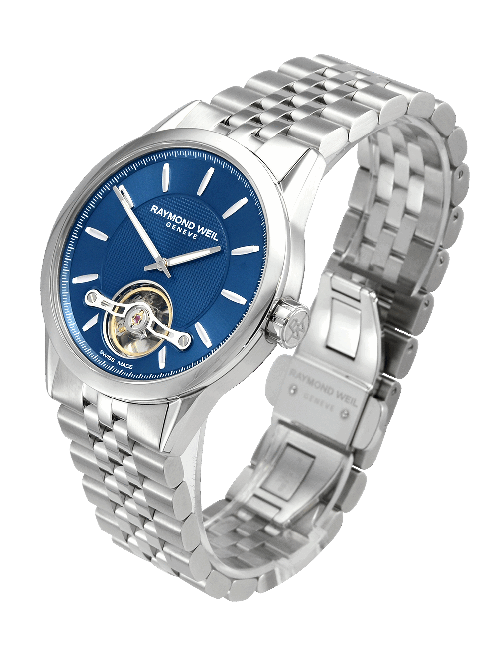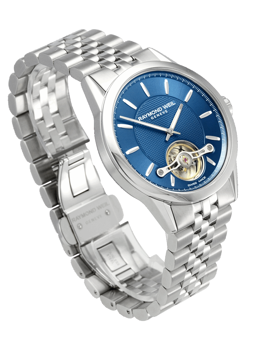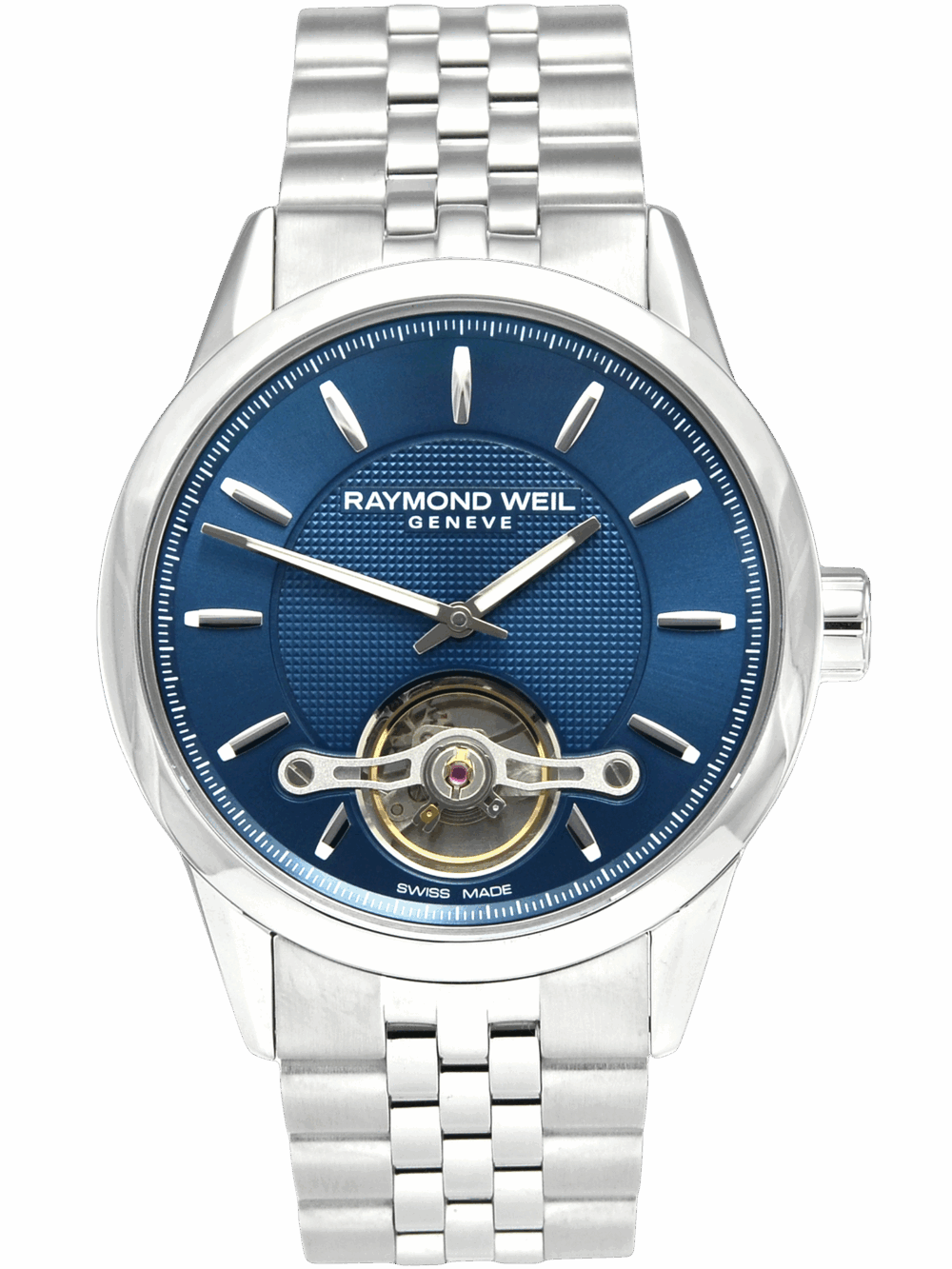 We are pleased to offer for sale this brand new unworn Raymond Weil Freelancer model reference 2780-ST-50001. Featuring a 42mm stainless steel case, housing a unique blue sunburst effect open-worked dial revealing the regulating organ at 6 o’clock. The balance-and-spring assembly, held by a single bridge, reveals a construction echoing that of the most beautiful tourbillon regulators. Its oscillating weight is adorned with a “Côtes de Genève” motif and engraved with the RAYMOND WEIL logo. The dial is surrounded by a fixed polished finish stainless steel bezel and protected by a sapphire crystal with antiglare treatment on both sides. Presented on a full retail length stainless steel bracelet.