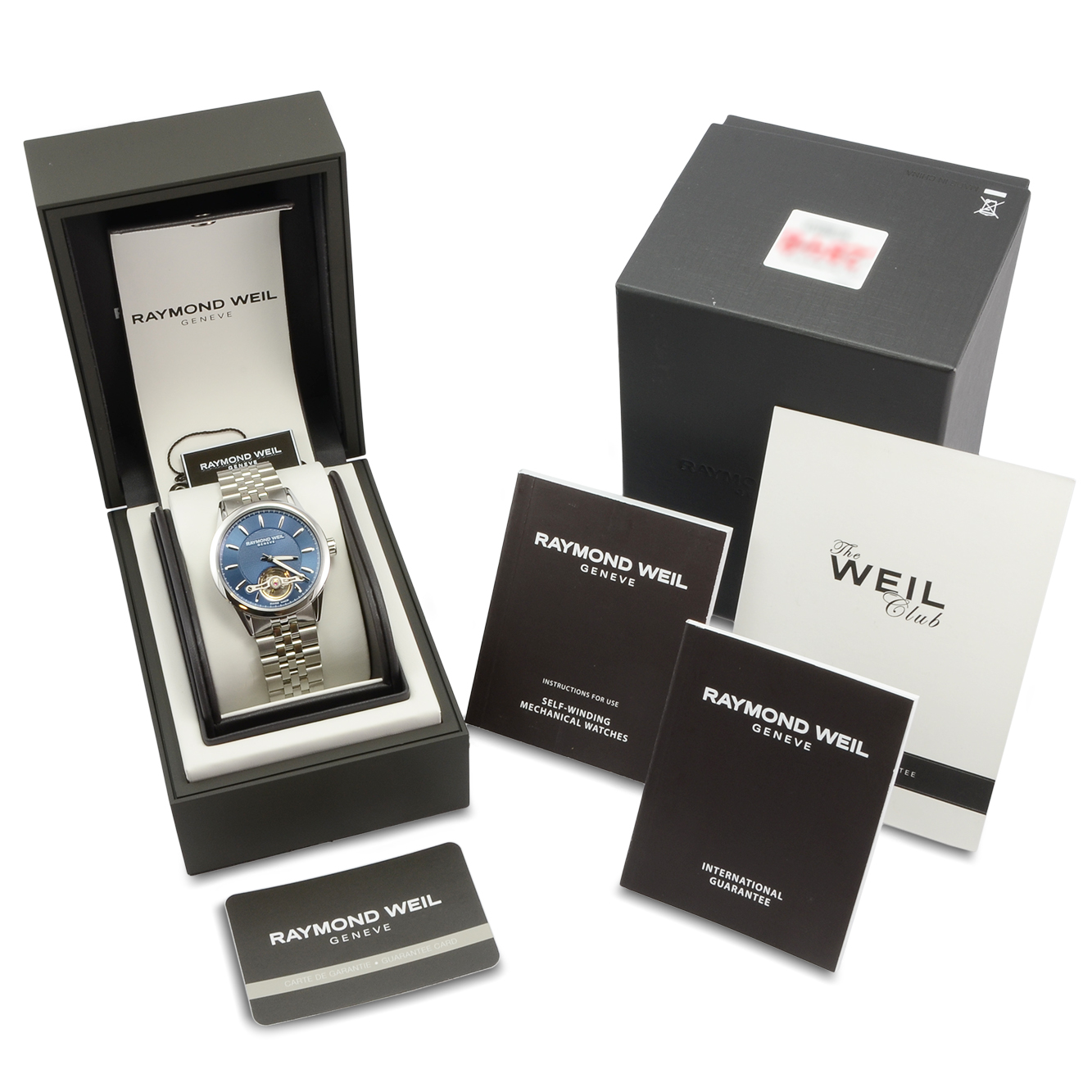 This particular watch is supplied as shown in the detailed images with the outer box sleeve, both inner and outer boxes, two manuals, one swing tag, two Raymond Weil warranty cards. The card is dated November 2020 when the watch was first purchased new in the UK.