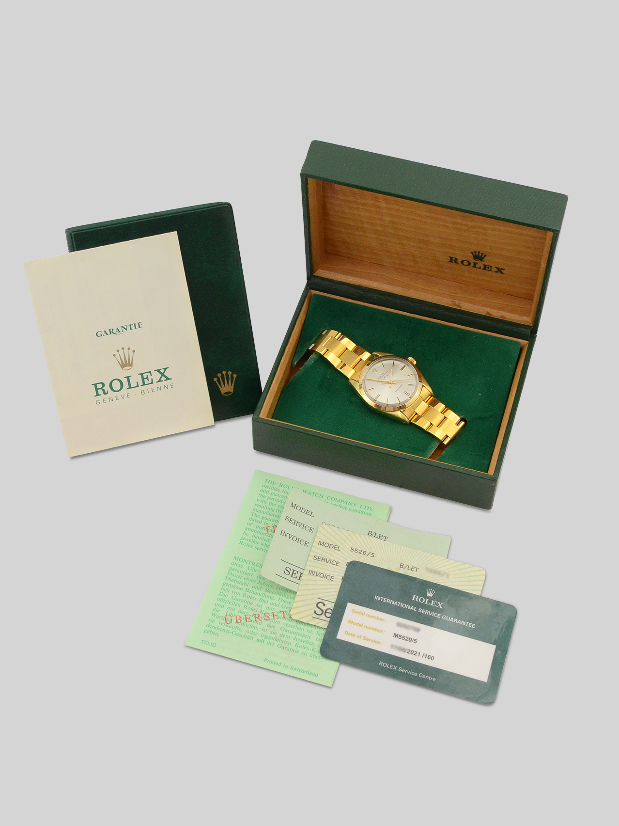 An original Rolex service card dated 17/08/2021 along with an invoice for (£4,147) which included a complete overhaul to the movement, a new bracelet, a new case, a new dial, new hands and a new oscillating weight.
