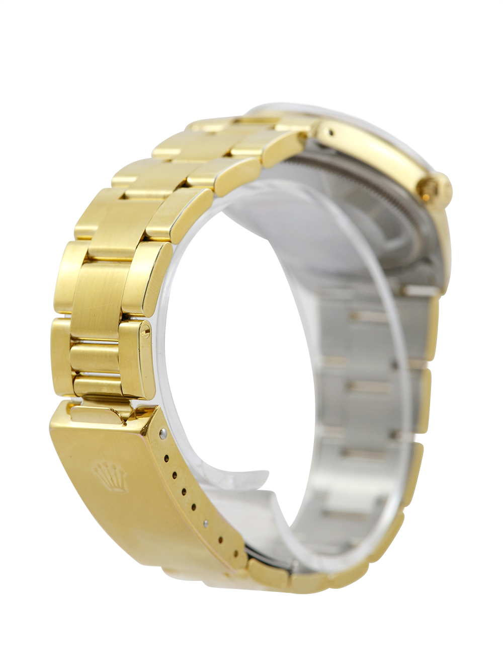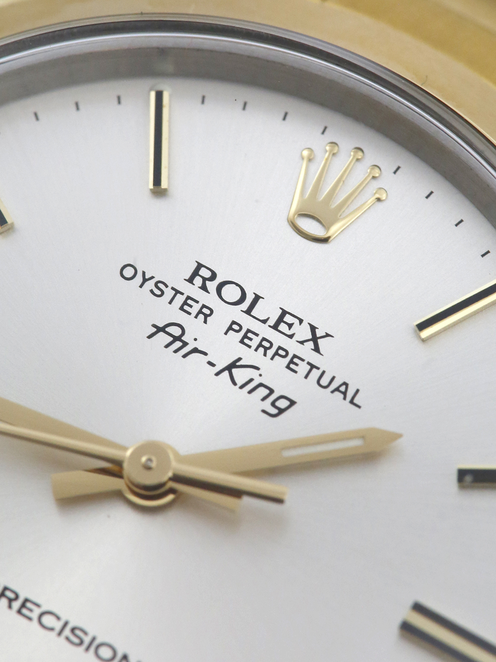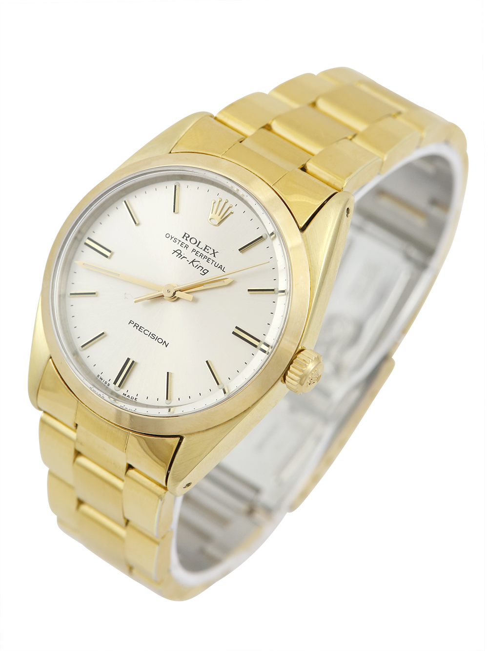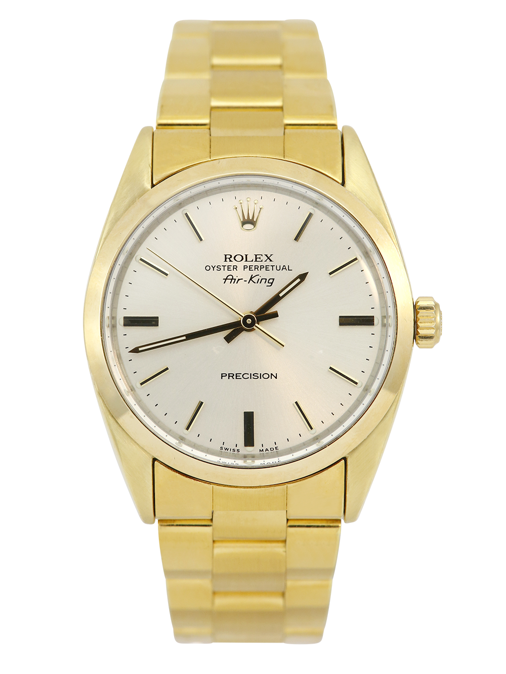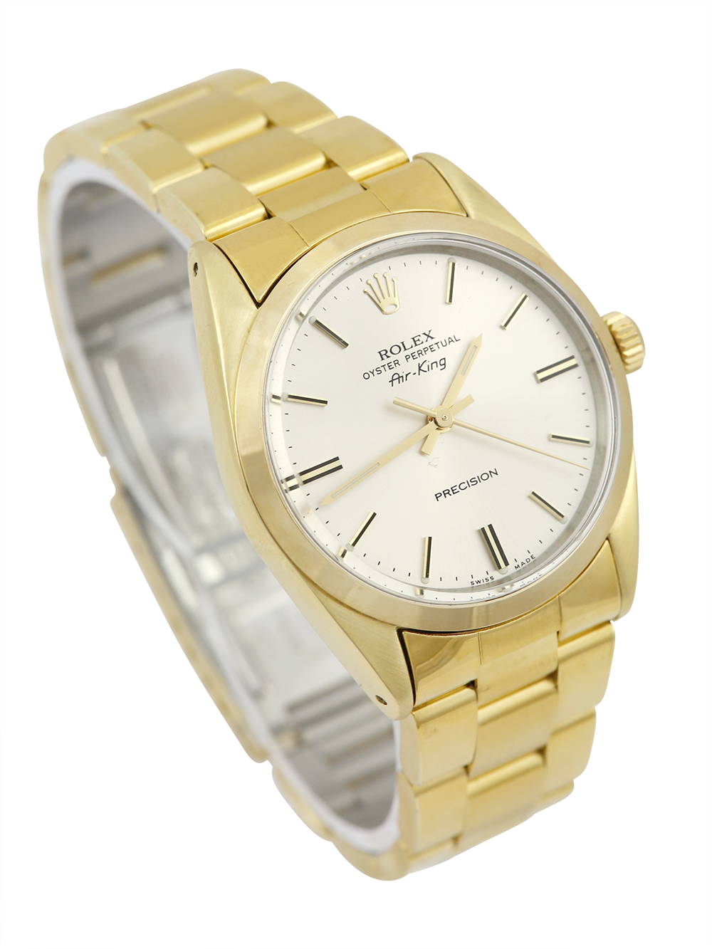 We are delighted to offer for sale this one previous owned preowned Rolex Air King model reference 5520 presented in excellent condition. A 34mm 14ct gold plated Oyster case housing a 1520 calibre automatic movement, with a silver dial with gold stick hour markers surrounded by a 14ct gold plated smooth bezel capped off with a pexi glass presented on a full retail length 14ct gold plated Oyster bracelet with a folding 14ct gold plated clasp.