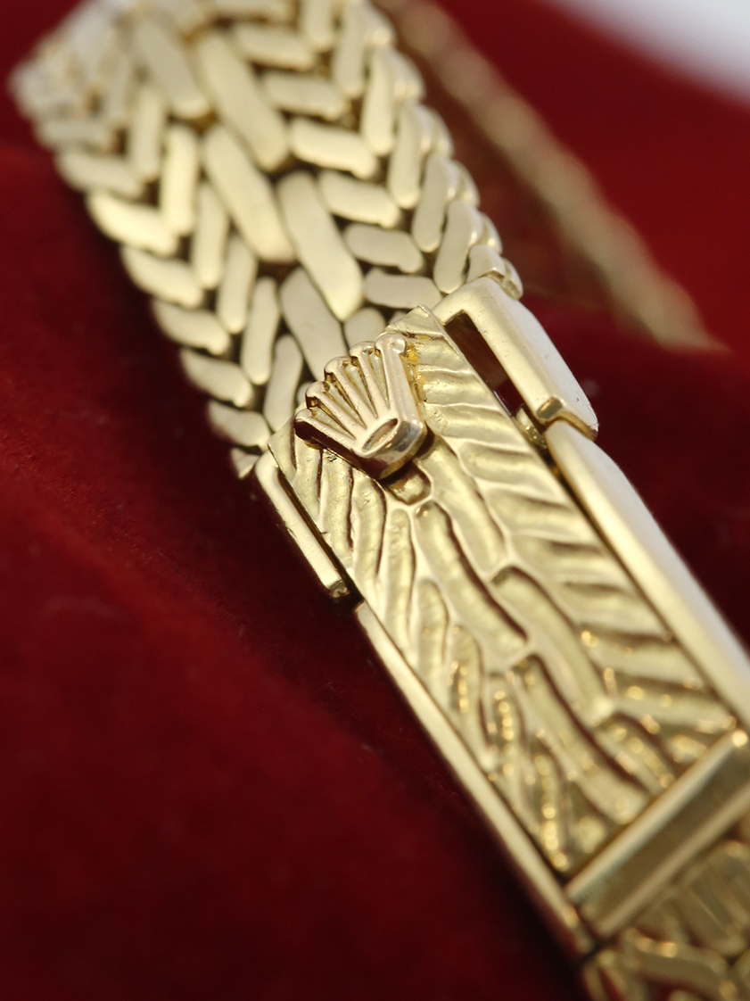 This pre-owned in very good cosmetic condition ladies automatic movement Rolex Cellini model reference 2291 a full yellow gold case measuring approximately 21mm width x 25mm corner to corner. The bracelet is a full yellow gold with a folding adjustable clasp.