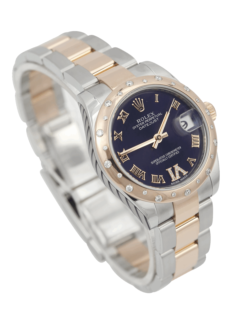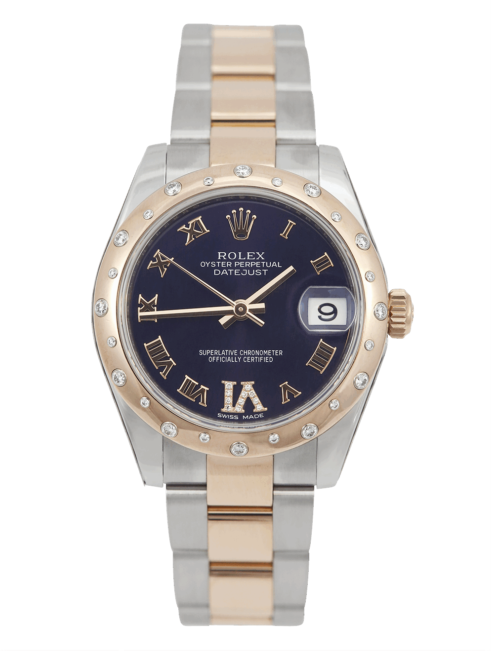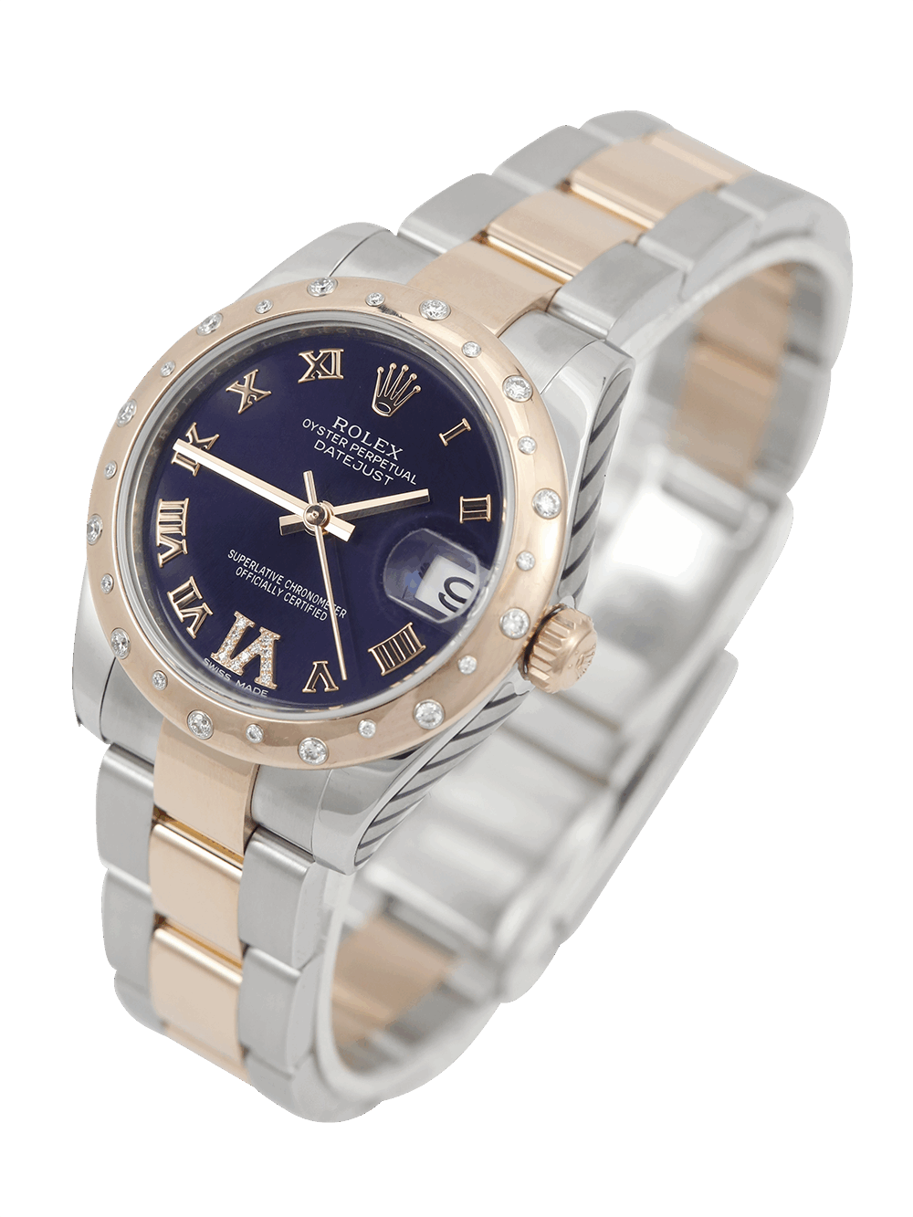 A previously owned serviced by Rolex and unworn since which is in pristine condition. A stainless steel and ever rose gold bi metal, chronometer certified, automatic movement Rolex Lady Datejust 31mm model reference 178341. Featuring a stunning roman numeral aubergine with a pavé set ‘VI’ dial, housing a date aperture at 3 o’clock, with an external cyclops and surrounded by a factory set scattered diamond bezel. This particular watch is presented on a full retail length bi metal Rolex oyster bracelet.