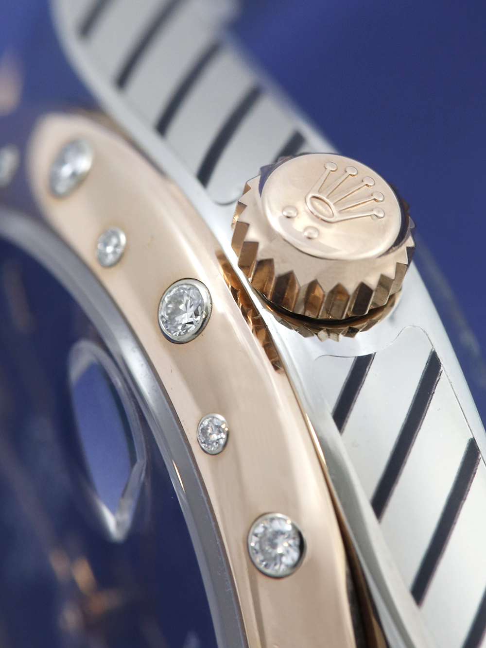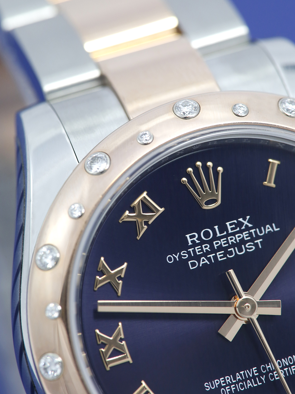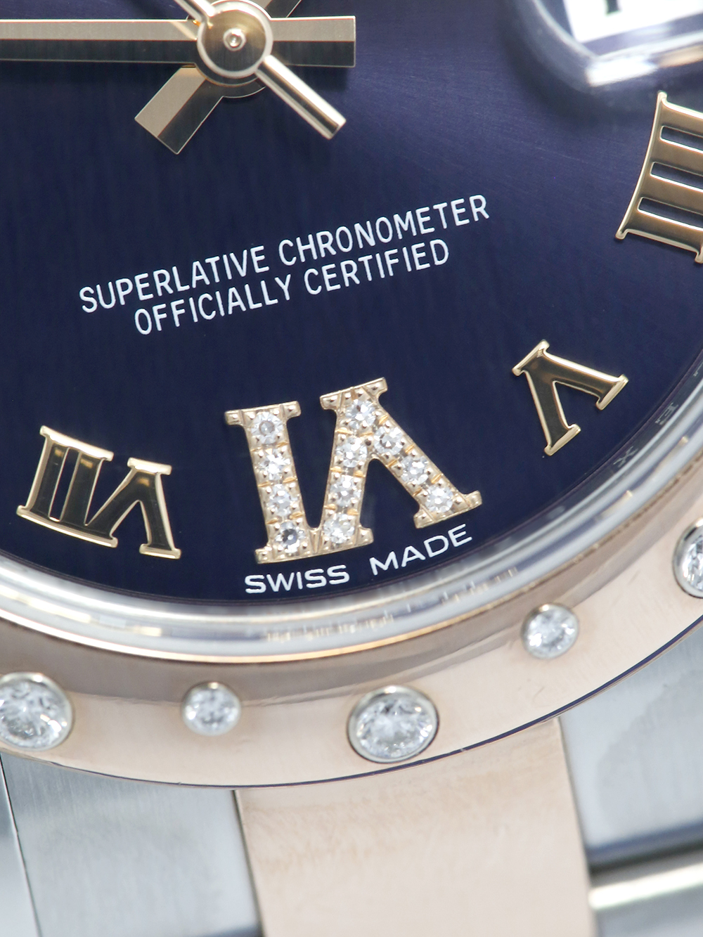 A previously owned serviced by Rolex and unworn since which is in pristine condition. A stainless steel and ever rose gold bi metal, chronometer certified, automatic movement Rolex Lady Datejust 31mm model reference 178341. Featuring a stunning roman numeral aubergine with a pavé set ‘VI’ dial, housing a date aperture at 3 o’clock, with an external cyclops and surrounded by a factory set scattered diamond bezel. This particular watch is presented on a full retail length bi metal Rolex oyster bracelet.