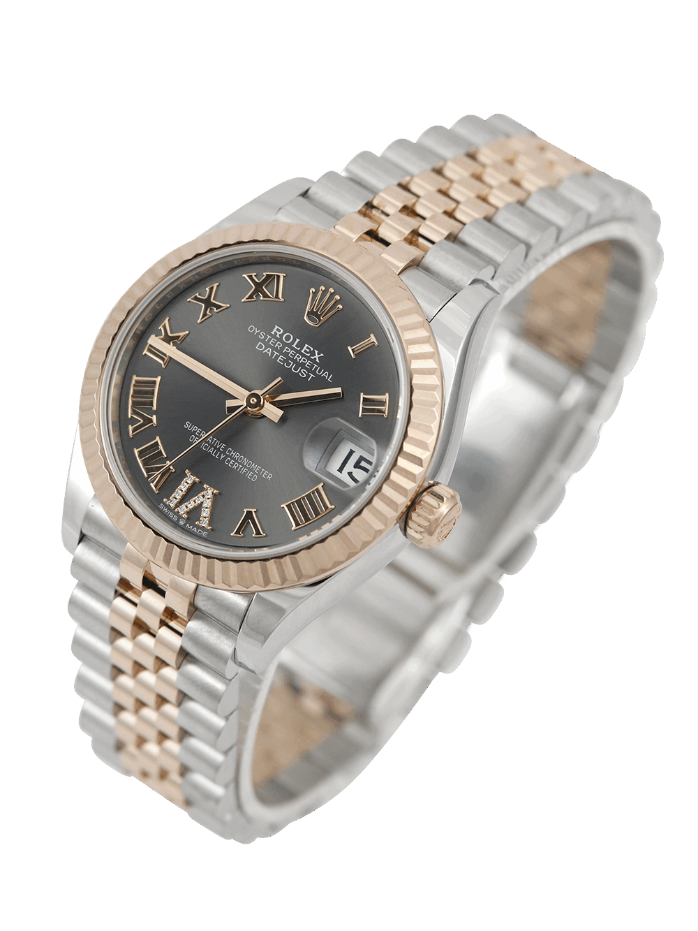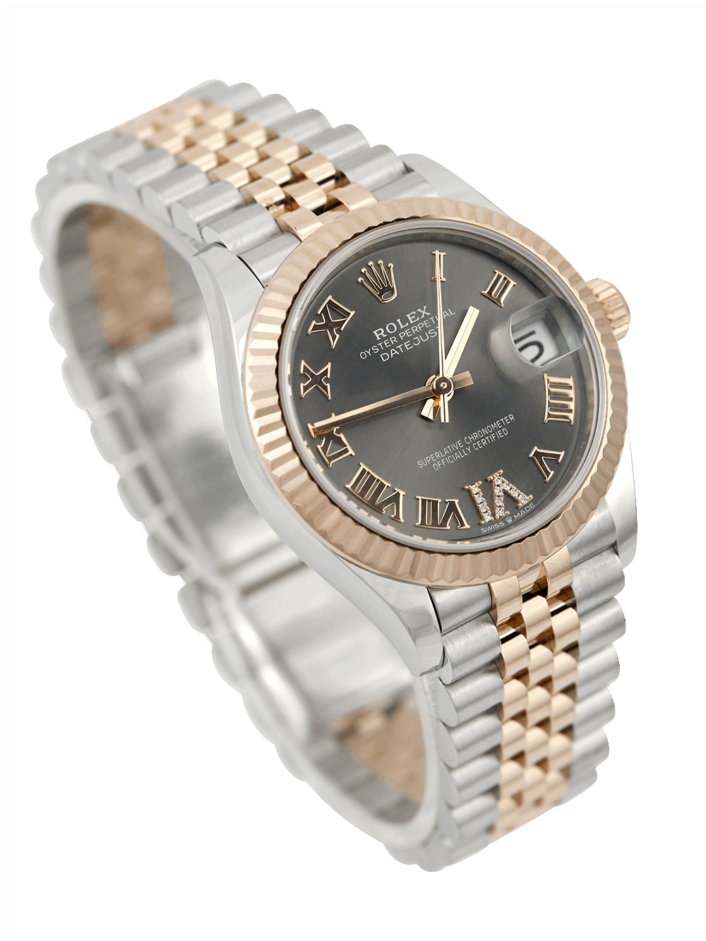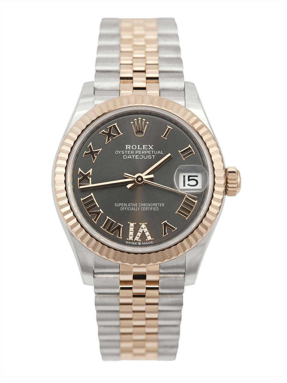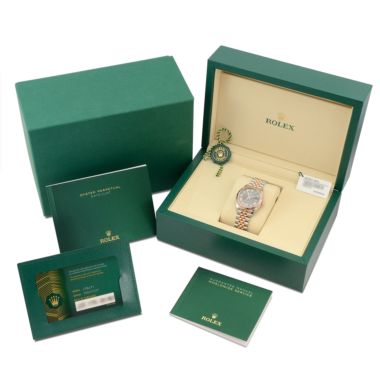 A one previous owner watch in pristine condition (could easily pass as unworn), chronometer certified, automatic movement Rolex Datejust 31 model reference 278271 featuring a slate Roman numeral dial with diamond ‘VI’ housing a date aperture at 3 O’clock surrounded by a rose gold fluted bezel on a full retail length stainless steel and rose gold Rolex Jubilee bracelet.