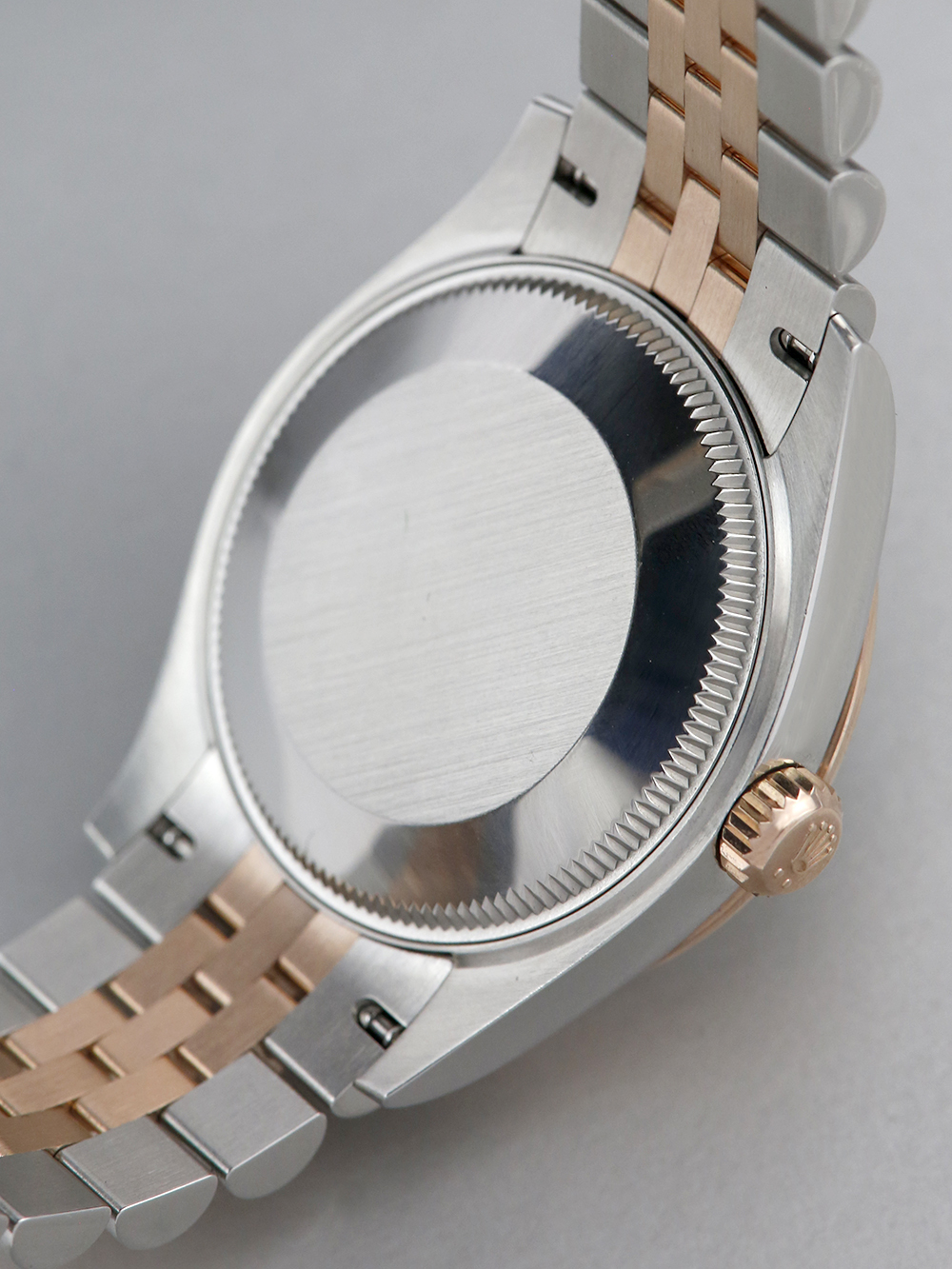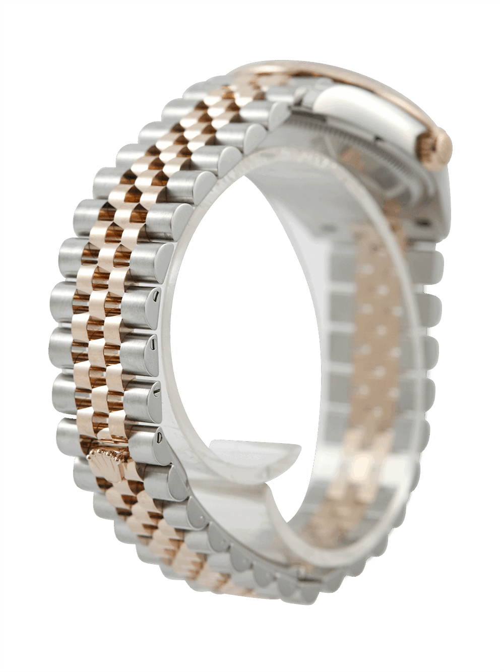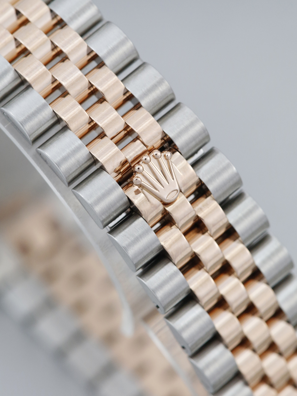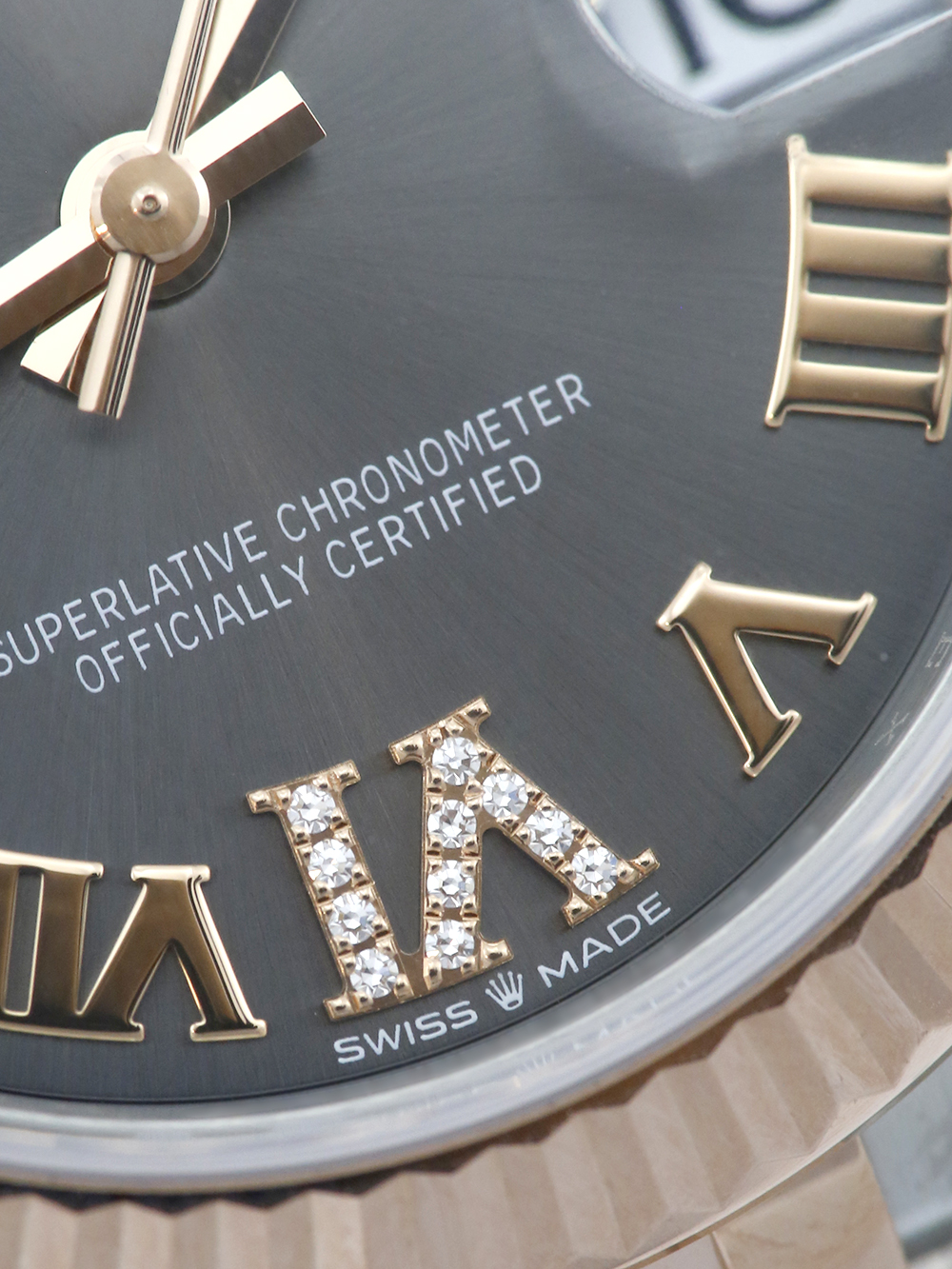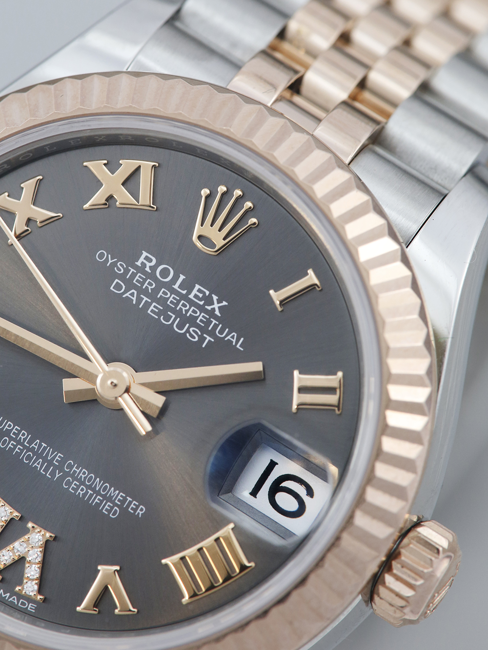 A one previous owner watch in pristine condition (could easily pass as unworn), chronometer certified, automatic movement Rolex Datejust 31 model reference 278271 featuring a slate Roman numeral dial with diamond ‘VI’ housing a date aperture at 3 O’clock surrounded by a rose gold fluted bezel on a full retail length stainless steel and rose gold Rolex Jubilee bracelet.