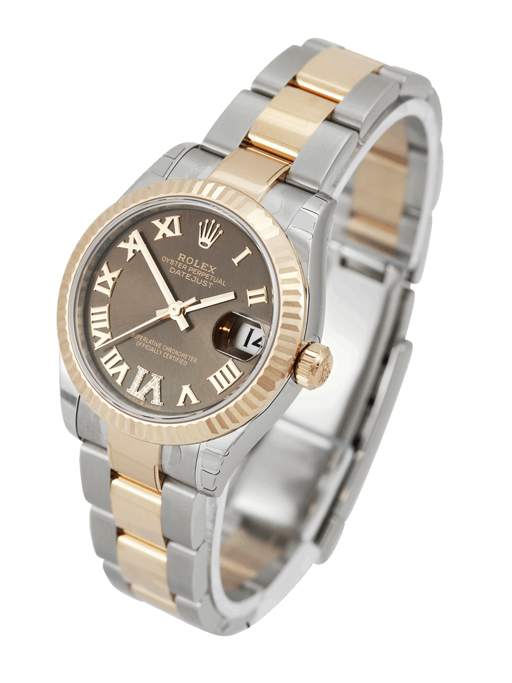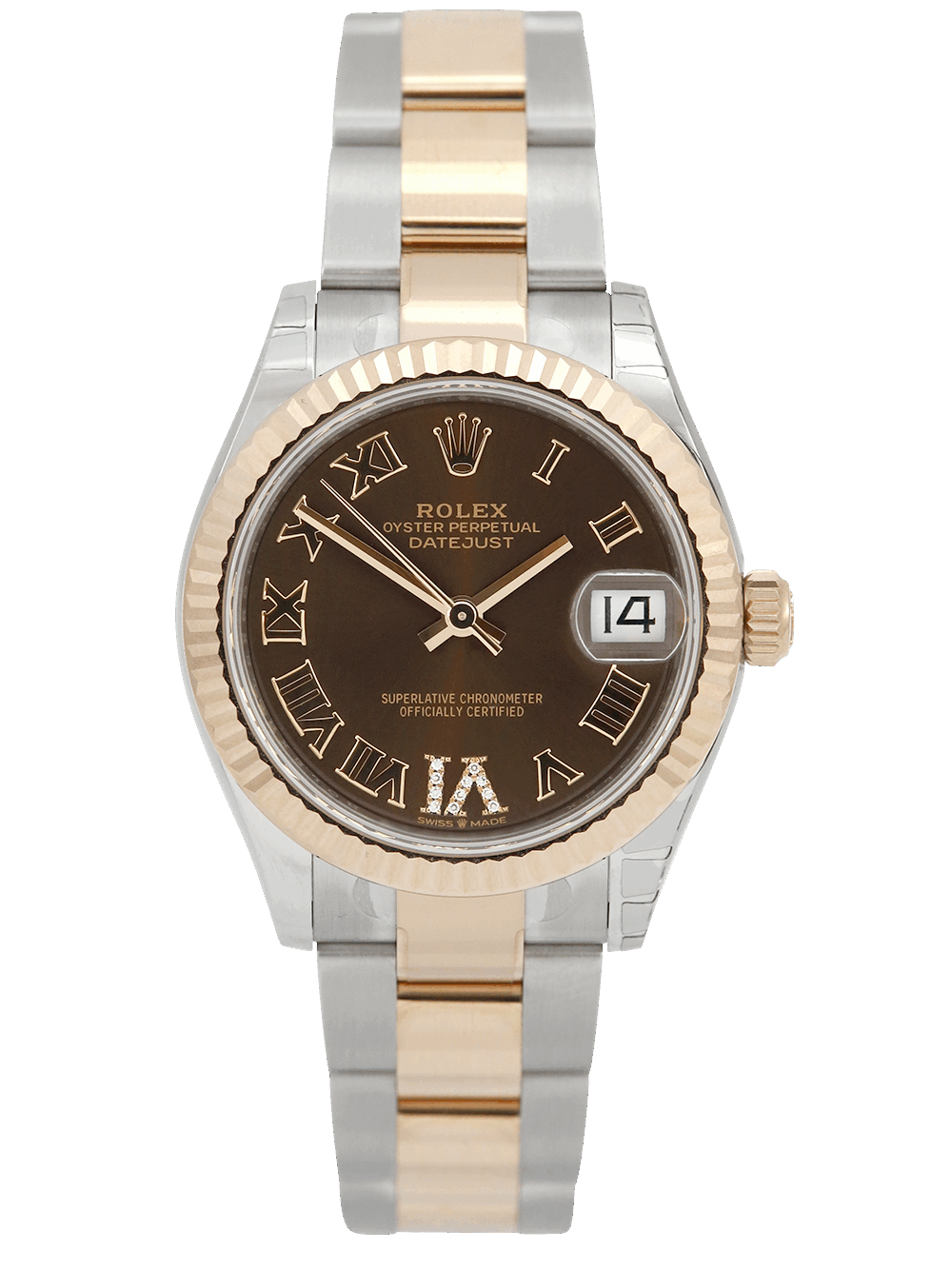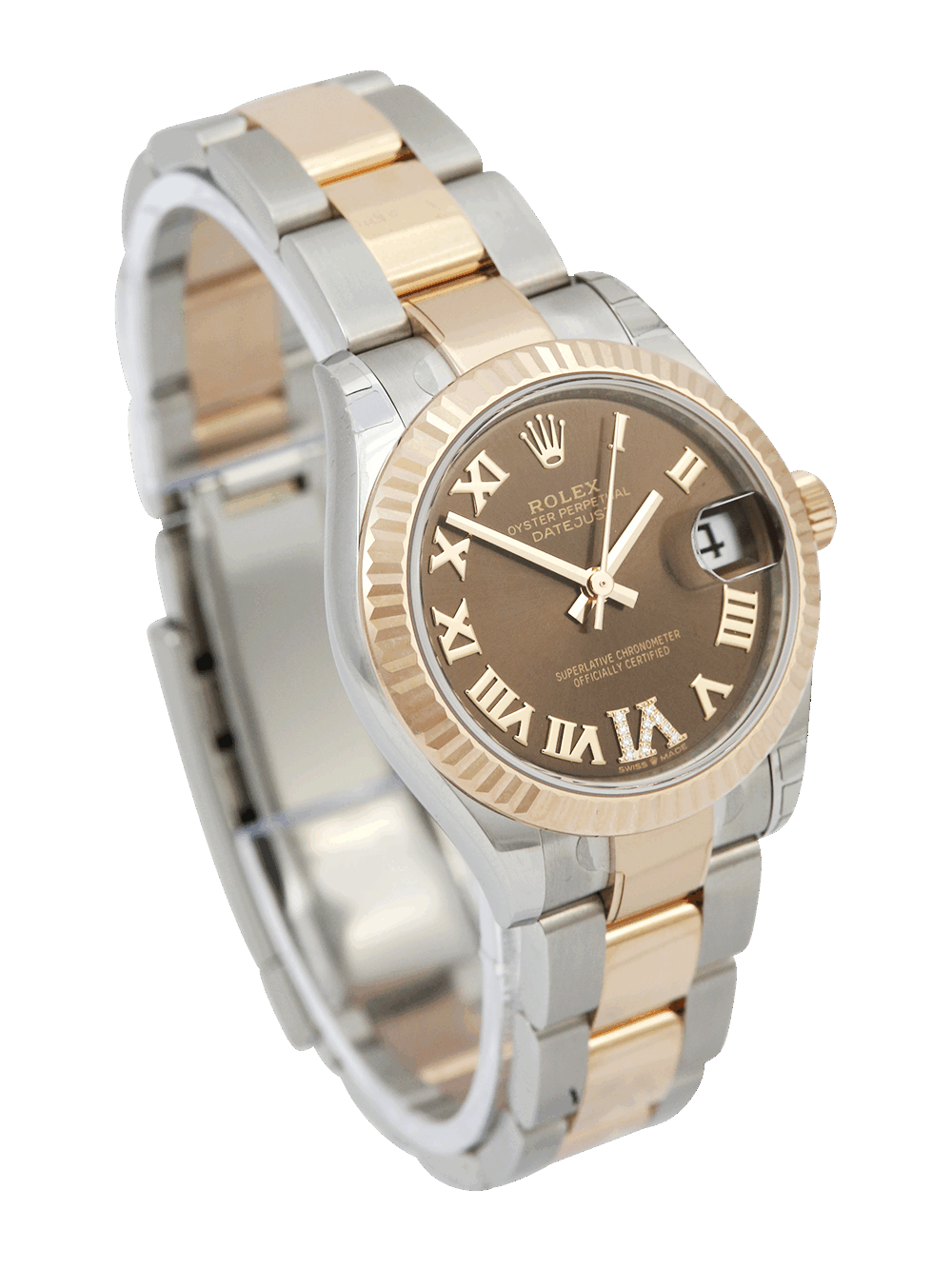 A brand new unworn and unsized, chronometer certified, automatic movement Rolex Datejust 31 model reference 278271 featuring a chocolate brown Roman numeral dial with diamond ‘VI’ housing a date aperture at 3 O’clock surrounded by a rose gold fluted bezel on a full retail length stainless steel and rose gold Rolex Oyster bracelet.