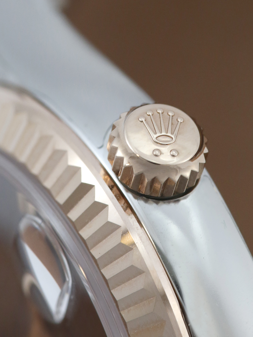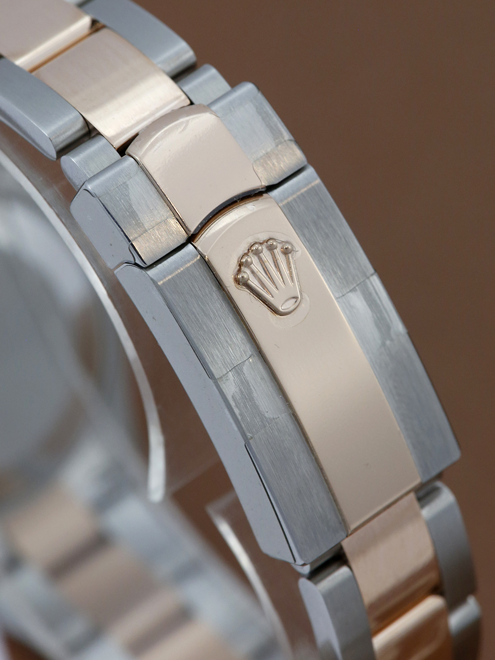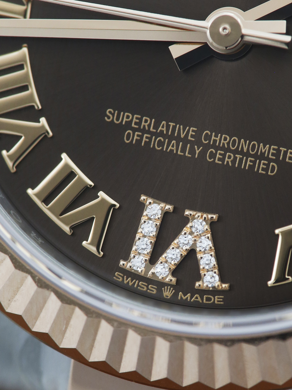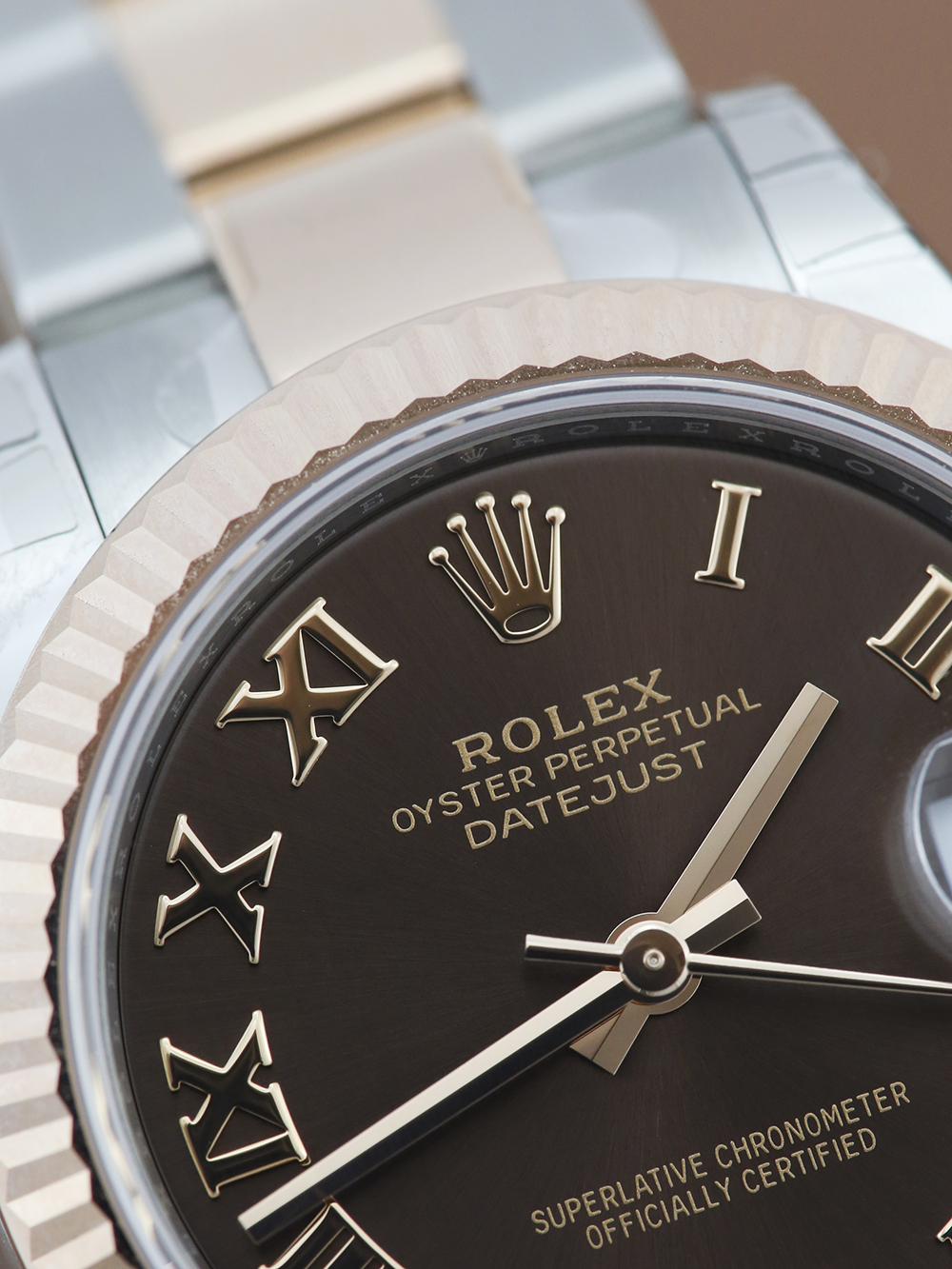 A brand new unworn and unsized, chronometer certified, automatic movement Rolex Datejust 31 model reference 278271 featuring a chocolate brown Roman numeral dial with diamond ‘VI’ housing a date aperture at 3 O’clock surrounded by a rose gold fluted bezel on a full retail length stainless steel and rose gold Rolex Oyster bracelet.