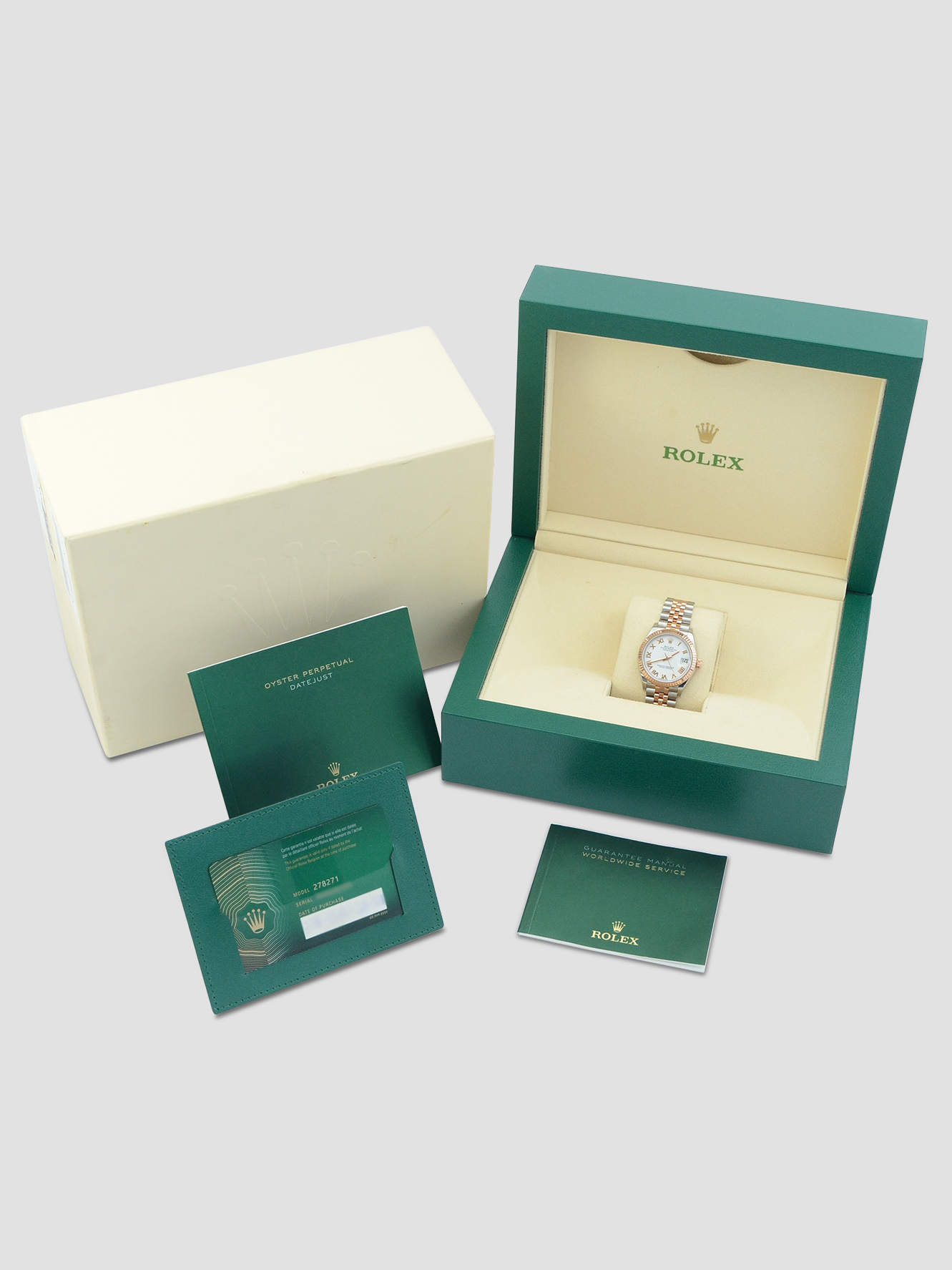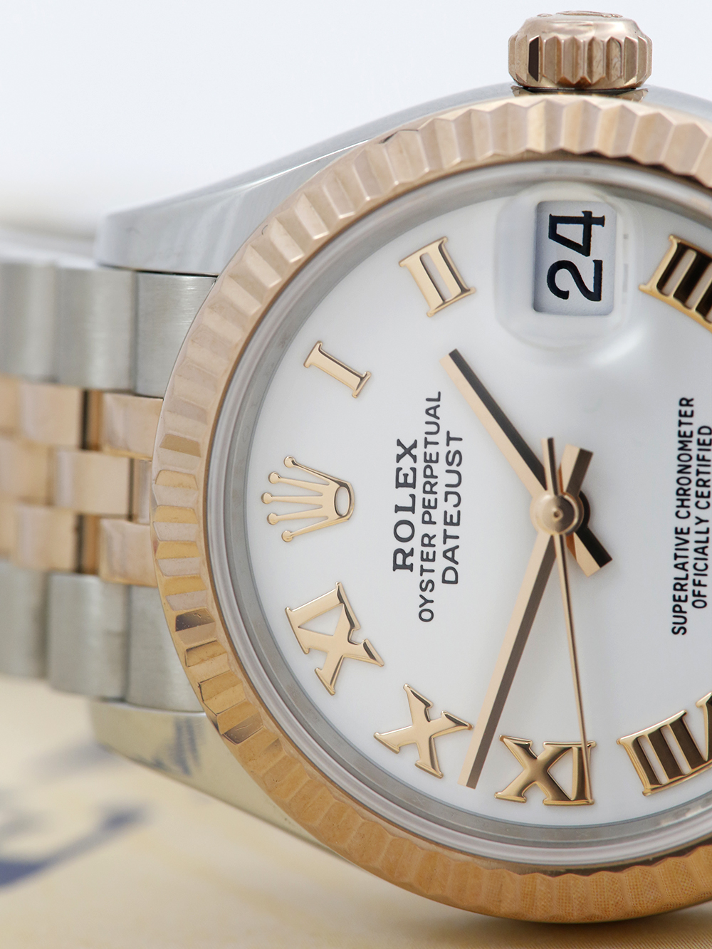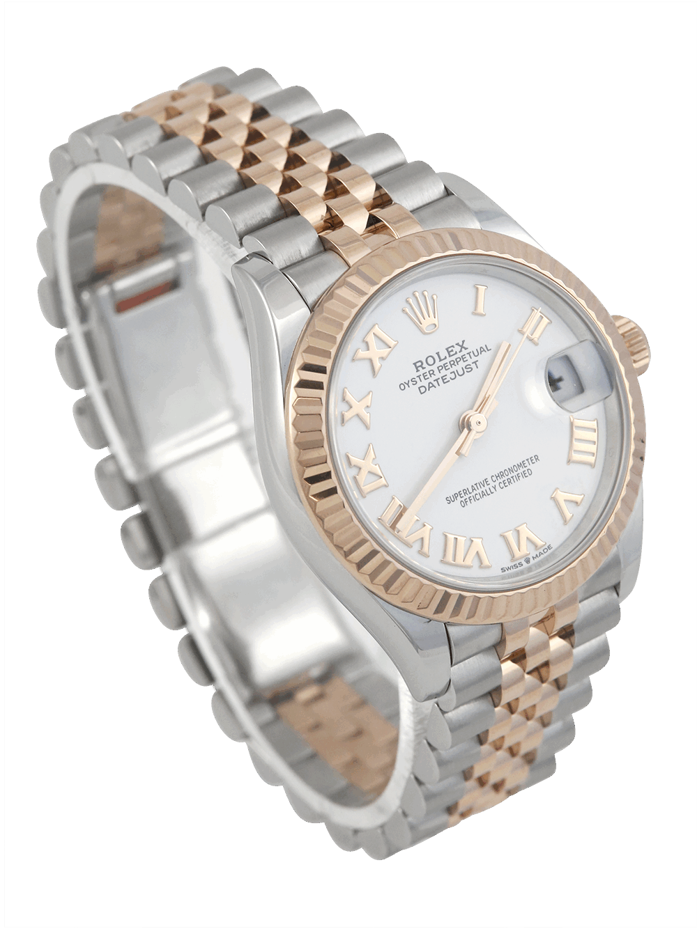 An excellent condition pre-owned 31mm case size Oystersteel and Everose gold Superlative Chronometer, calibre 2236, automatic movement Rolex Datejust 31 model reference M278271-0002 featuring a white dial with rose gold Roman numeral hour markers housing a date aperture at 3 O’clock surrounded by an Everose gold fluted bezel presented on a full retail length Oystersteel and Everose gold Rolex Jubilee bracelet.