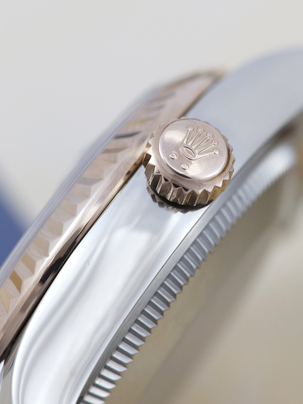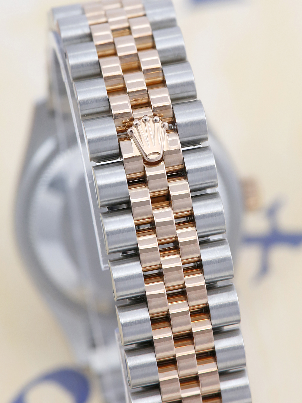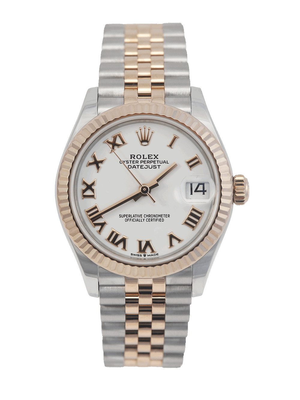 An excellent condition pre-owned 31mm case size Oystersteel and Everose gold Superlative Chronometer, calibre 2236, automatic movement Rolex Datejust 31 model reference M278271-0002 featuring a white dial with rose gold Roman numeral hour markers housing a date aperture at 3 O’clock surrounded by an Everose gold fluted bezel presented on a full retail length Oystersteel and Everose gold Rolex Jubilee bracelet.
