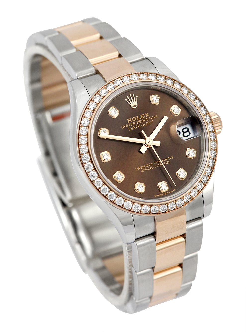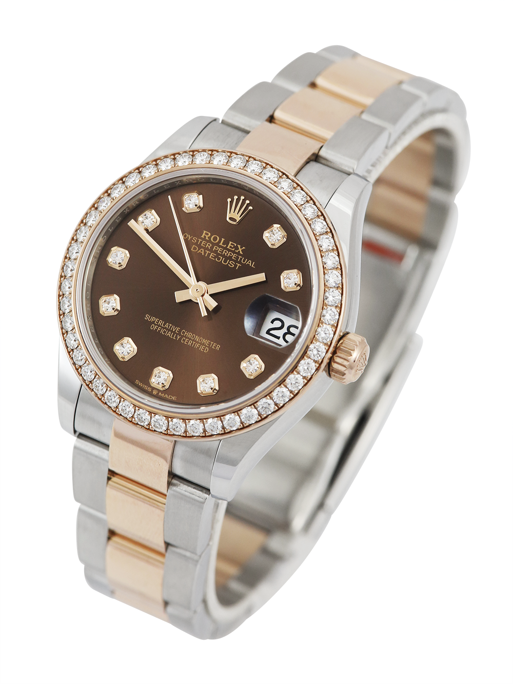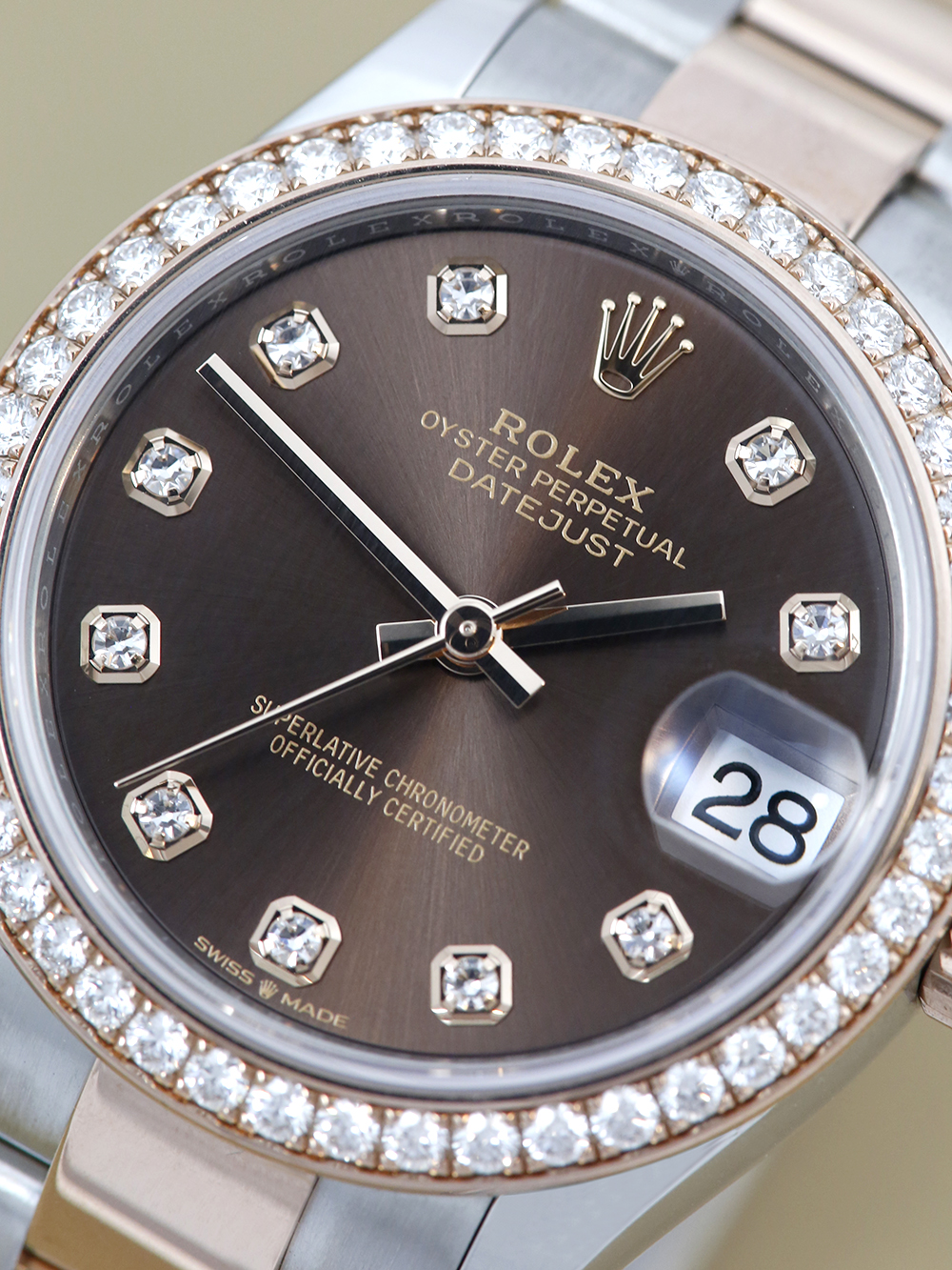 An excellent condition (could easily pass as unworn) a pre-owned stainless steel and rose gold chronometer certified automatic movement 31mm case size Rolex Lady Datejust model reference 278381RBR featuring a chocolate diamond dot dial housing a date aperture at 3 O’clock surrounded by a factory set rose gold diamond bezel on a full retail length stainless steel and rose gold Rolex Oyster bracelet with a folding clasp.