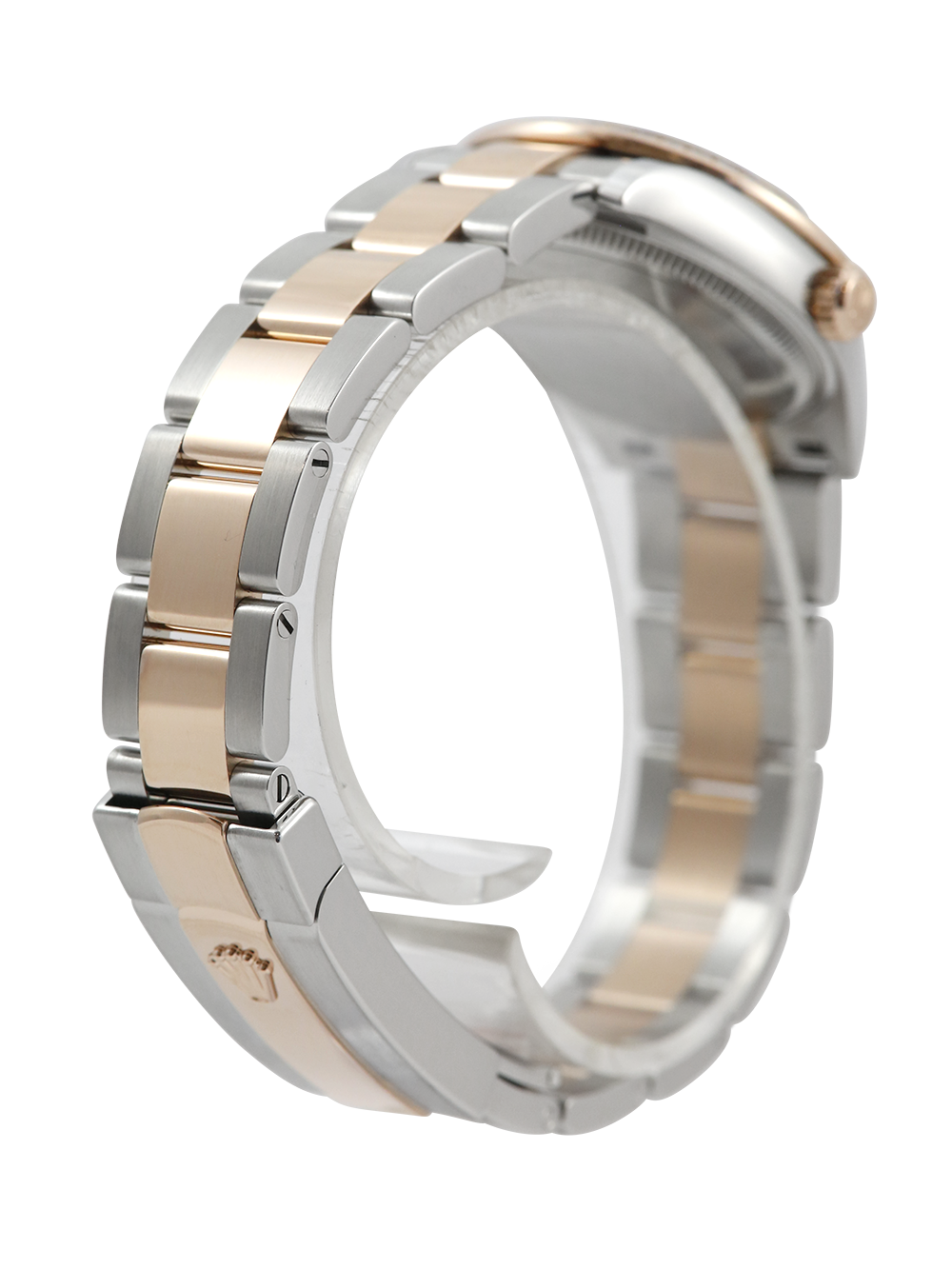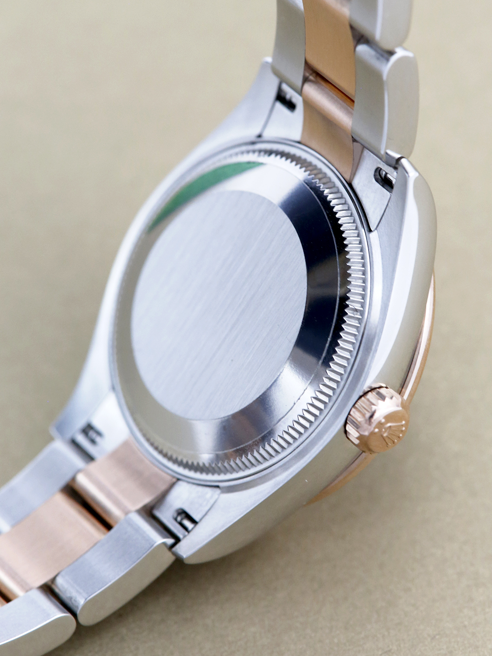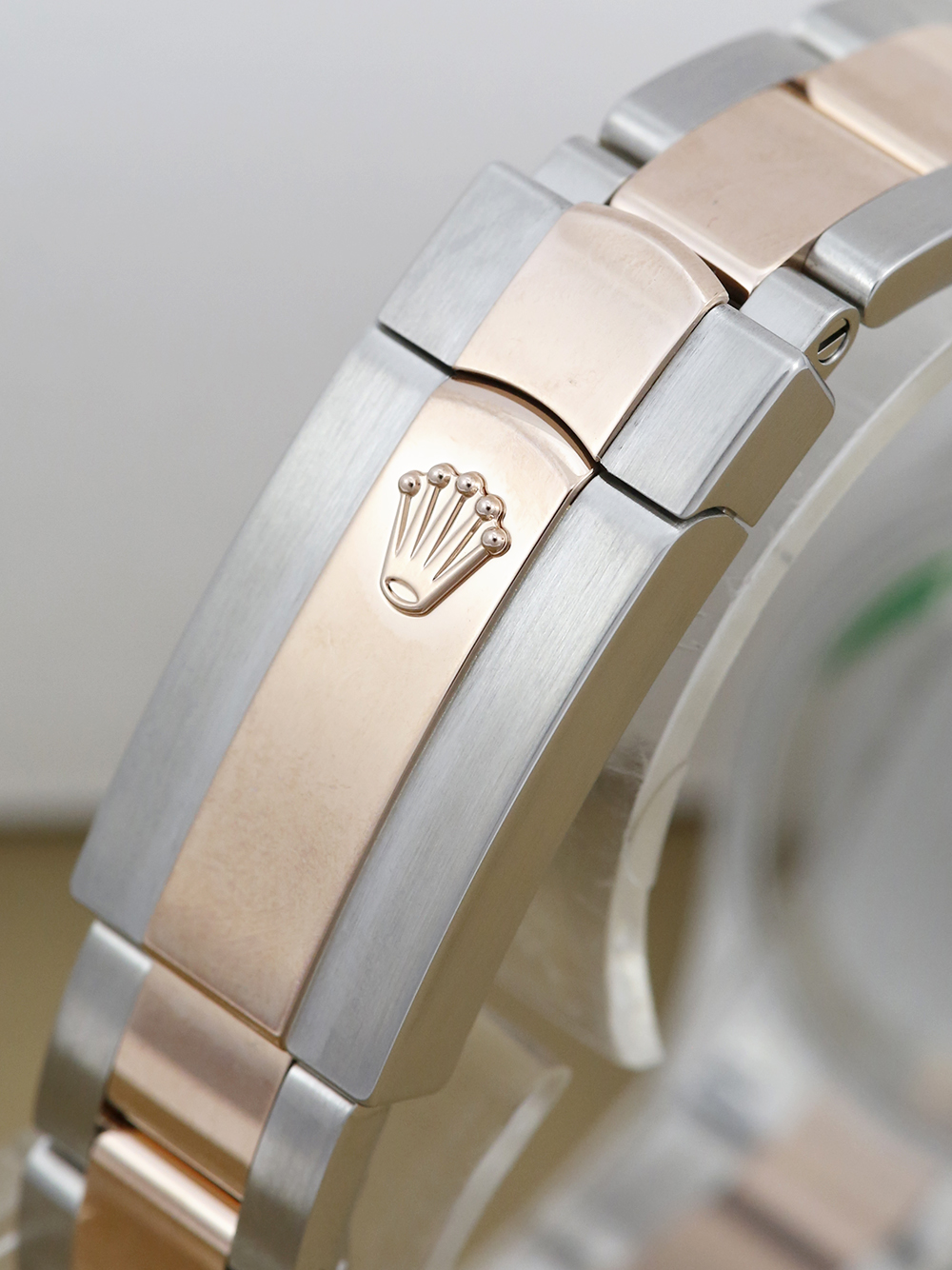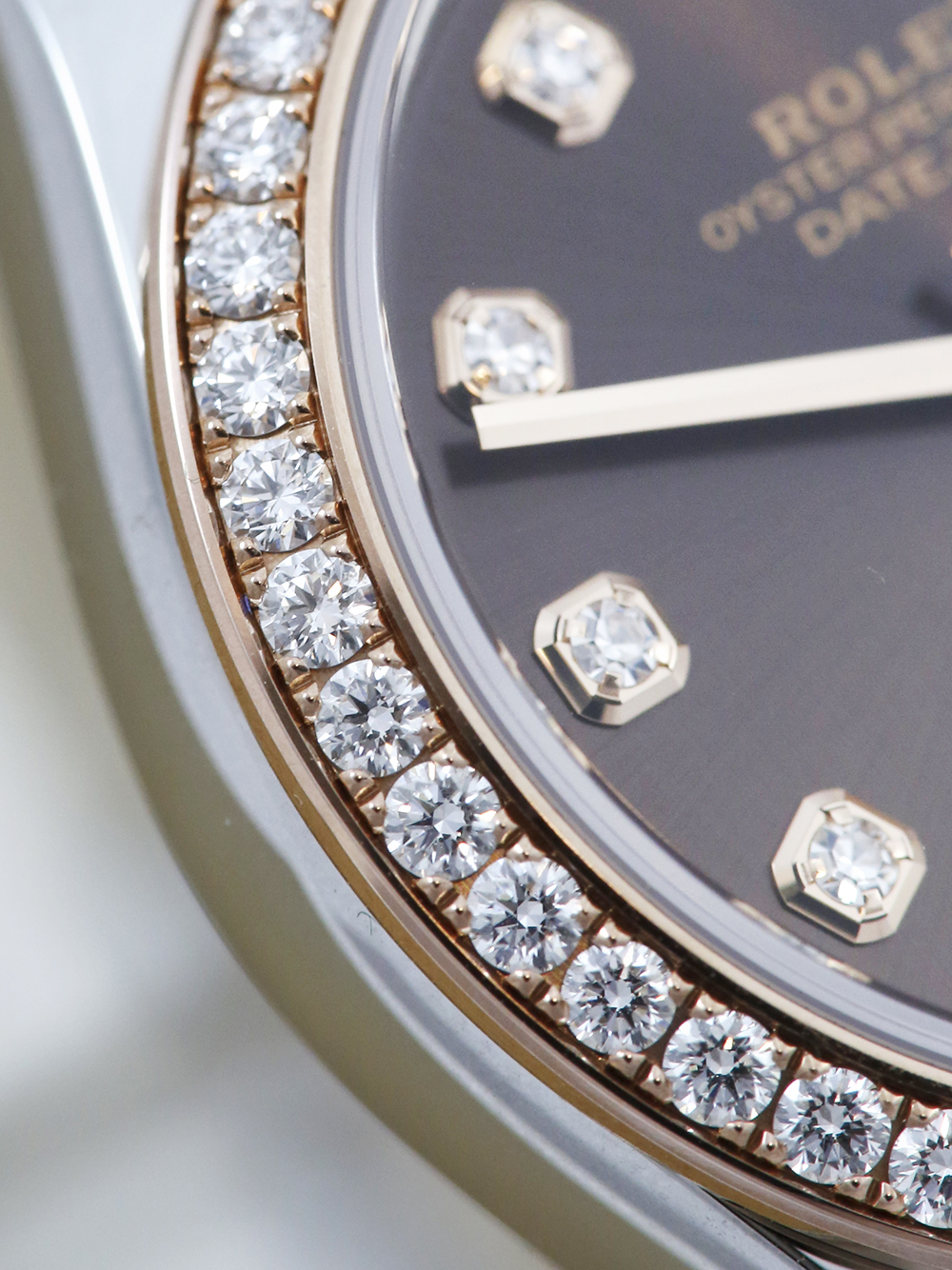 An excellent condition (could easily pass as unworn) a pre-owned stainless steel and rose gold chronometer certified automatic movement 31mm case size Rolex Lady Datejust model reference 278381RBR featuring a chocolate diamond dot dial housing a date aperture at 3 O’clock surrounded by a factory set rose gold diamond bezel on a full retail length stainless steel and rose gold Rolex Oyster bracelet with a folding clasp.