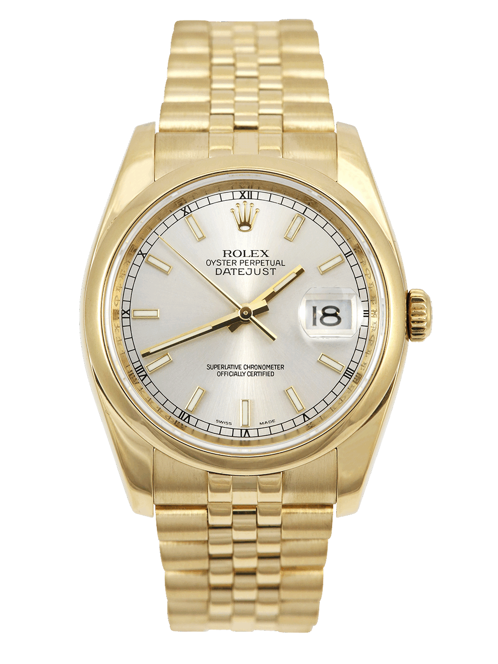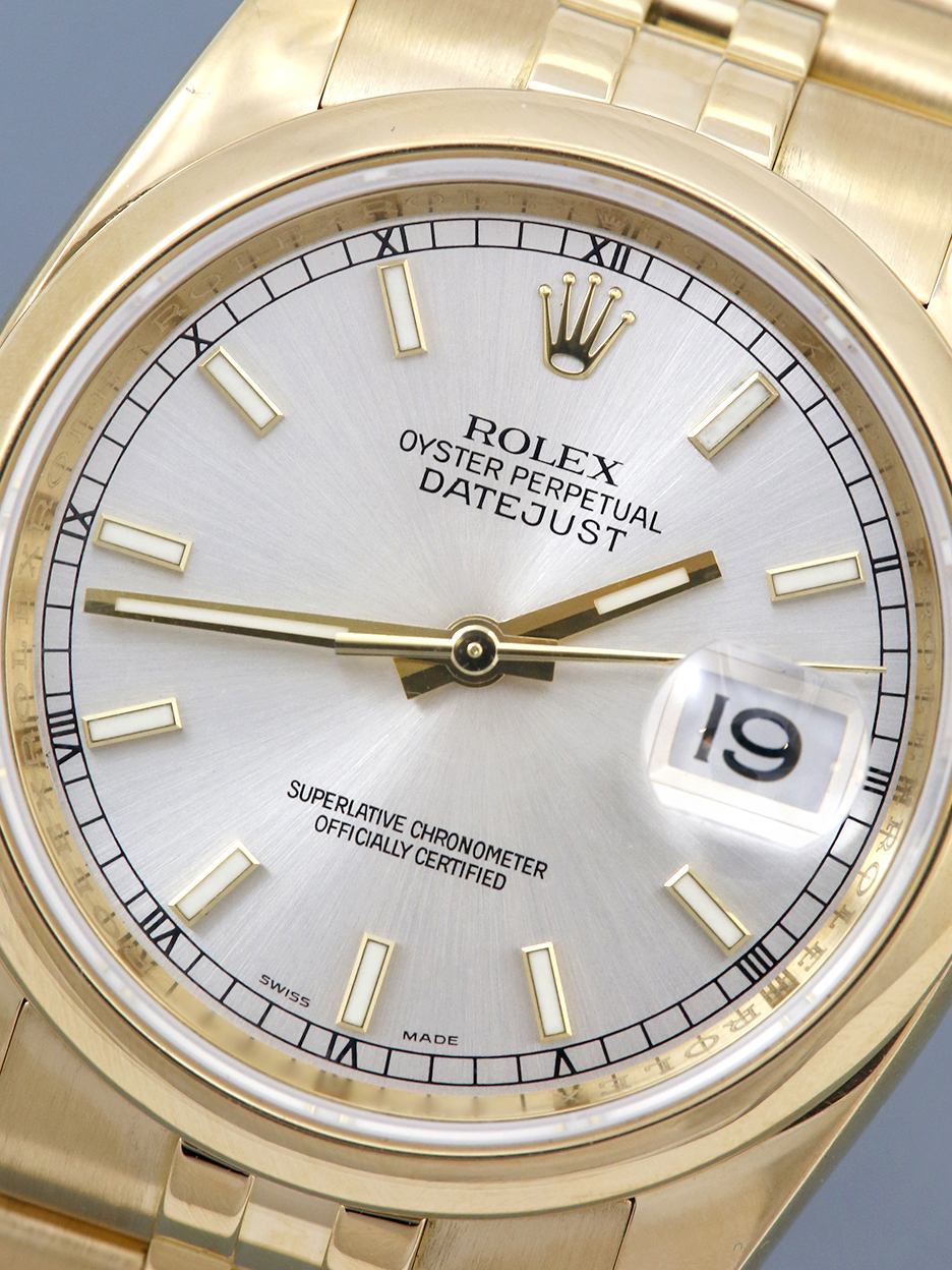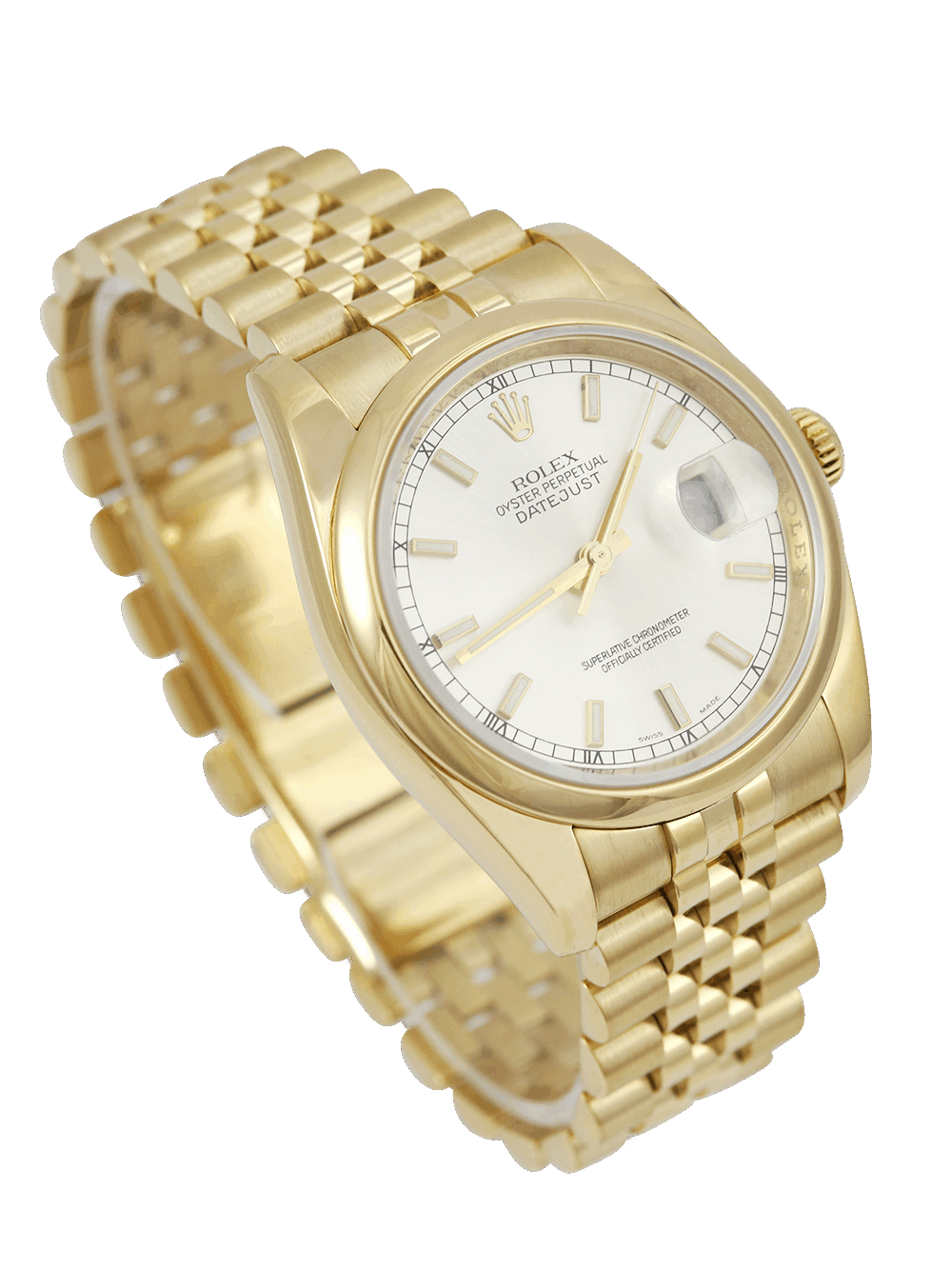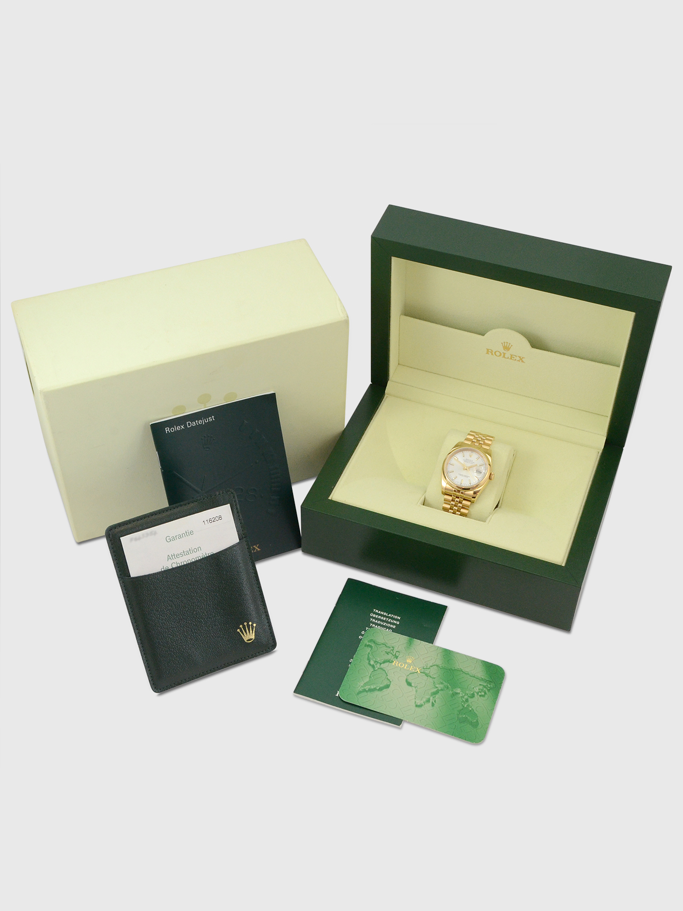 A preowned in excellent condition 36mm yellow gold Rolex Datejust model reference 116208 featuring a silver baton dial housing a date aperture at 3 O’clock with external Cyclops surrounded by a smooth yellow gold bezel. This particular watch comes on a full retail length yellow gold Rolex Jubilee bracelet.