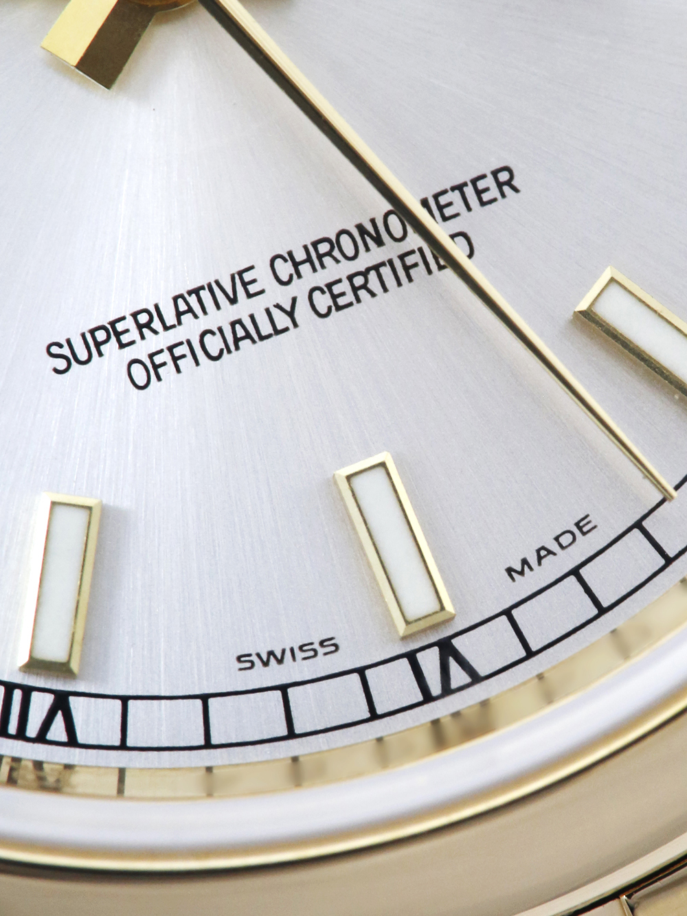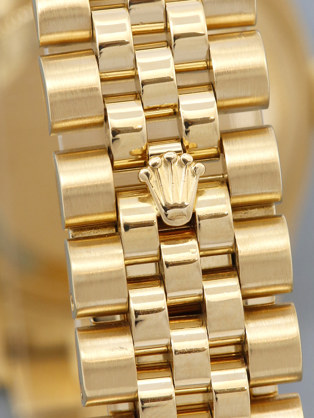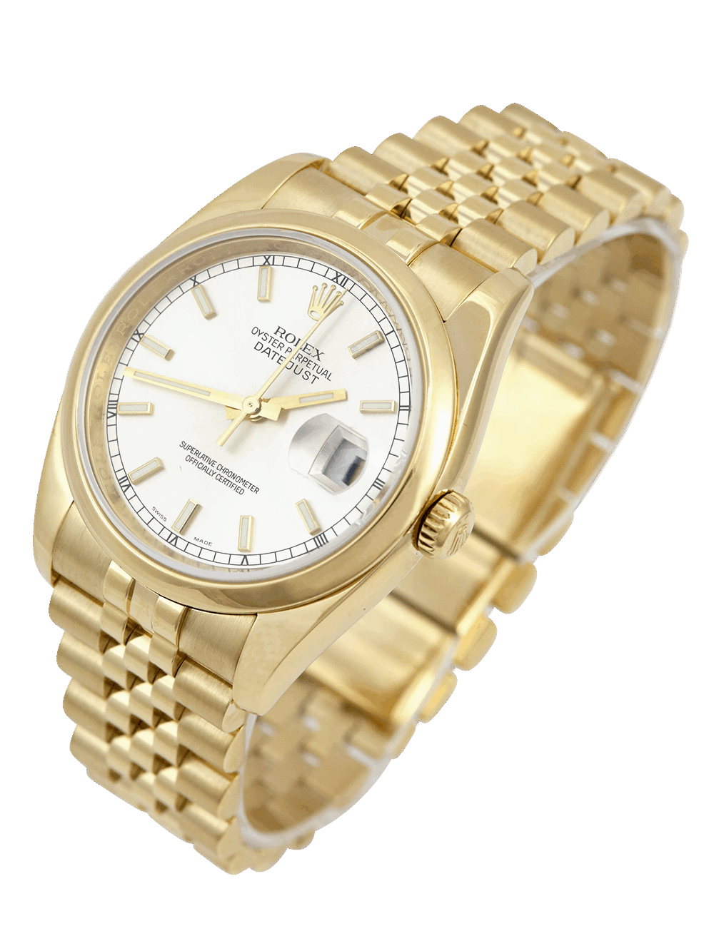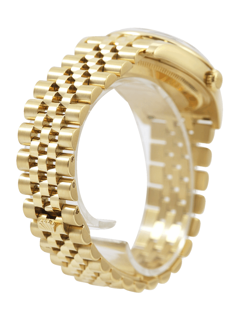 A preowned in excellent condition 36mm yellow gold Rolex Datejust model reference 116208 featuring a silver baton dial housing a date aperture at 3 O’clock with external Cyclops surrounded by a smooth yellow gold bezel. This particular watch comes on a full retail length yellow gold Rolex Jubilee bracelet.