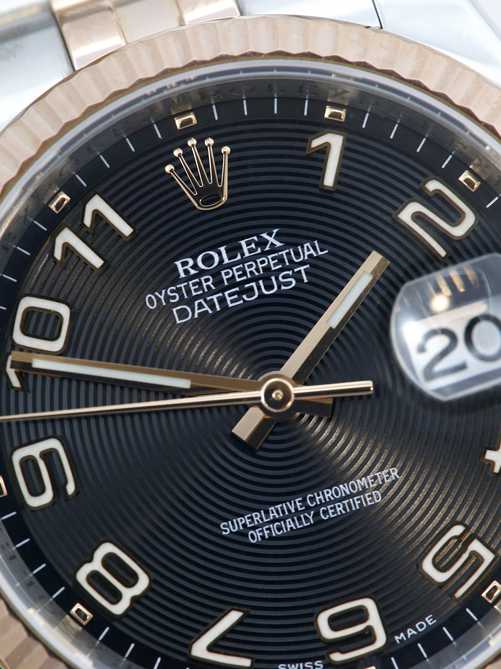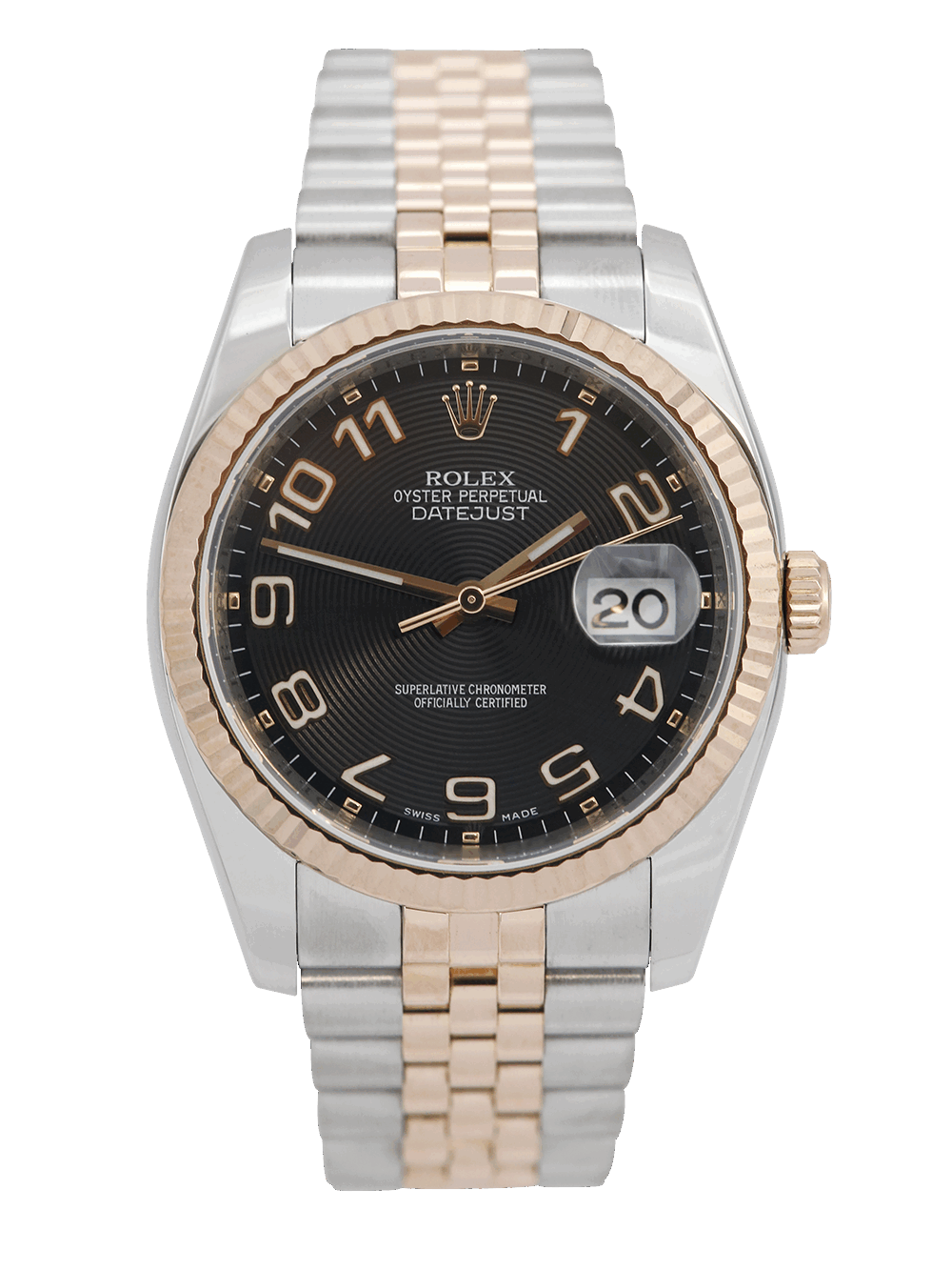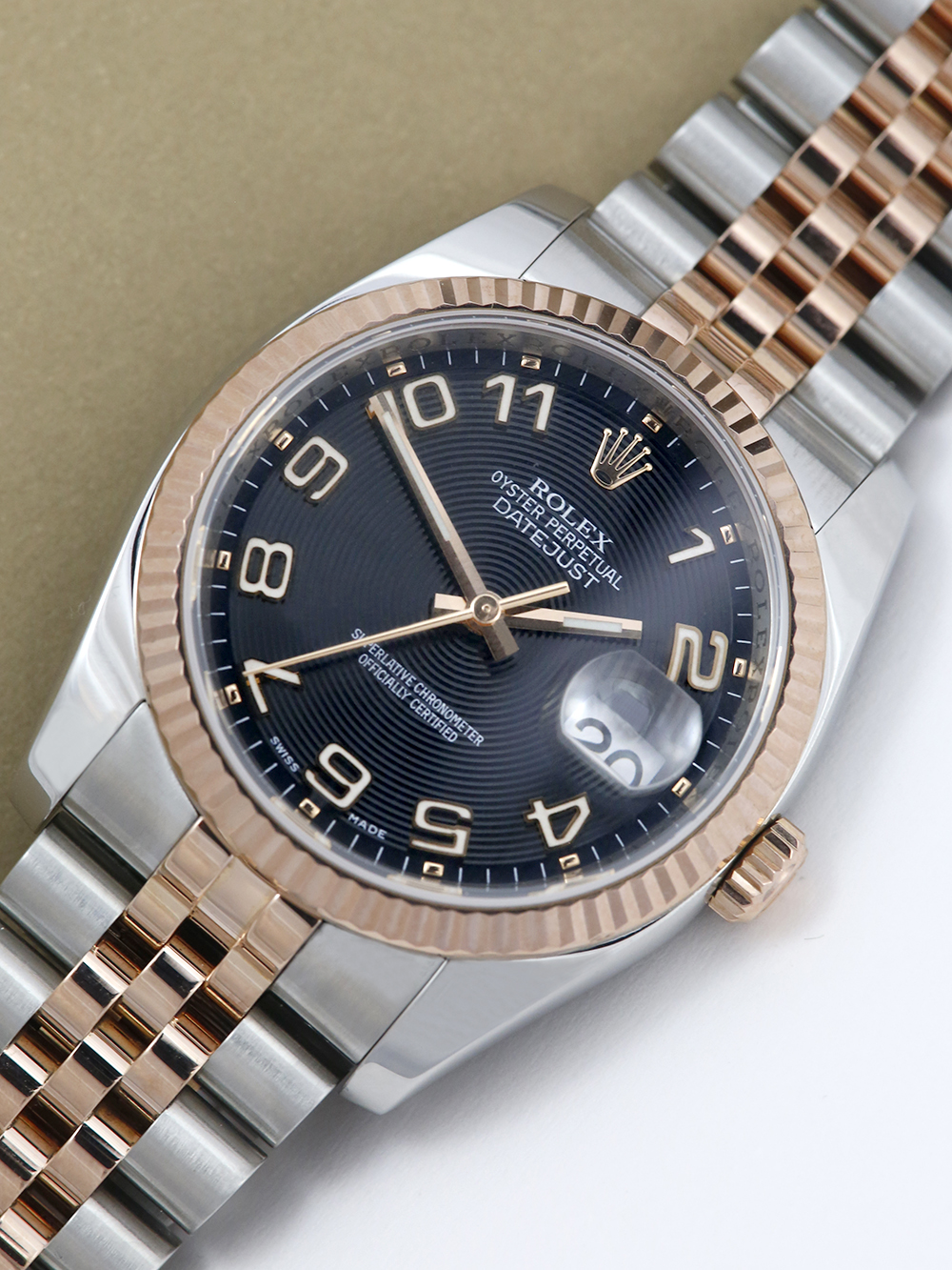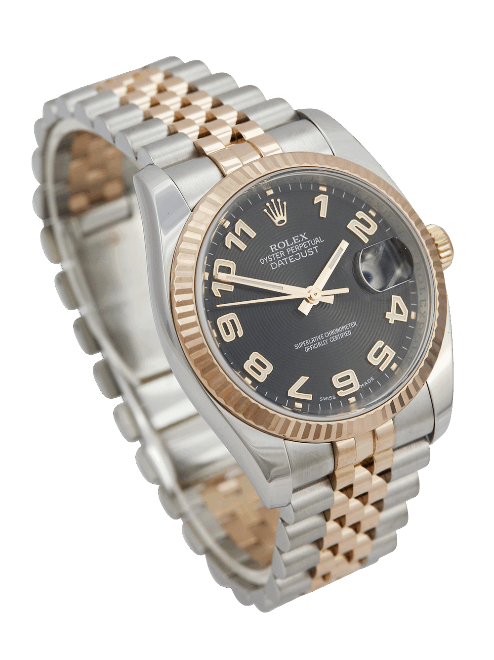 An excellent condition pre-owned stainless steel & rose gold chronometer certified automatic movement 36mm case size Rolex Datejust model reference 116231 featuring a black concentric Roman numeral dial housing a date aperture at 3 O’clock surrounded by a rose gold fluted bezel on a full retail length bi-metal stainless steel and rose gold Rolex Jubilee bracelet.