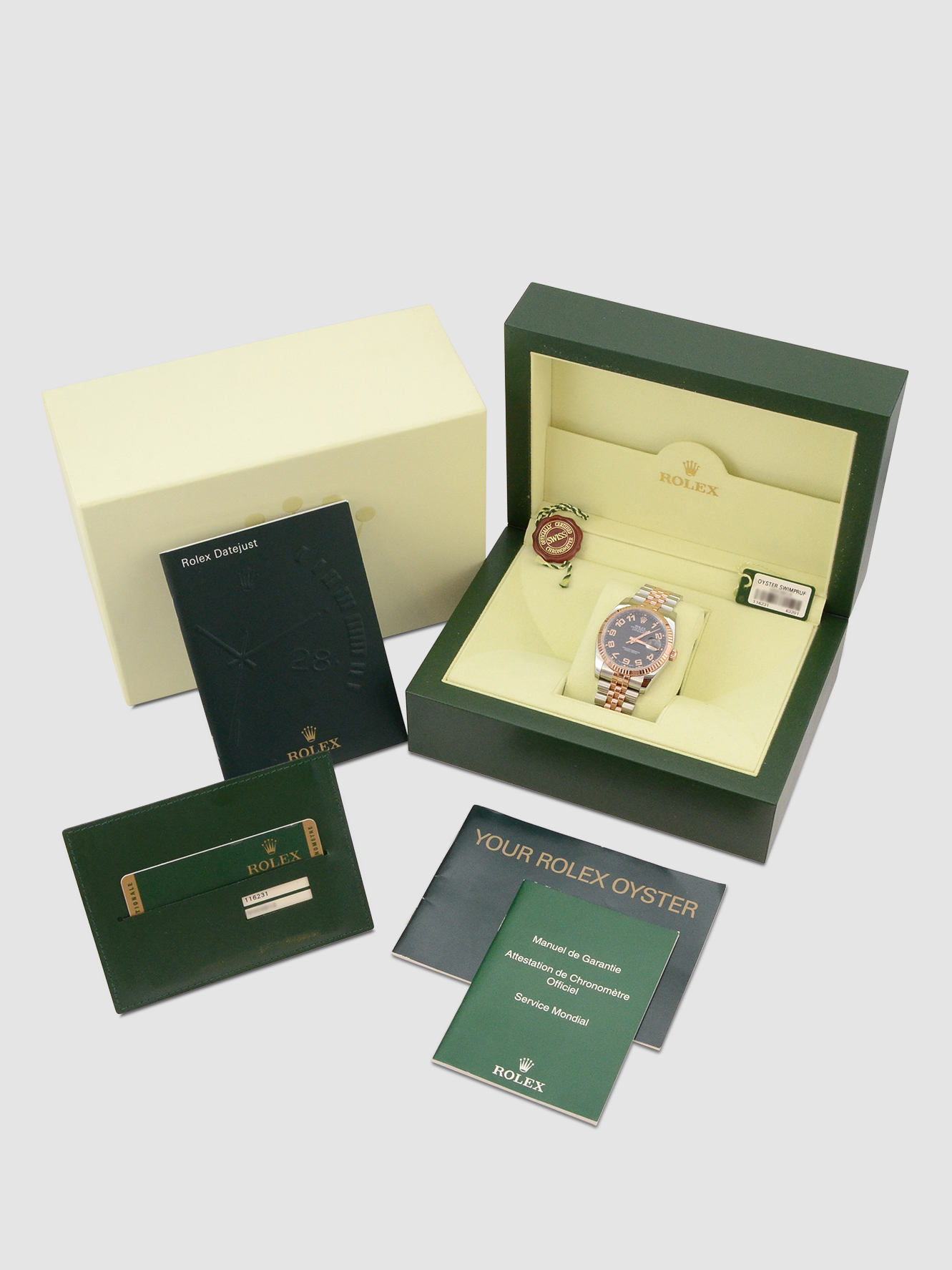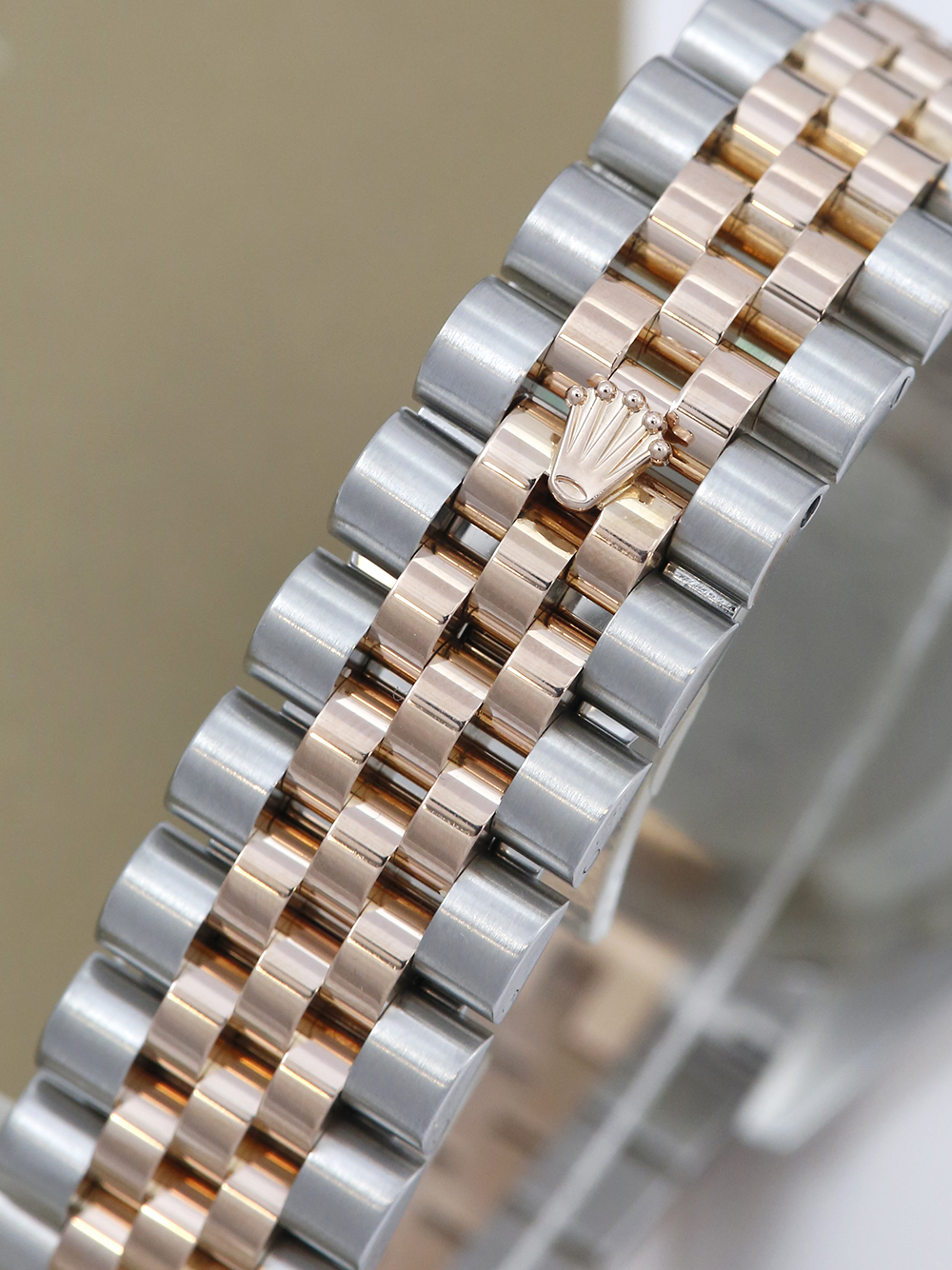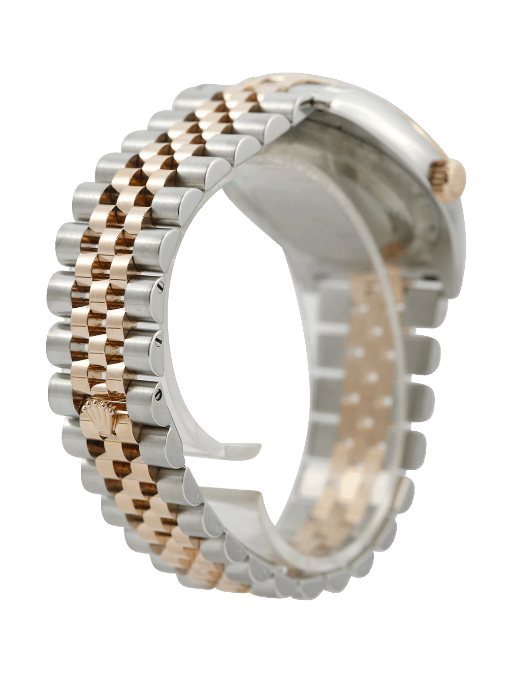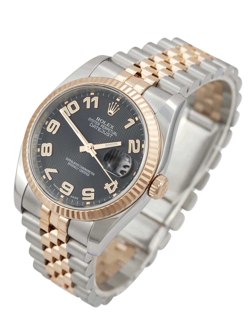 An excellent condition pre-owned stainless steel & rose gold chronometer certified automatic movement 36mm case size Rolex Datejust model reference 116231 featuring a black concentric Roman numeral dial housing a date aperture at 3 O’clock surrounded by a rose gold fluted bezel on a full retail length bi-metal stainless steel and rose gold Rolex Jubilee bracelet.
