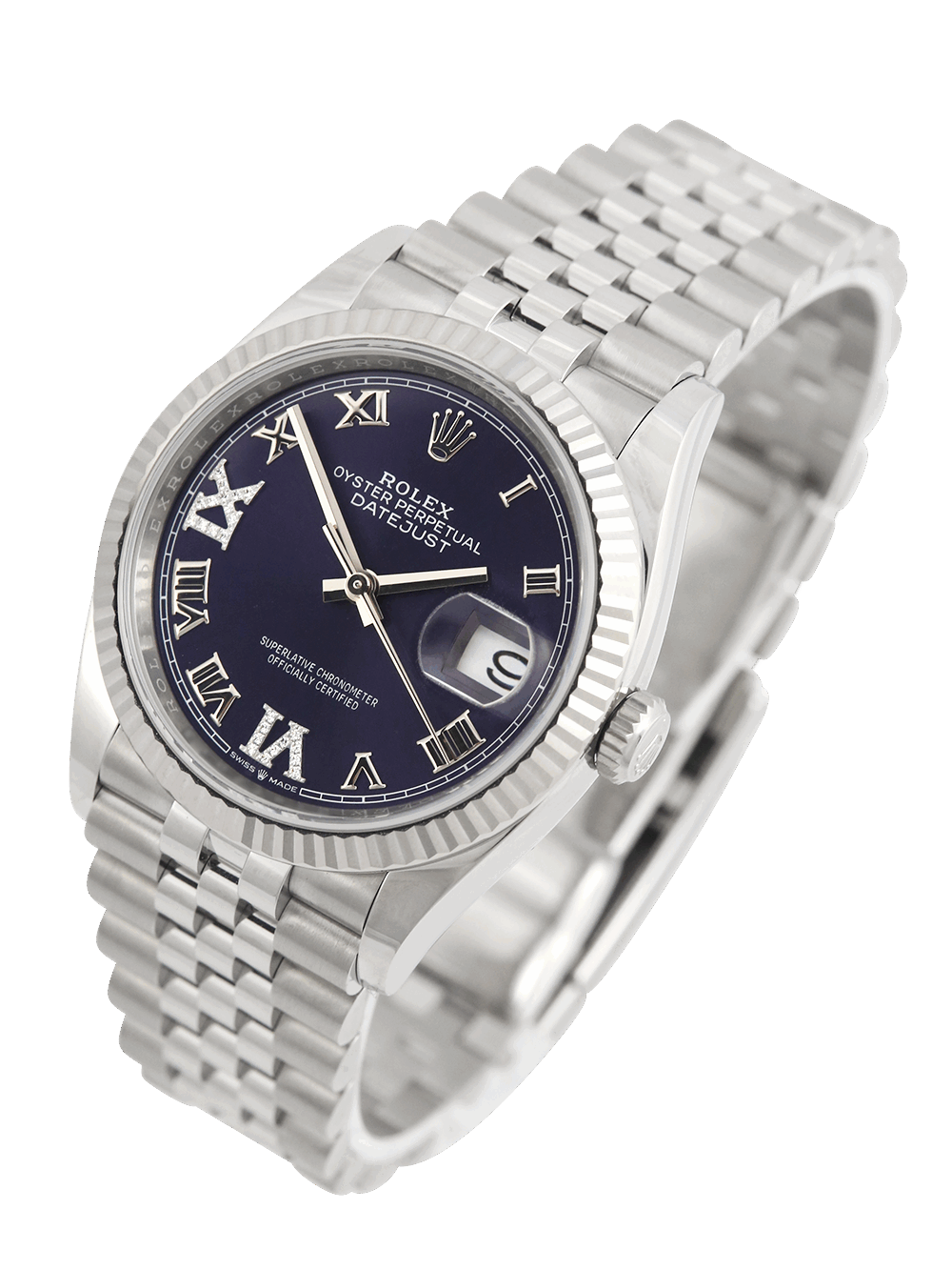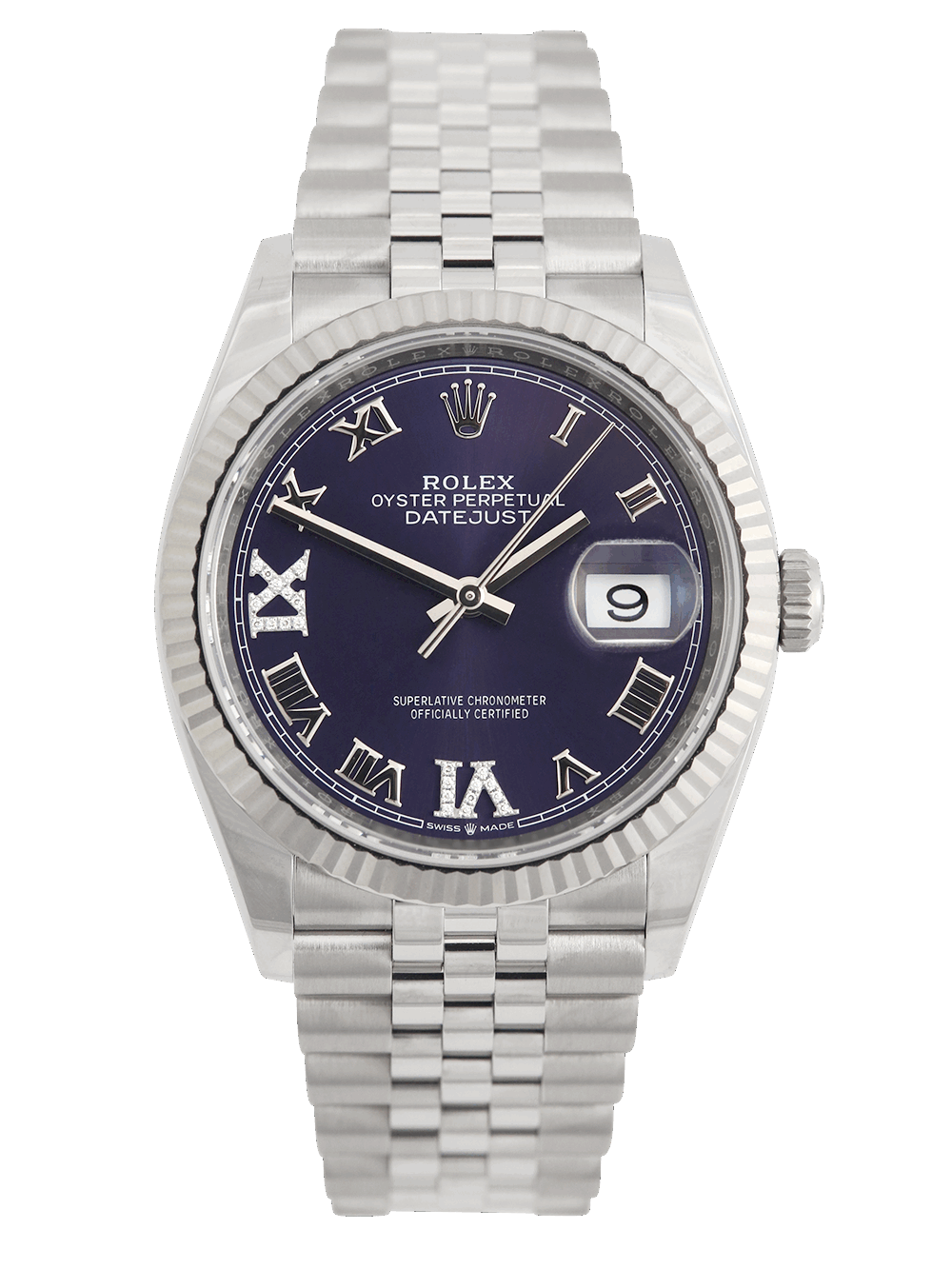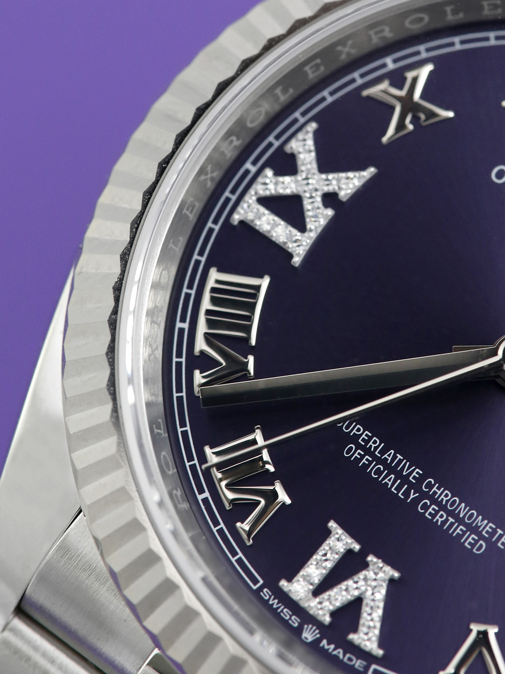 A brand new, unworn superlative chronometer rated automatic movement Rolex Datejust 126234. Featuring a 36mm stainless steel case, housing a purple roman numeral dial featuring diamond set VI and IX with a date aperture at 3 o’clock and an external cyclops placed upon the sapphire crystal. The dial is surrounded by the highly desirable white gold fluted bezel. Presented on a full retail length stainless steel Rolex Jubilee bracelet.