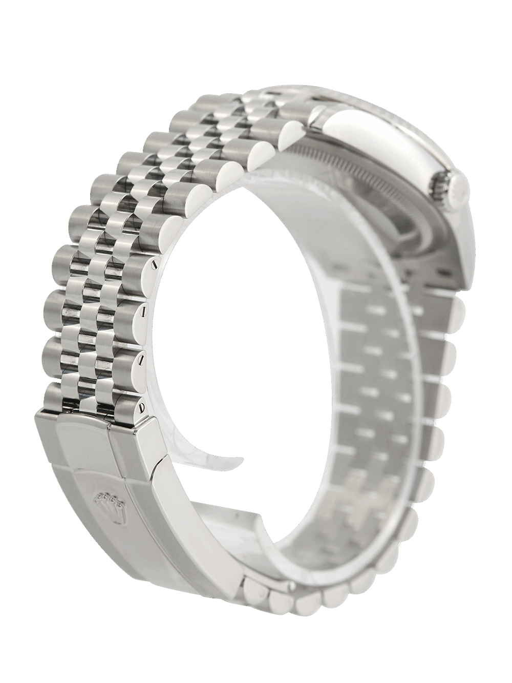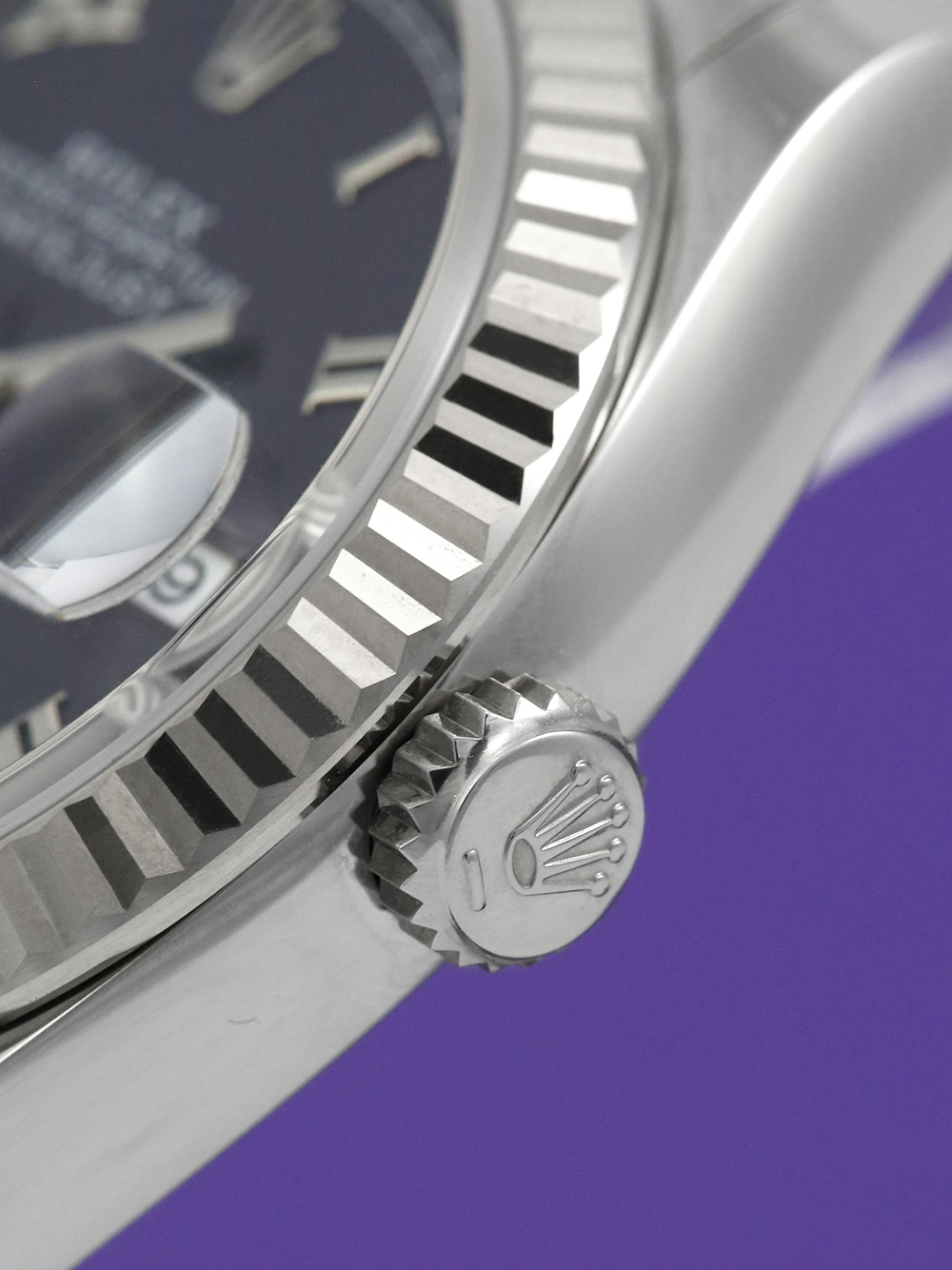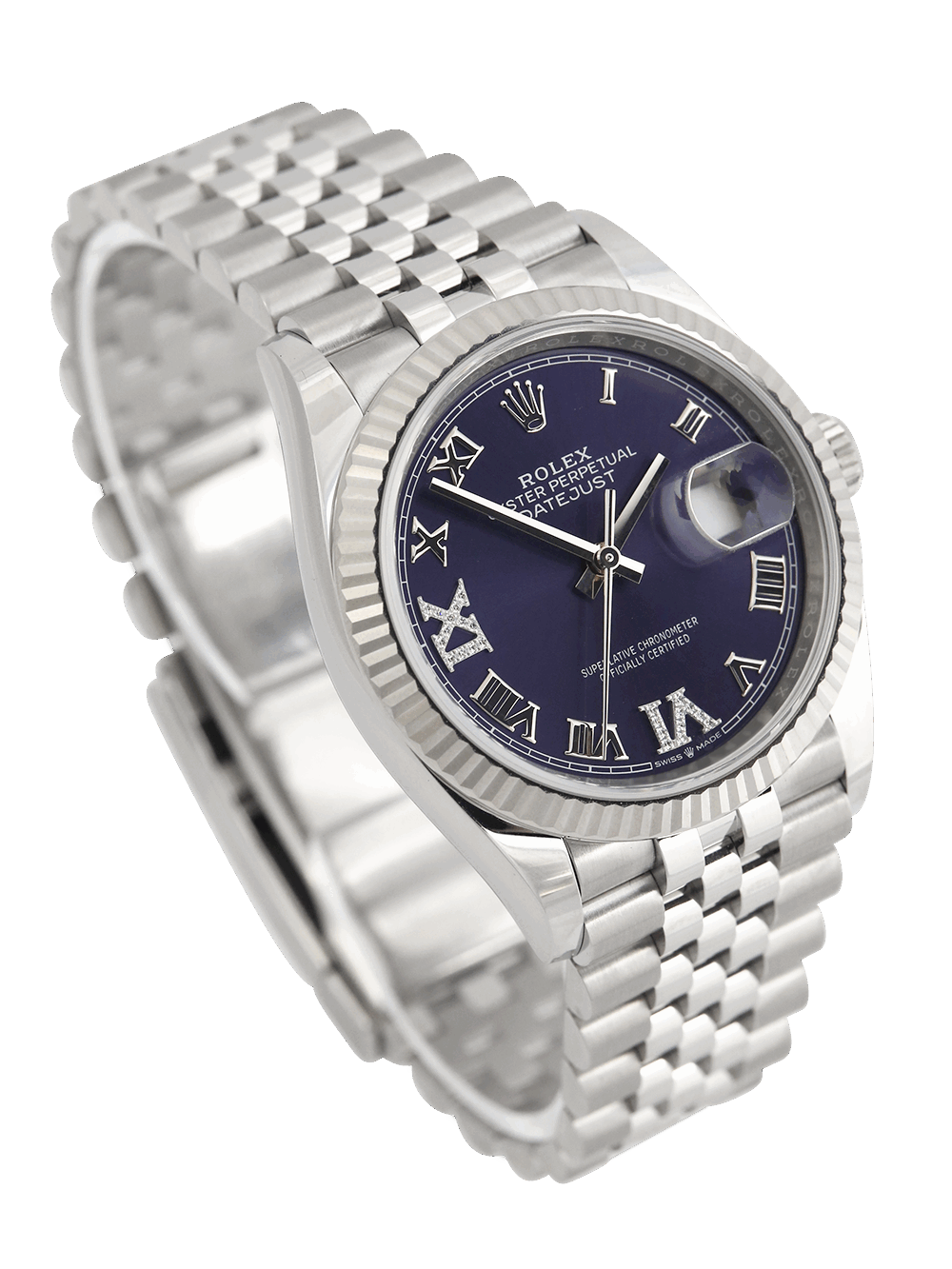 A brand new, unworn superlative chronometer rated automatic movement Rolex Datejust 126234. Featuring a 36mm stainless steel case, housing a purple roman numeral dial featuring diamond set VI and IX with a date aperture at 3 o’clock and an external cyclops placed upon the sapphire crystal. The dial is surrounded by the highly desirable white gold fluted bezel. Presented on a full retail length stainless steel Rolex Jubilee bracelet.