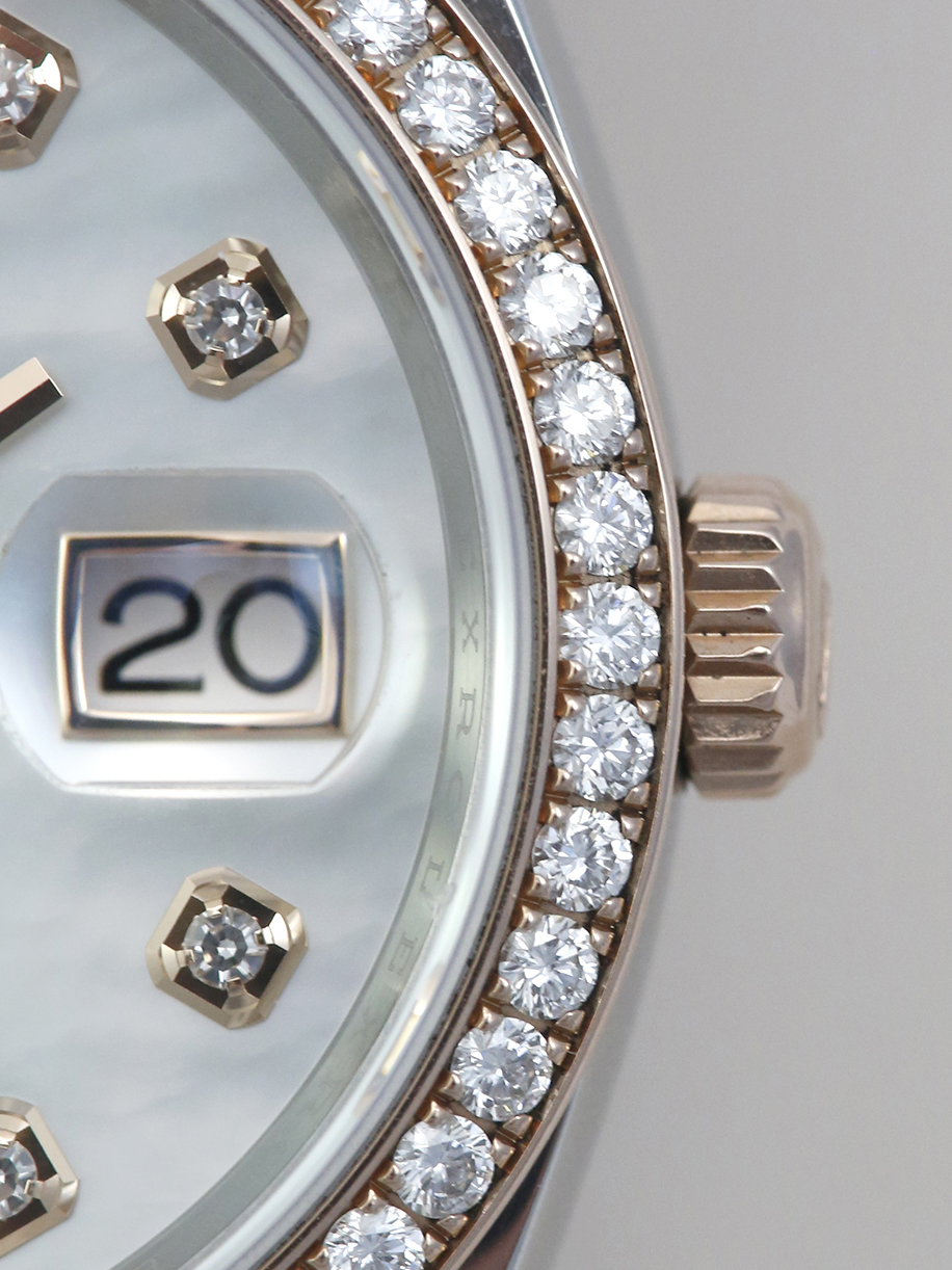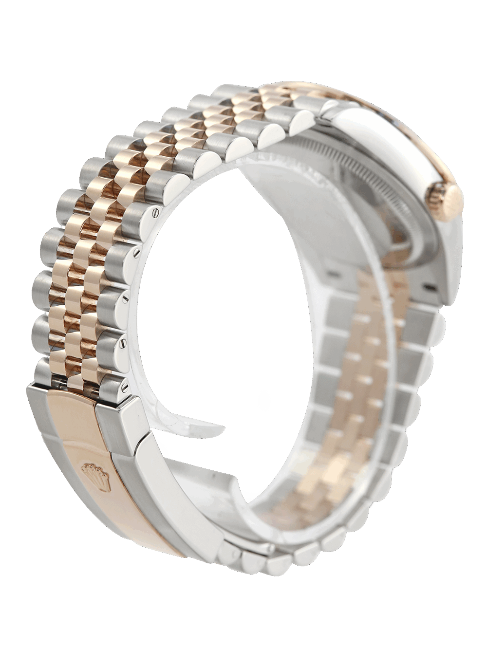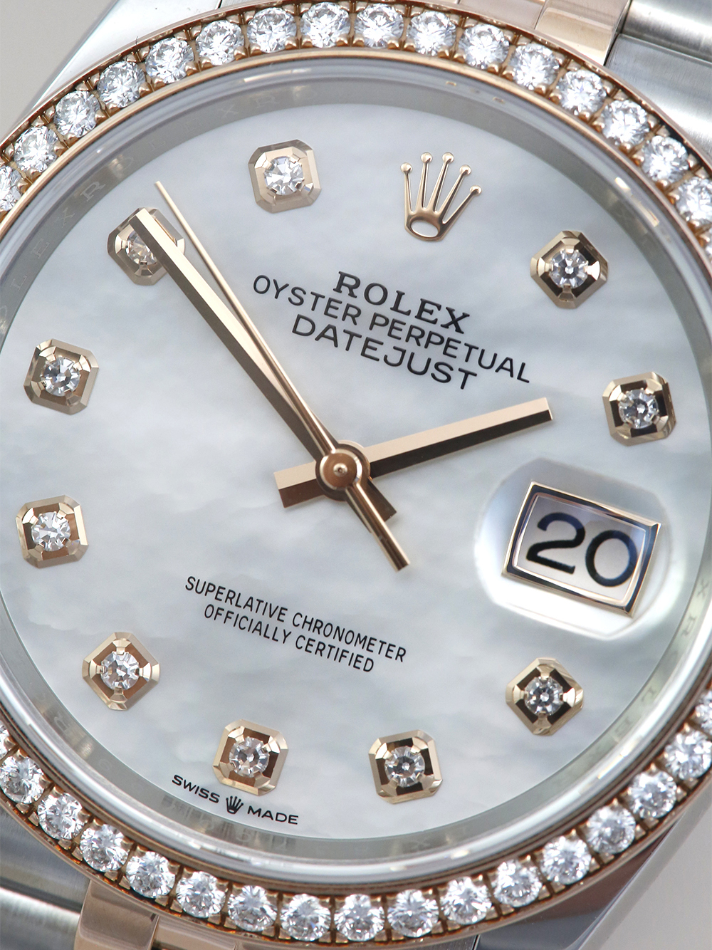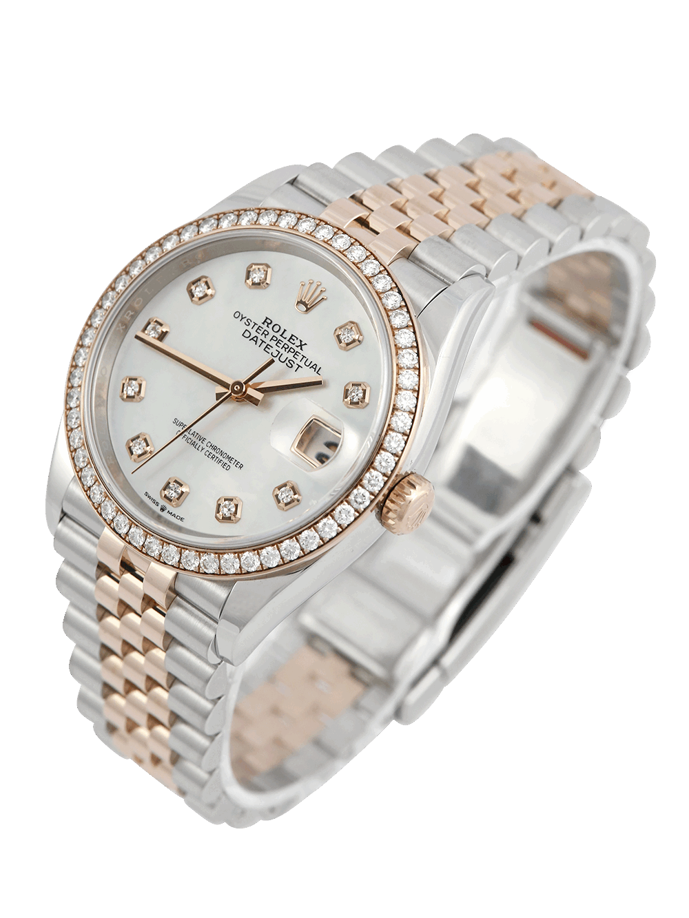A previously owned in as close to brand new as possible a stainless steel and everose gold chronometer certified automatic calibre 3235 movement 36mm case size Rolex Datejust model reference 126281RBR featuring a white mother of pearl diamond dot dial housing a date aperture at 3 o’clock surrounded by a rose gold diamond bezel on a full retail length stainless steel and rose gold Rolex Jubilee bracelet.