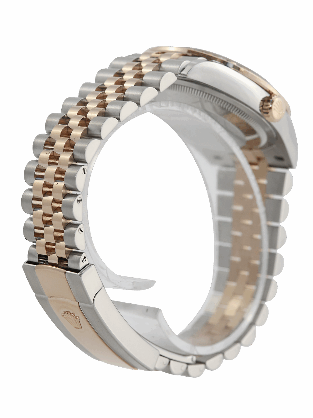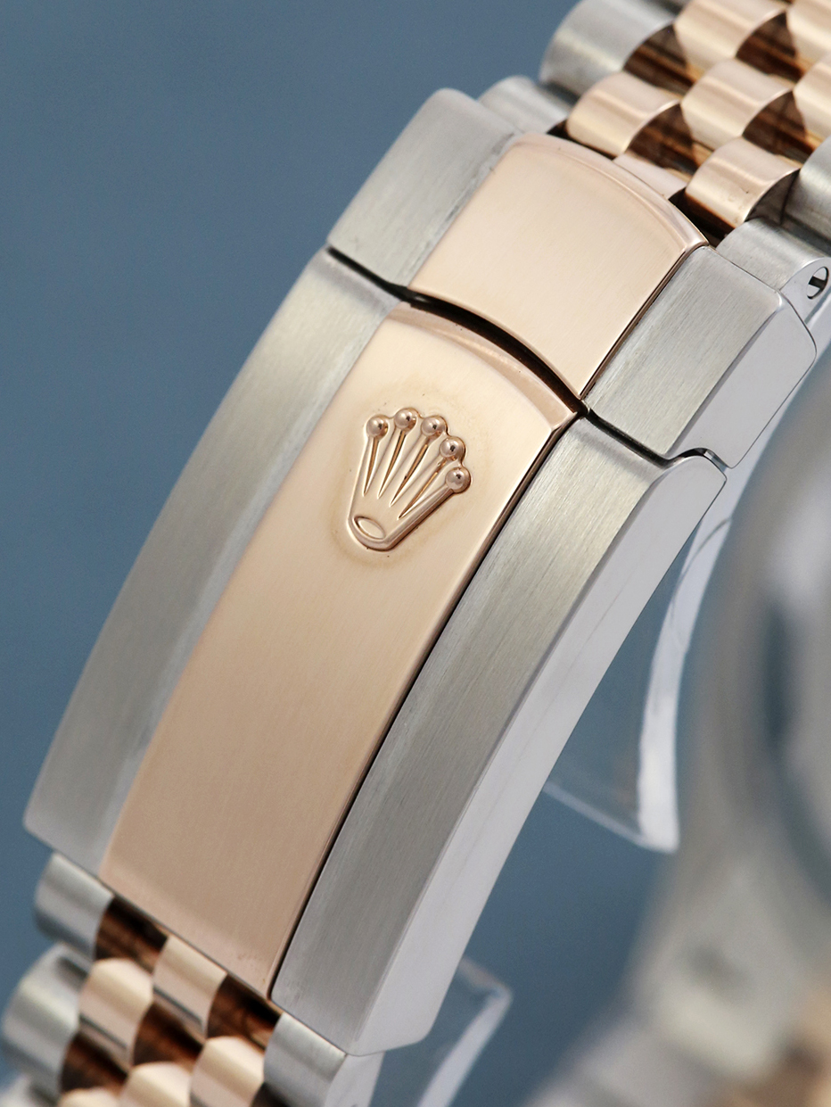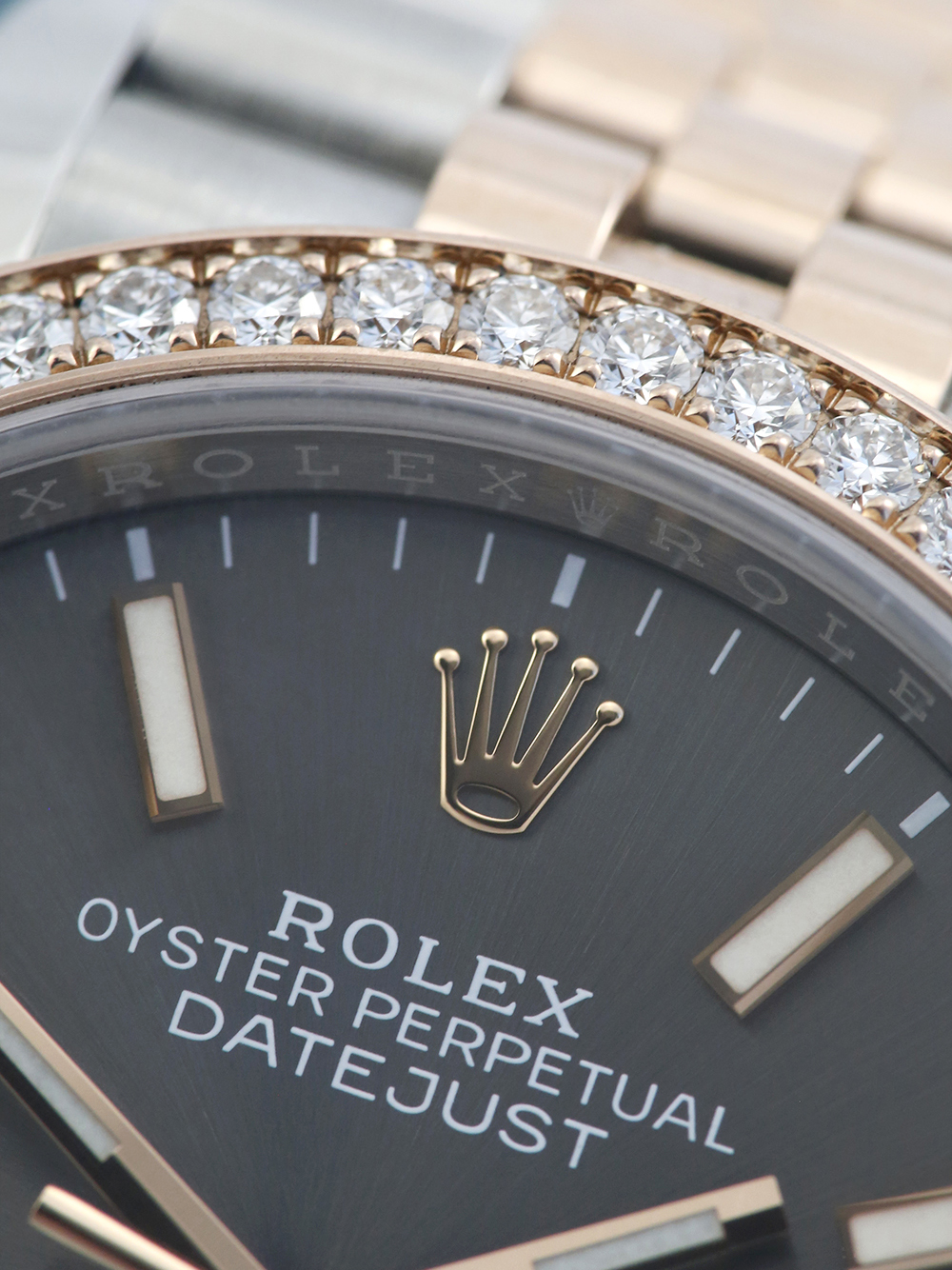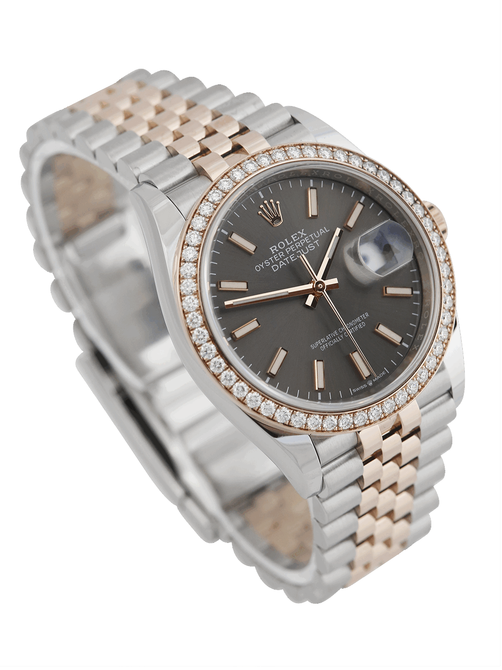 An excellent condition pre-owned stainless steel and rose gold chronometer certified automatic calibre 3235 movement 36mm case size Rolex Datejust model reference 126281RBR featuring a dark Rhodium baton dial housing a date aperture at 3 O’clock surrounded by a rose gold diamond set bezel on a full retail length stainless steel and rose gold Rolex Jubilee bracelet.