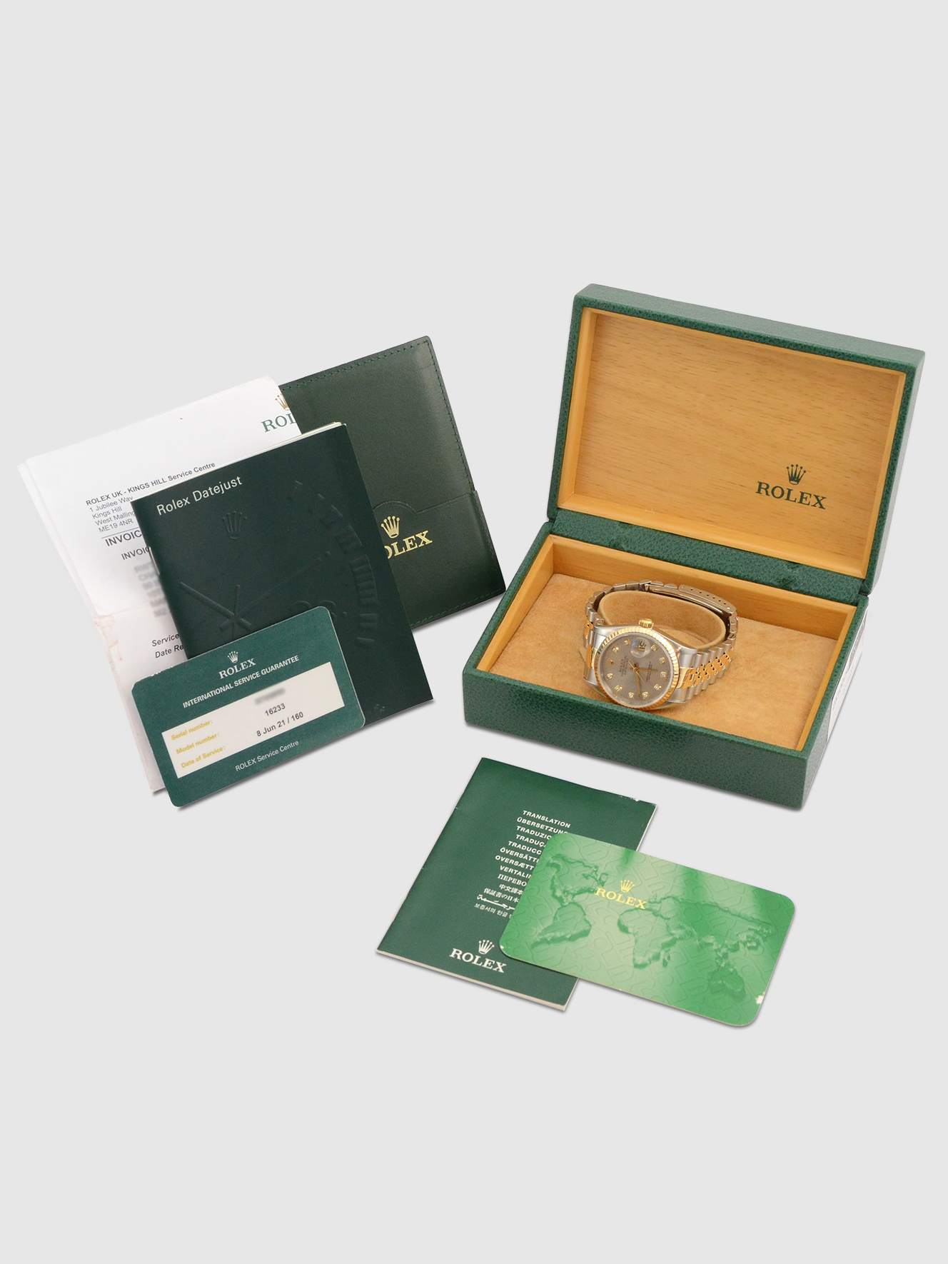 Additional Rolex provenance included is the original Rolex service manual, the original Rolex service invoice, and the original Rolex service warranty card dated June 2021.