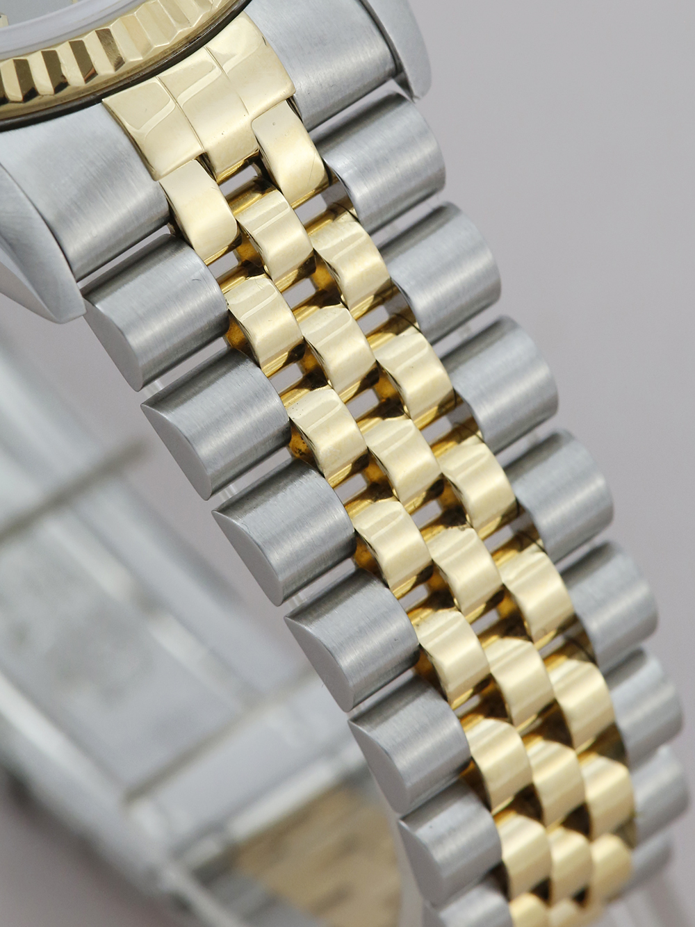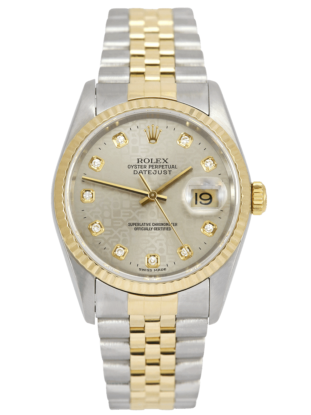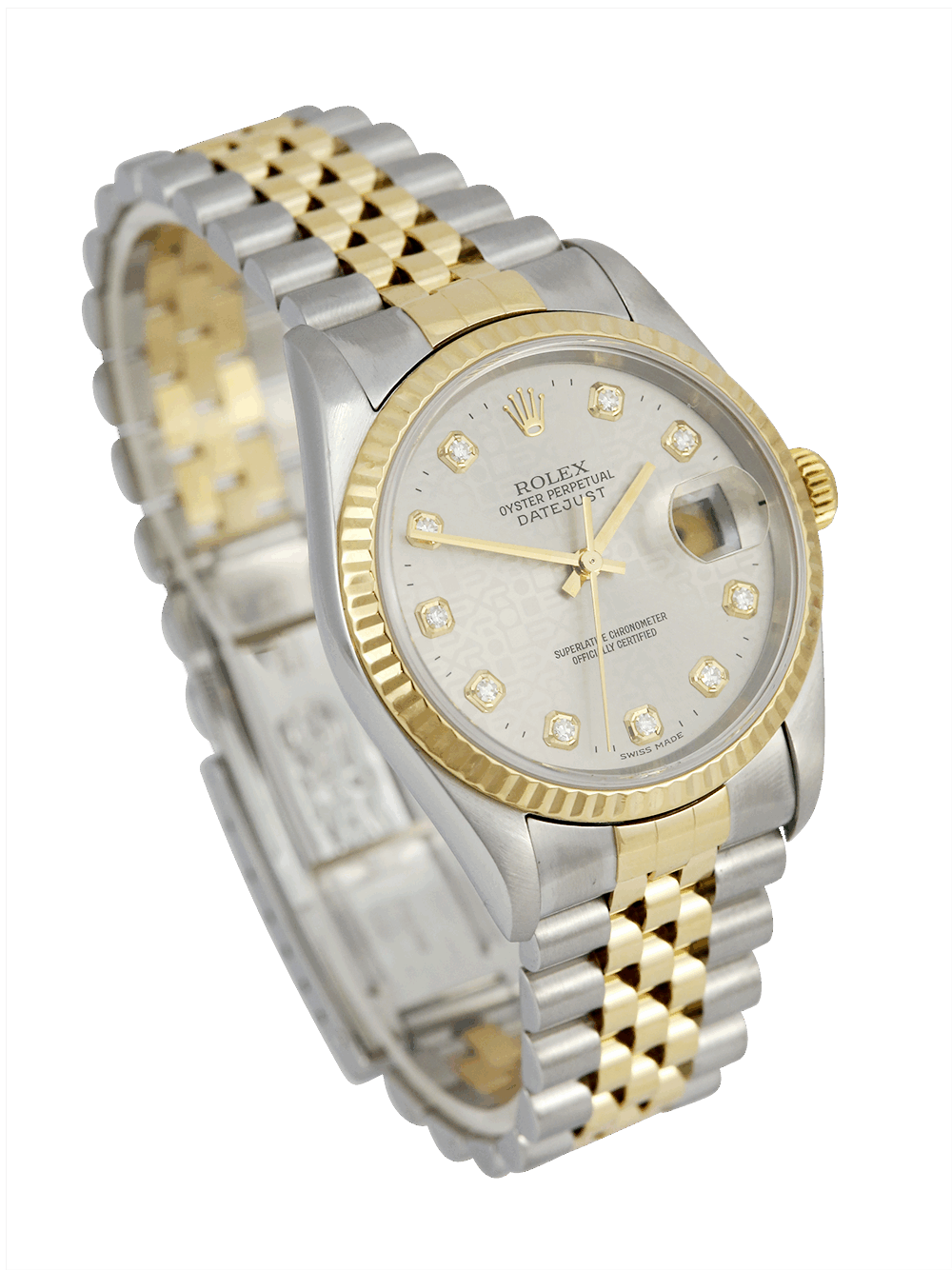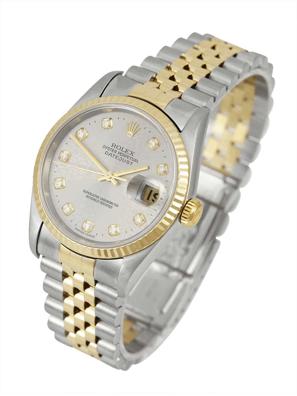 An excellent condition, as near to new as possible, superlative chronometer certified, automatic movement Rolex Datejust, model ref. 16233. Featuring a 36mm bi-metal stainless steel and yellow gold case, housing a stunning grey Jubilee pattern dial with diamond dot hour markers and a date aperture at 3 o’clock. The dial is surrounded by a yellow gold fluted bezel and protected by a sapphire crystal with an external cyclops. Presented on a full retail length stainless steel and yellow gold bi-metal Rolex Jubilee bracelet with an Oysterclasp.