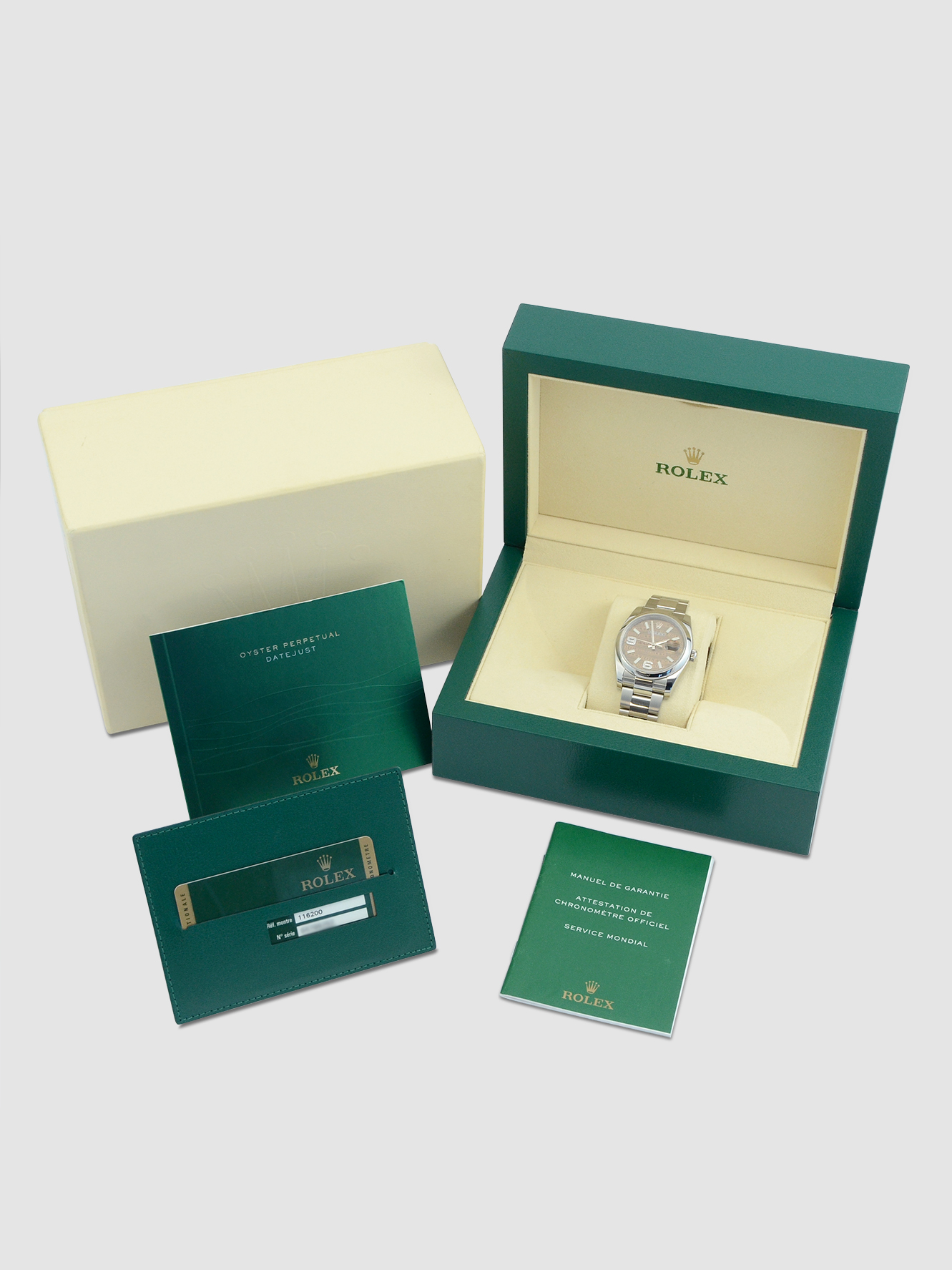 This particular watch is being sold and supplied as shown in the detailed images complete with the outer box sleeve, both the inner and outer Rolex boxes, two booklets, Rolex warranty card holder and the Rolex warranty card. The card is date stamped August 2013 when first supplied new in Germany.