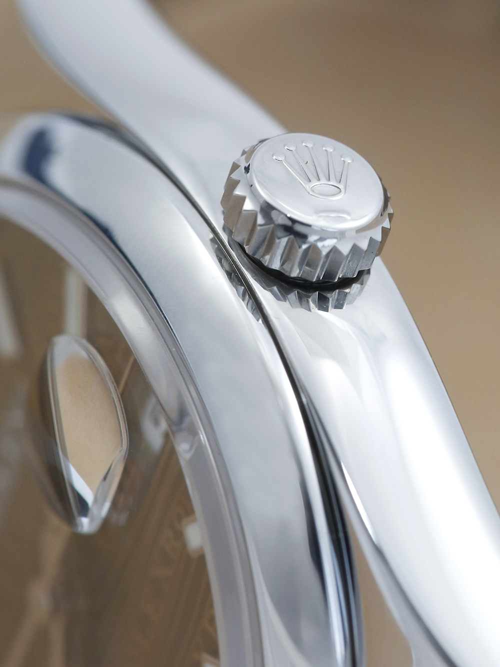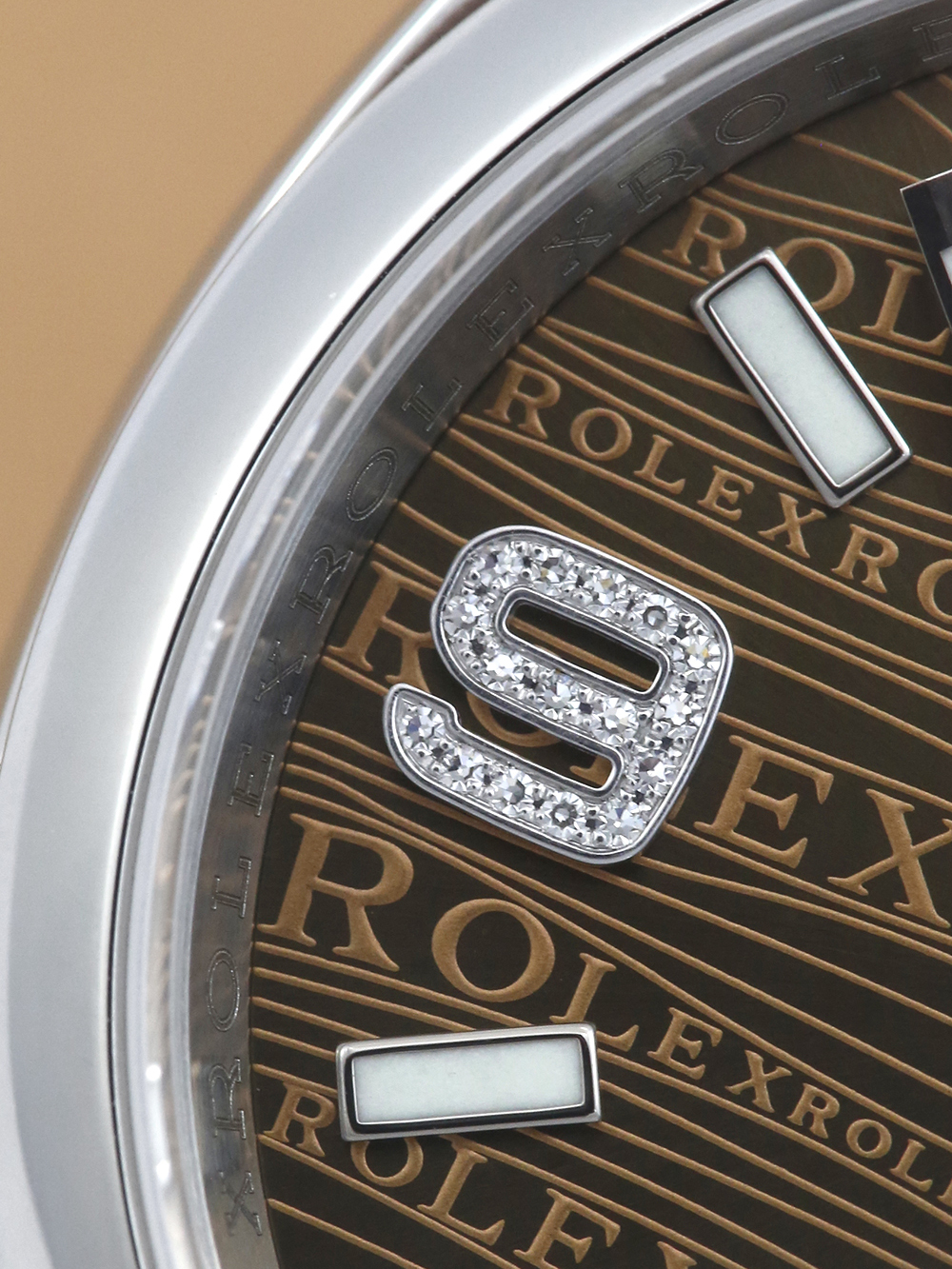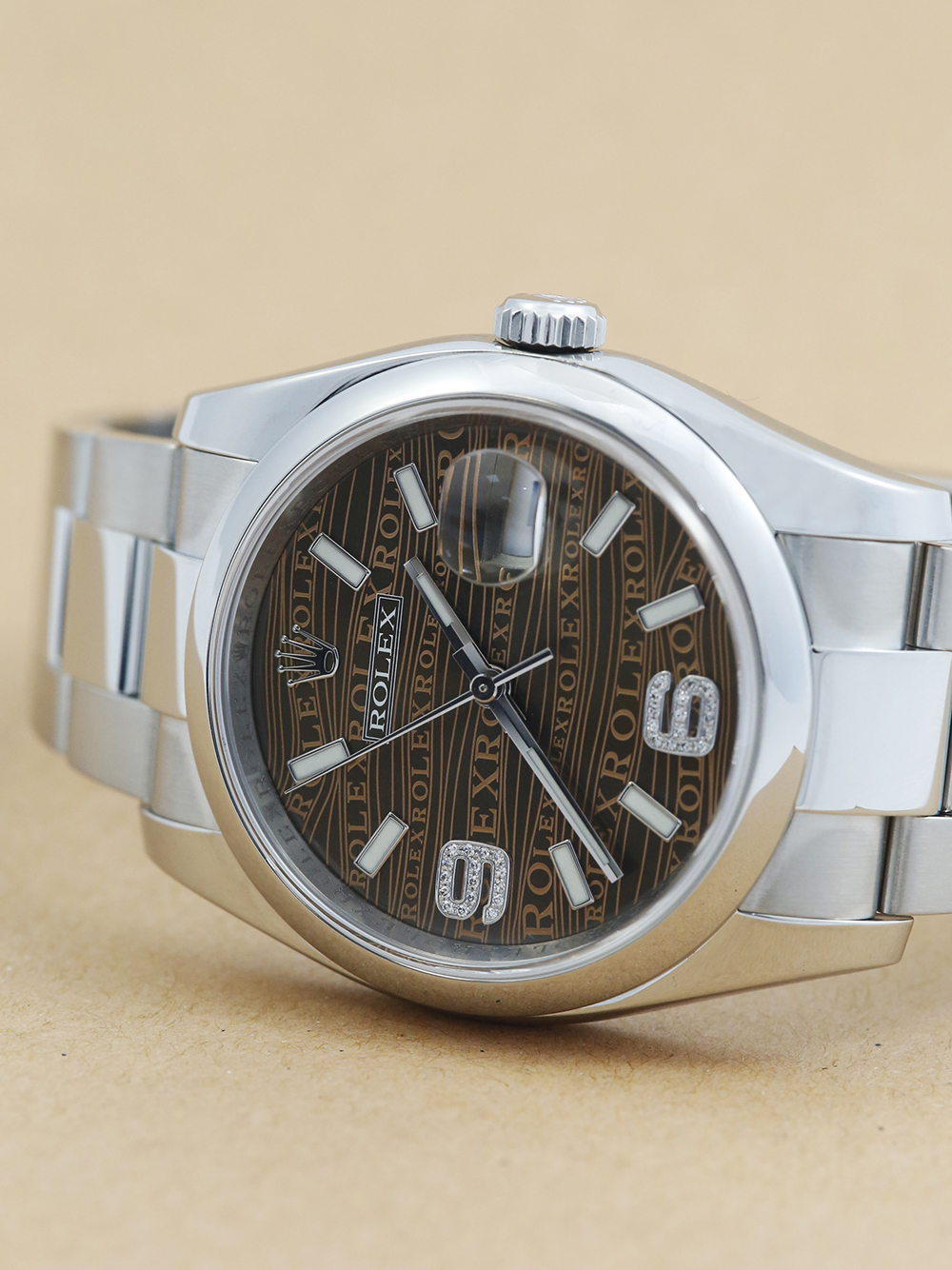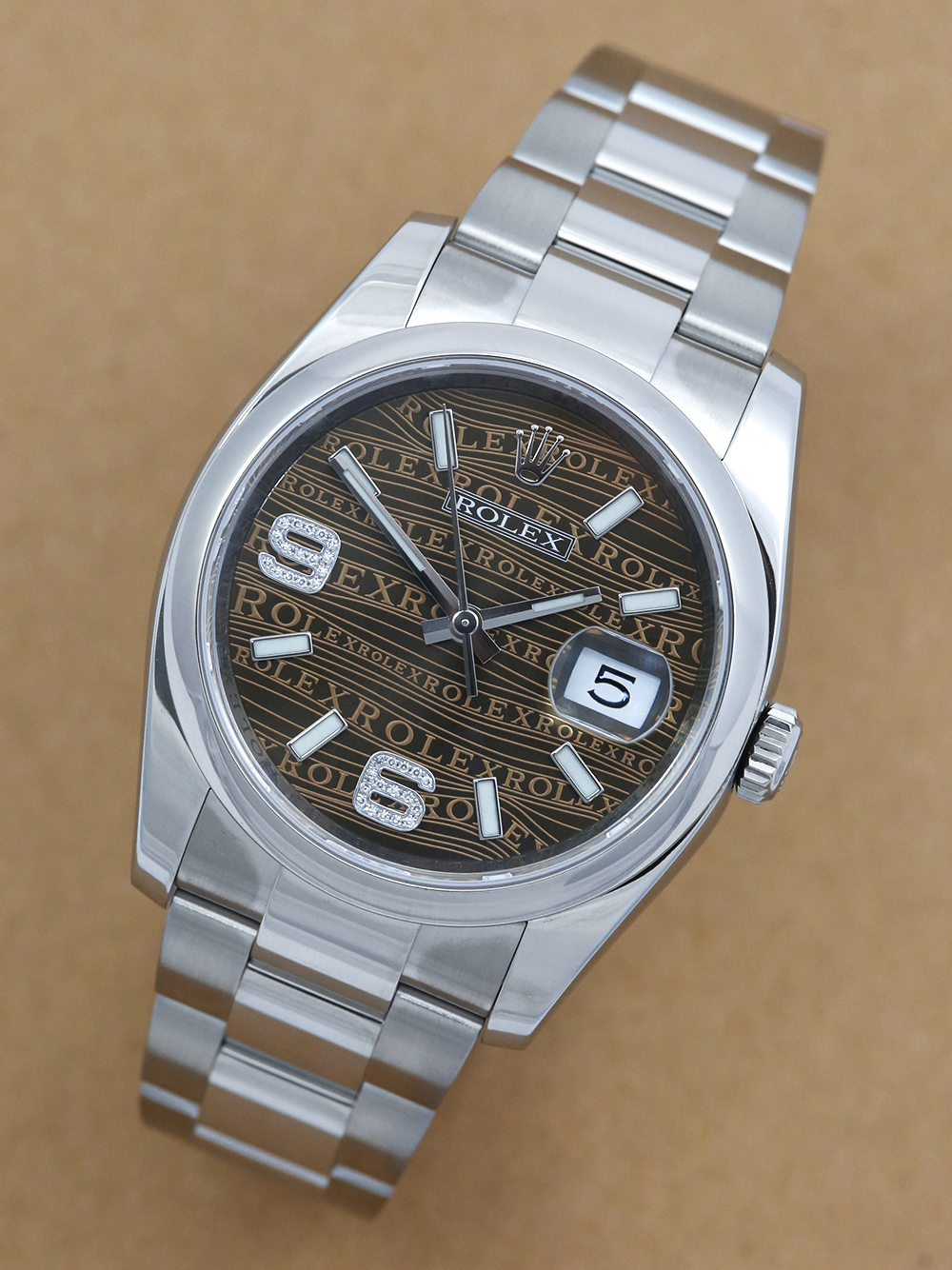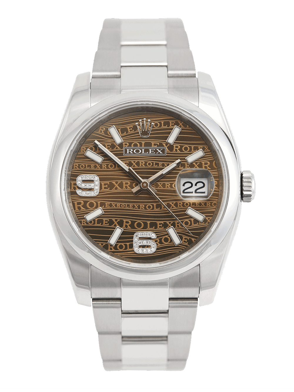 A previously owned, in excellent condition, superlative chronometer certified, automatic movement Rolex Datejust, model reference 116200. Featuring a 36mm stainless steel case, housing a unique bronze wave Jubilee dial with luminous indexes and 32 diamonds at numerals 6 and 9, as well as a aperture at 3 o’clock with an external cyclops. The dial is surrounded by a polished finish stainless steel domed bezel. Presented on a full retail length stainless steel Rolex Oyster bracelet with an Oysterclasp folding closure.