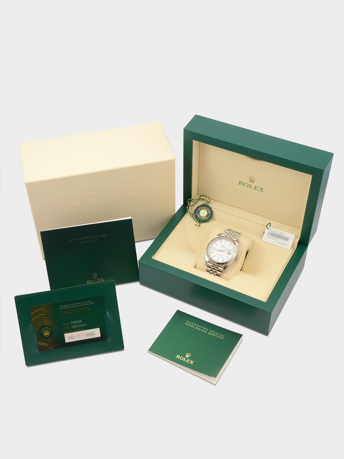 This particular watch is supplied as shown in the detailed images with both of the original Rolex inner and outer boxes, the two original Rolex booklets, two original Rolex swing tags, the original Rolex warranty card holder and the original Rolex warranty card which is dated November 2023 when the watch was first sold new by the UK based authorised dealer.