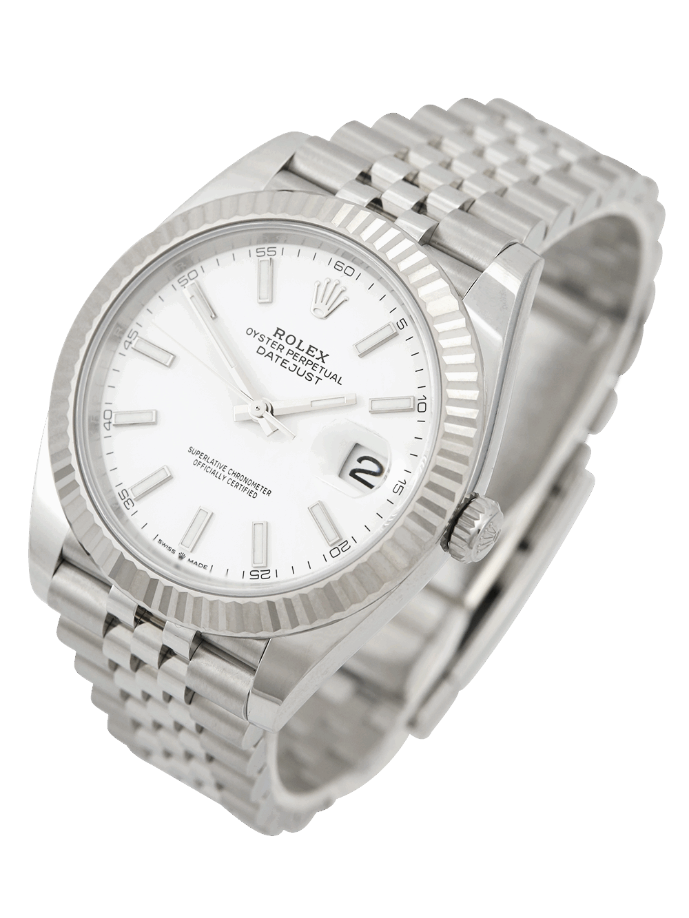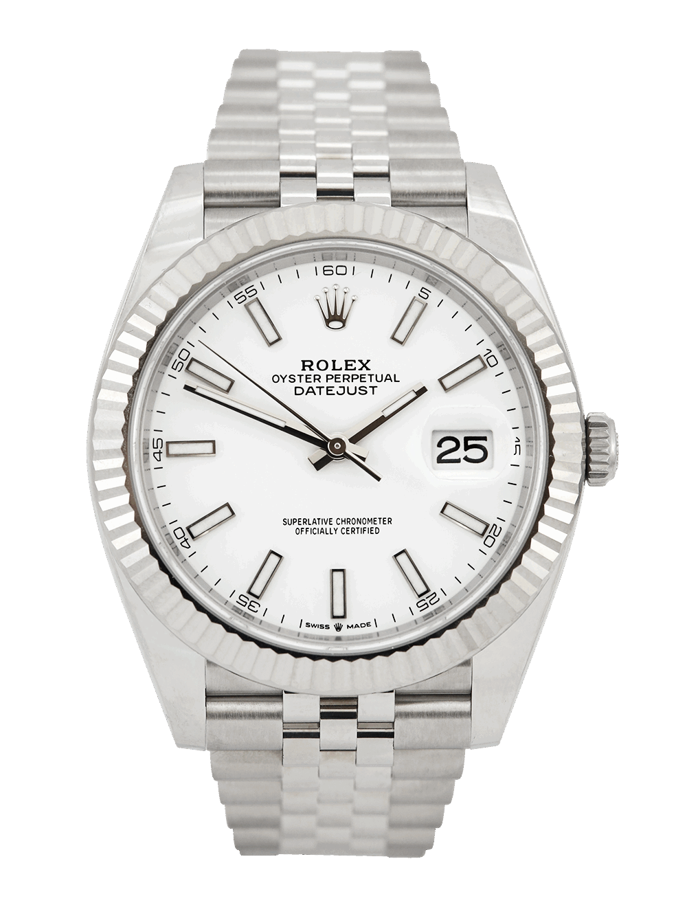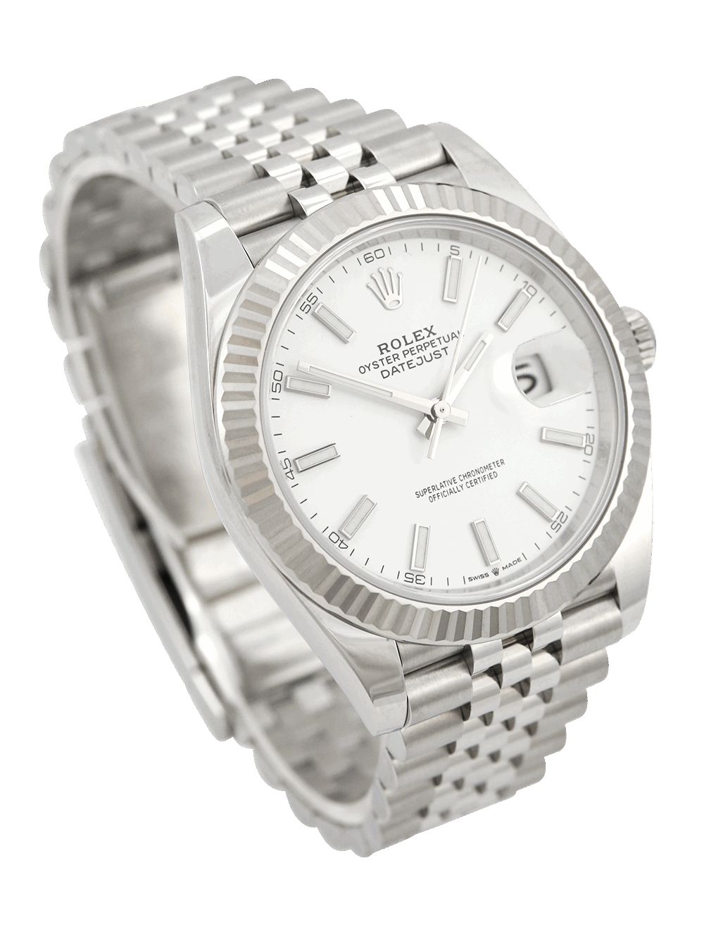 A brand new unworn and unsized, chronometer certified, automatic movement Rolex Datejust 41 model reference 126334. Featuring a 41mm stainless steel case, housing a white baton dial with a date aperture at 3 o’clock and an external cyclops. The dial is surrounded by a white gold fluted bezel. Presented on a full retail length stainless steel Rolex Jubilee bracelet fitted with an Oysterclasp.