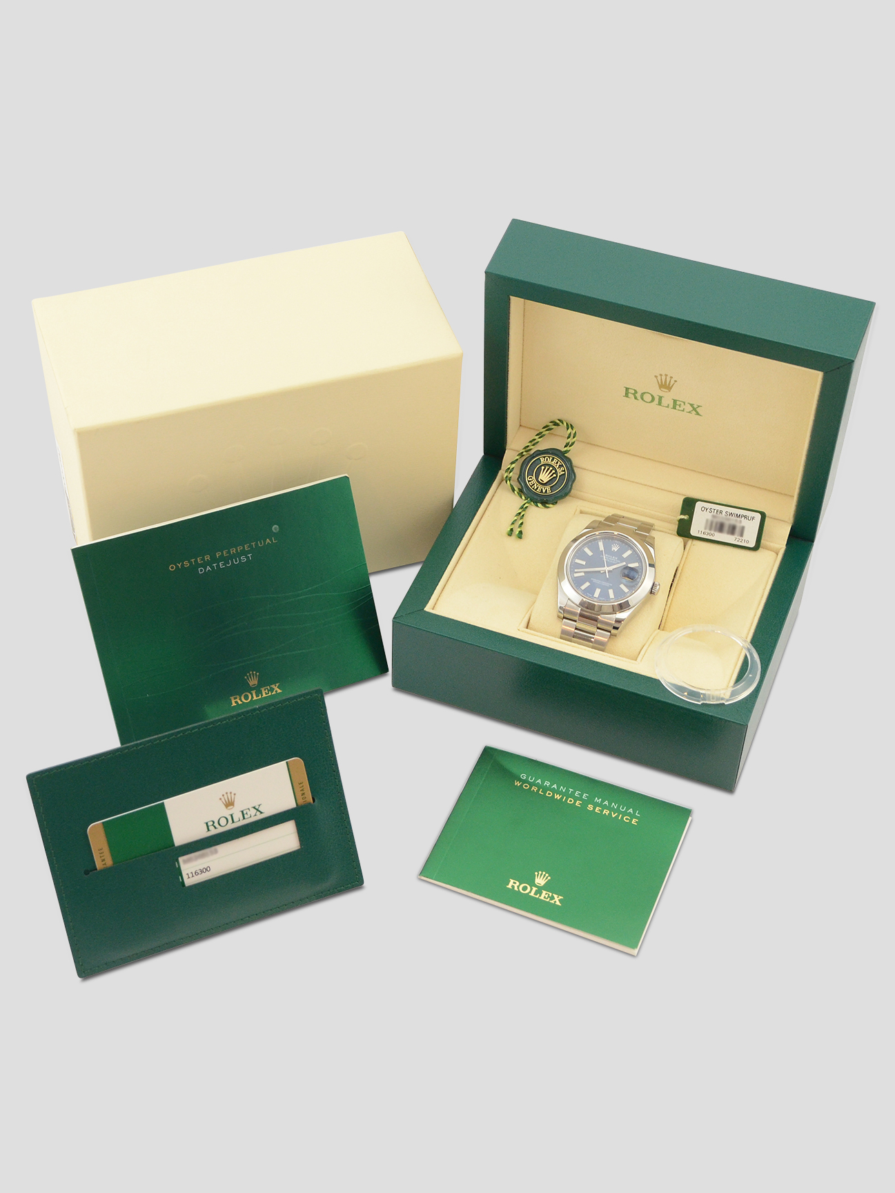 This particular watch is supplied as shown in the detailed images with both of the original inner and outer Rolex boxes, the original Rolex bezel protector, the two original Rolex manuals, the two original Rolex swing tags, the original Rolex warranty card holder and the original Rolex warranty card. The card is dated November 2015 when the watch was first purchased new from the UK based authorised dealer.