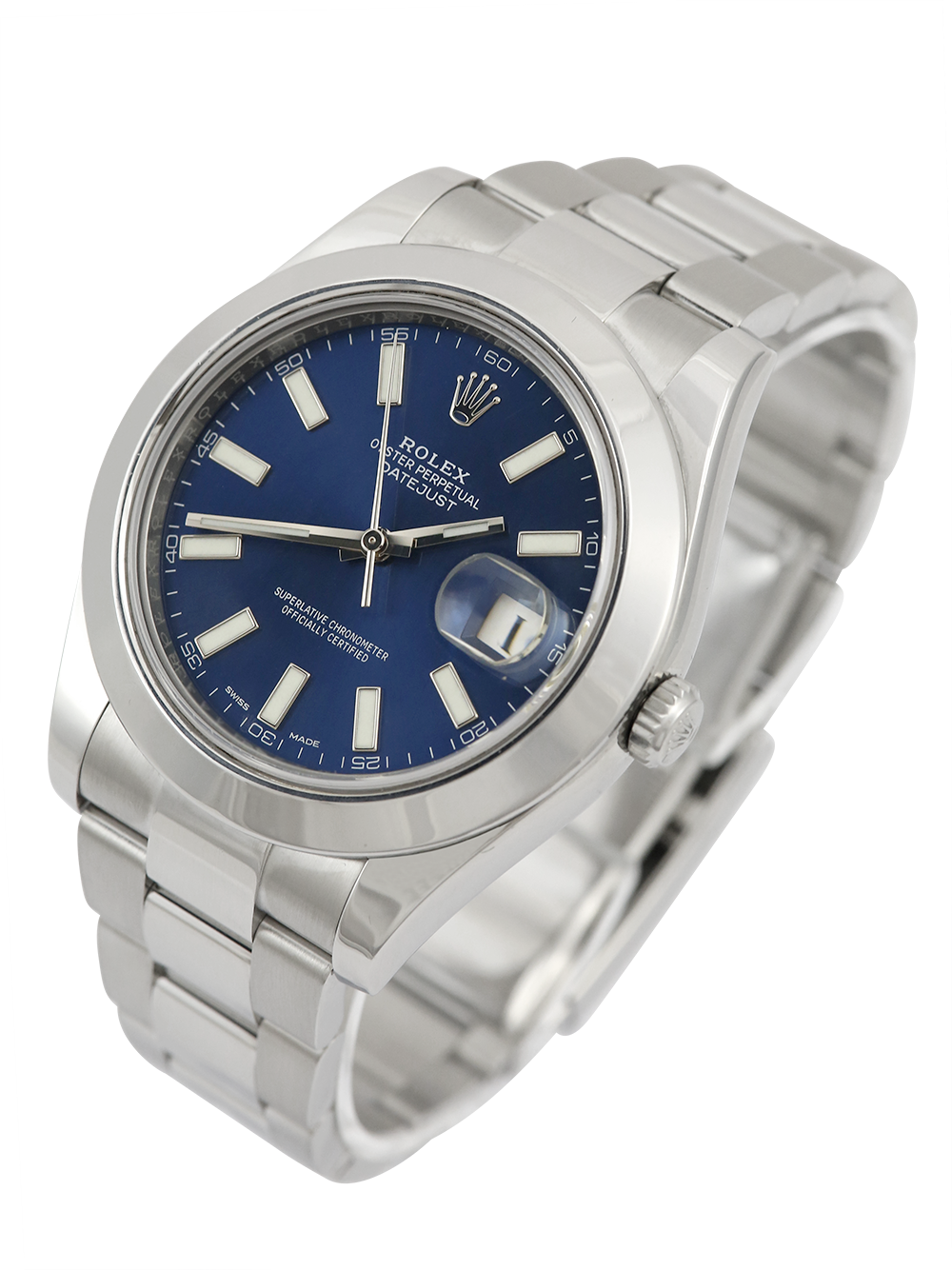 A pre-owned in excellent condition stainless steel 41mm case size chronometer certified automatic movement Rolex Datejust II model reference 116300 featuring a blue baton dial housing a date aperture at 3 o’clock surrounded by a stainless steel domed bezel on a full retail length stainless steel Rolex Oyster bracelet.