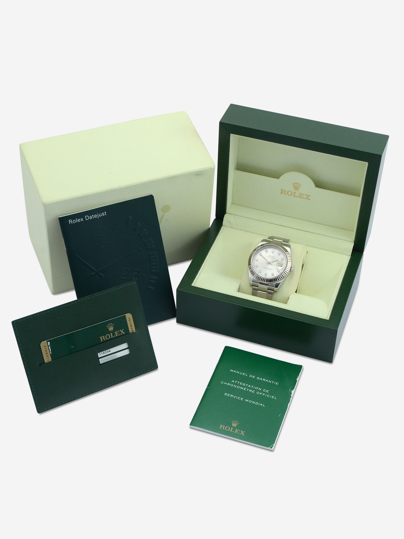 This particular watch is supplied as shown in the detailed images with both of the original inner and outer Rolex boxes, the two original Rolex booklets, the original Rolex warranty card holder and the original Rolex warranty card dated May 2013 when first supplied new.